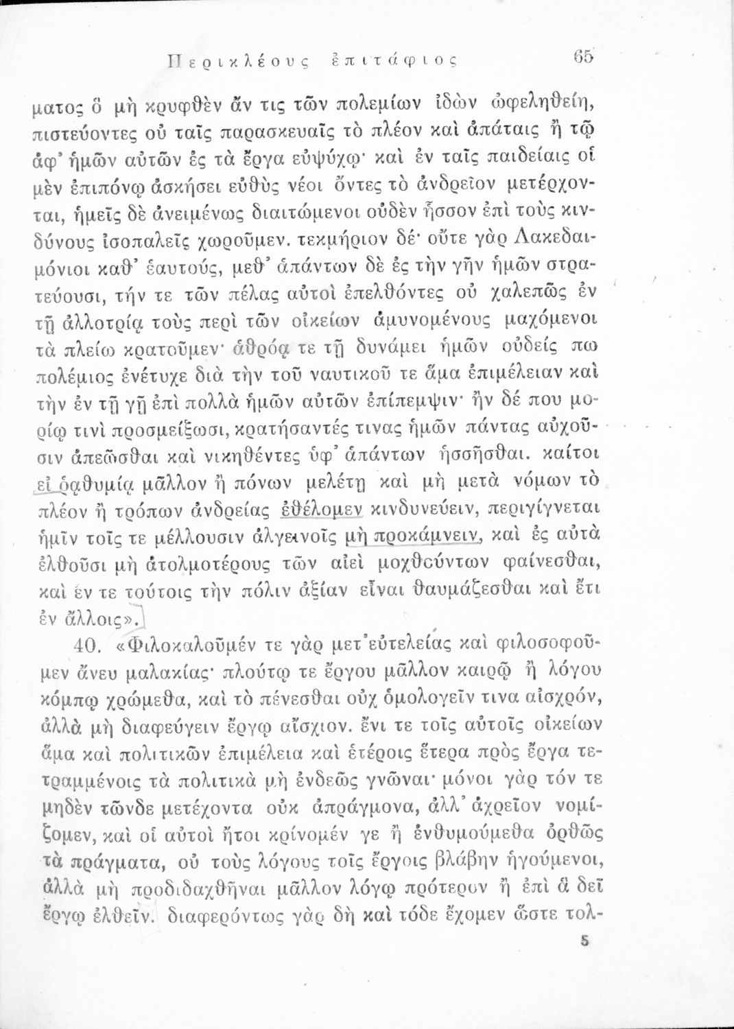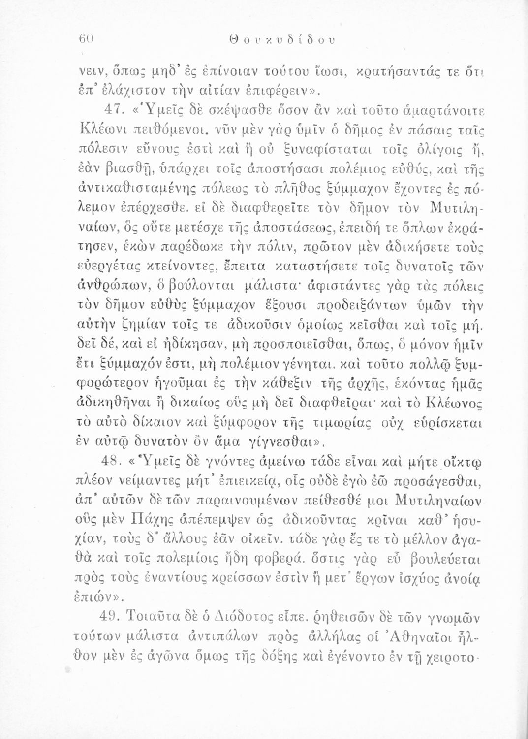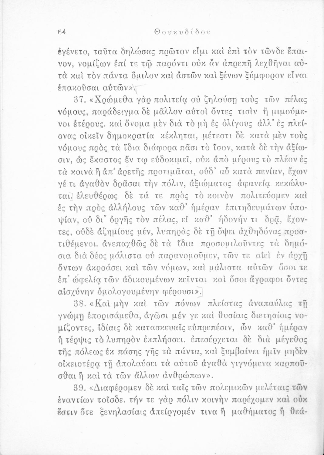 Σχολικό εγχειρίδιο Αρχαίων Ελληνικών Γυμνασίου που περιέχει εισαγωγή στη ζωή και το έργο του Θουκυδίδη, αποσπάσματα από τα Πλαταιϊκά, τα Λεσβιακά και τον Επιτάφιο του Περικλή και ερμηνευτικές σημειώσεις.