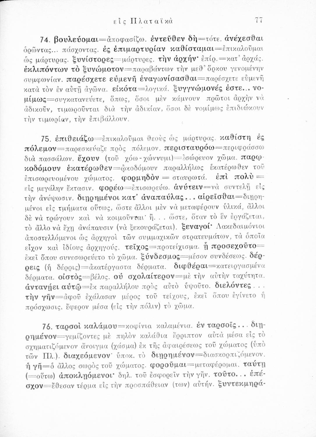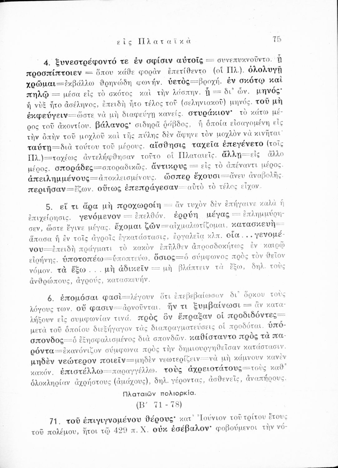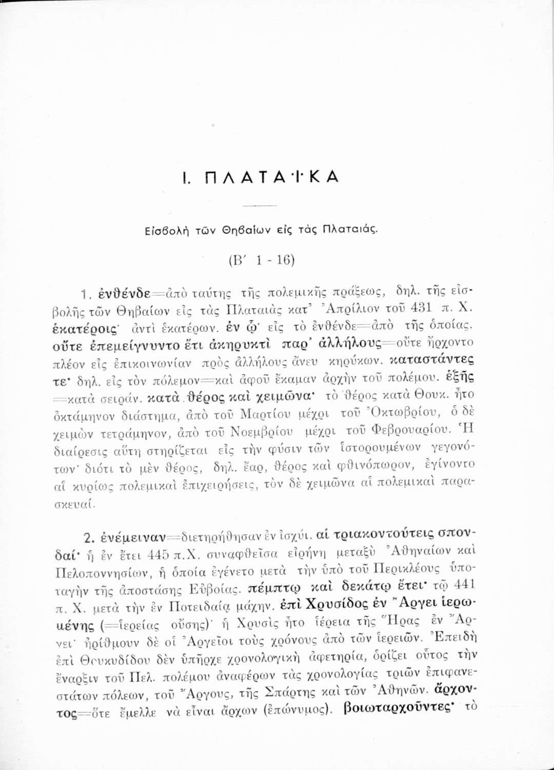 Σχολικό εγχειρίδιο Αρχαίων Ελληνικών για τις Δ΄, Ε΄ και ΣΤ΄ Γυμνασίου παλαιού τύπου που περιλαμβάνει σύντομο βιογραφικό σημείωμα του Θουκυδίδη, περιγραφή του ιστορικού πλαισίου, αποσπάσματα από τα Πλαταϊκά, τα