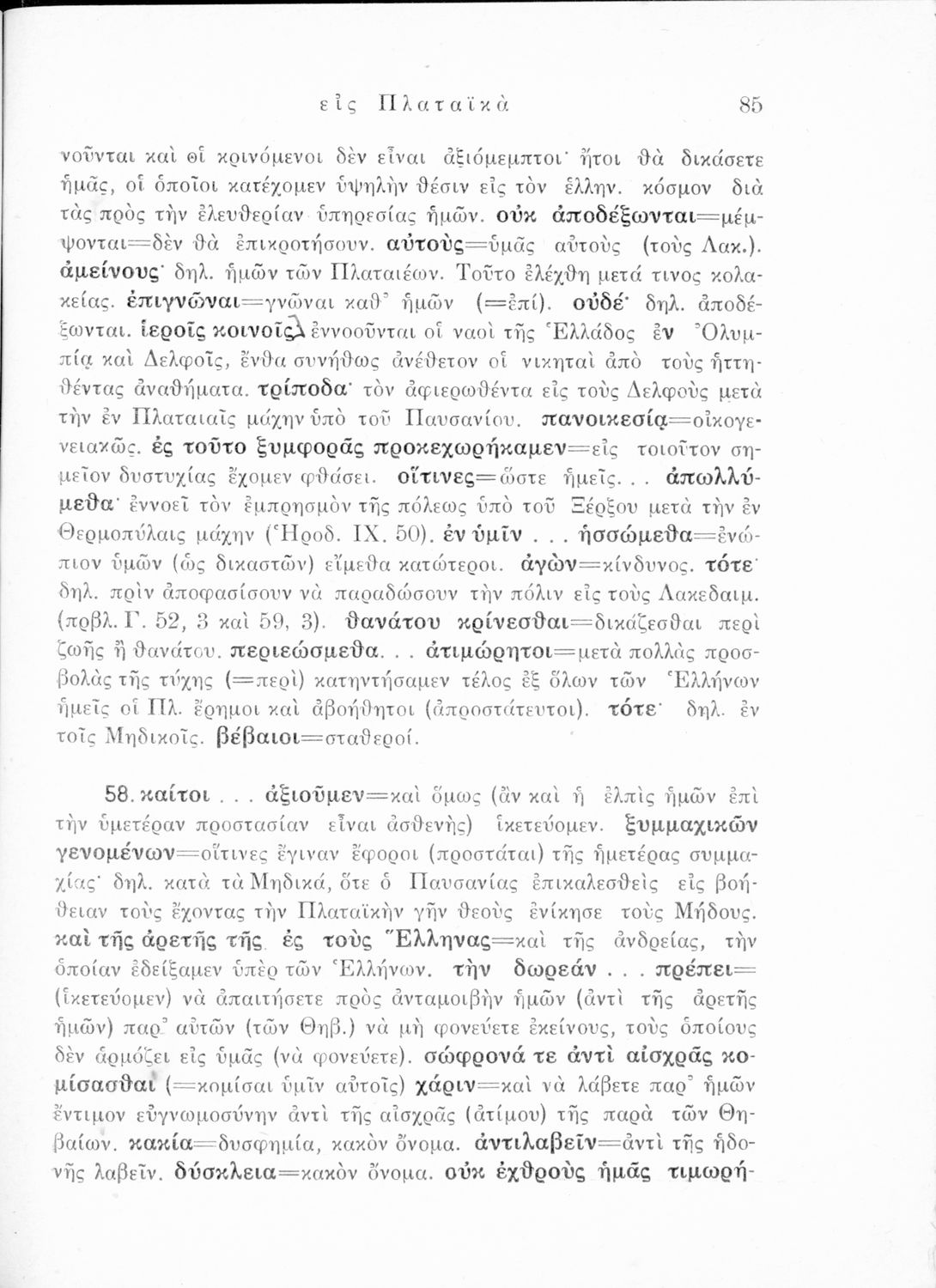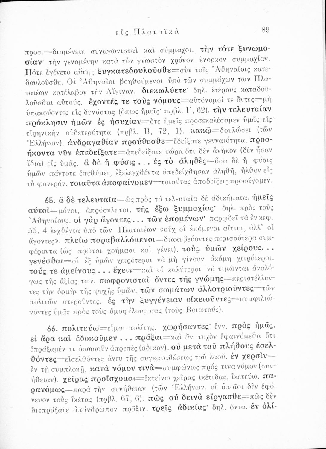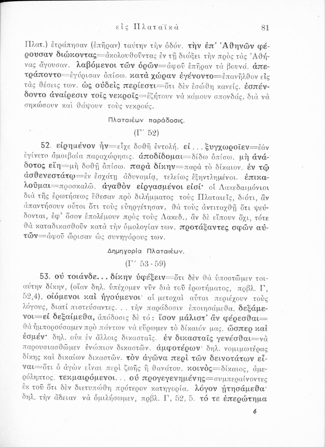 Σχολικό εγχειρίδιο Αρχαίων Ελληνικών για τις Δ΄, Ε΄ και ΣΤ΄ Γυμνασίου παλαιού τύπου που περιλαμβάνει σύντομο βιογραφικό σημείωμα του Θουκυδίδη, περιγραφή του ιστορικού πλαισίου, αποσπάσματα από τα Πλαταϊκά, τα