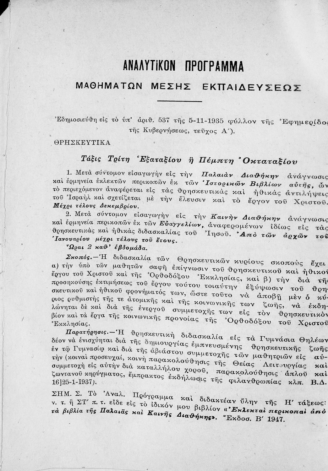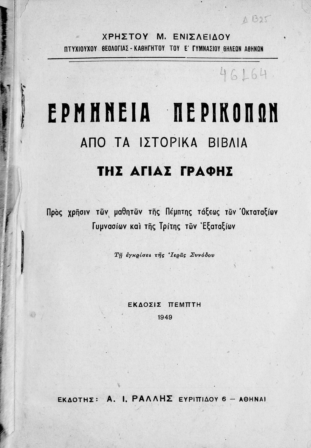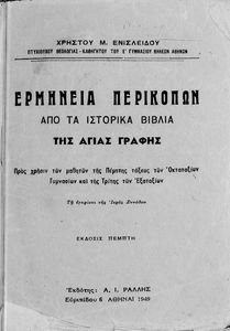 Τίτλος: Ερμηνεία Περικοπών από τα ιστορικά βιβλία της Αγίας Γραφής (Παλαιάς και Καινής), προς χρήσιν των μαθητών της Πέμπτης τάξεως των Οκταταξίων Γυμνασίων και της Τρίτης των Εξαταξίων