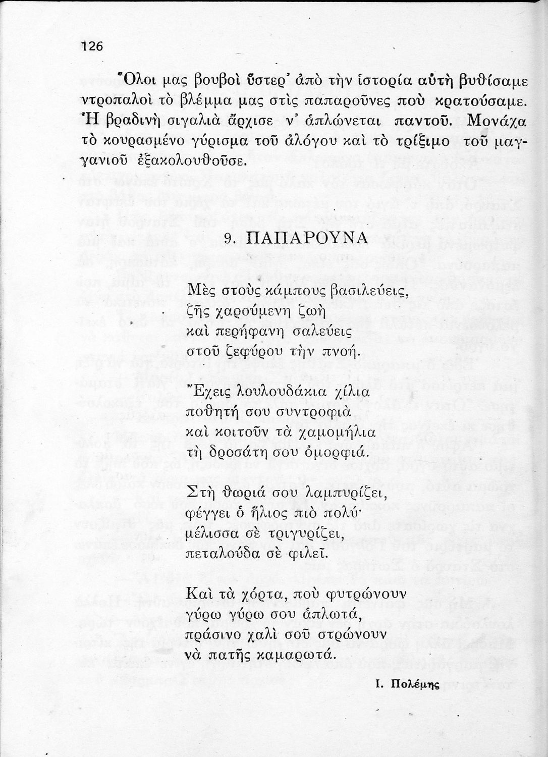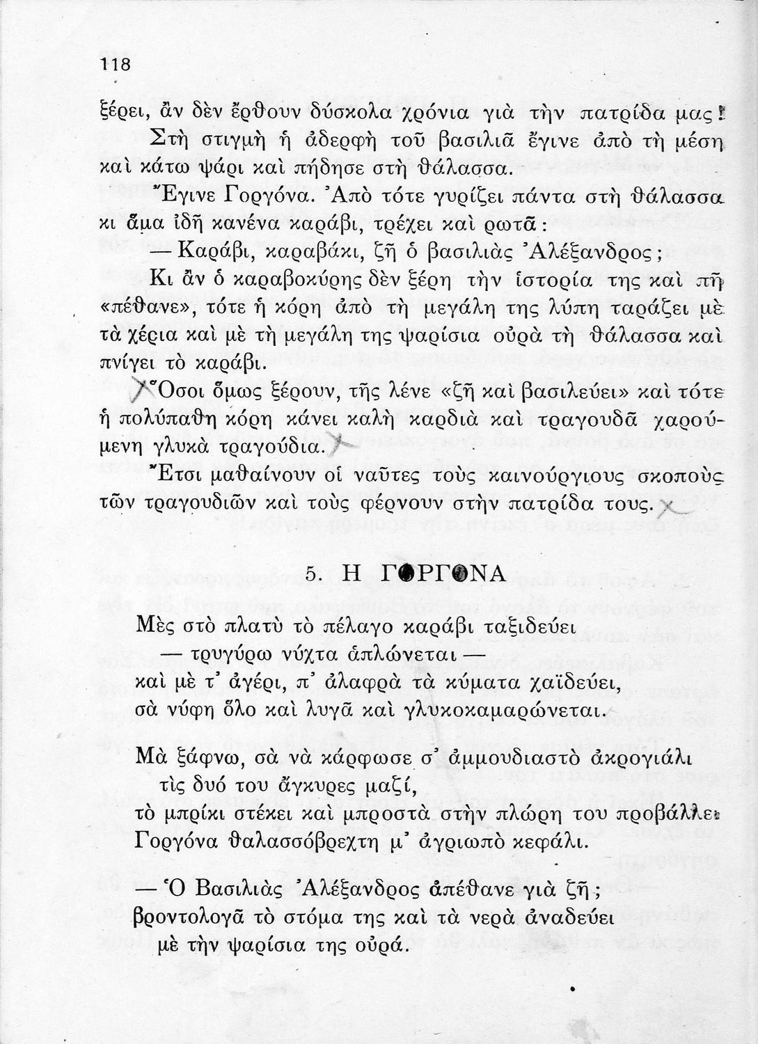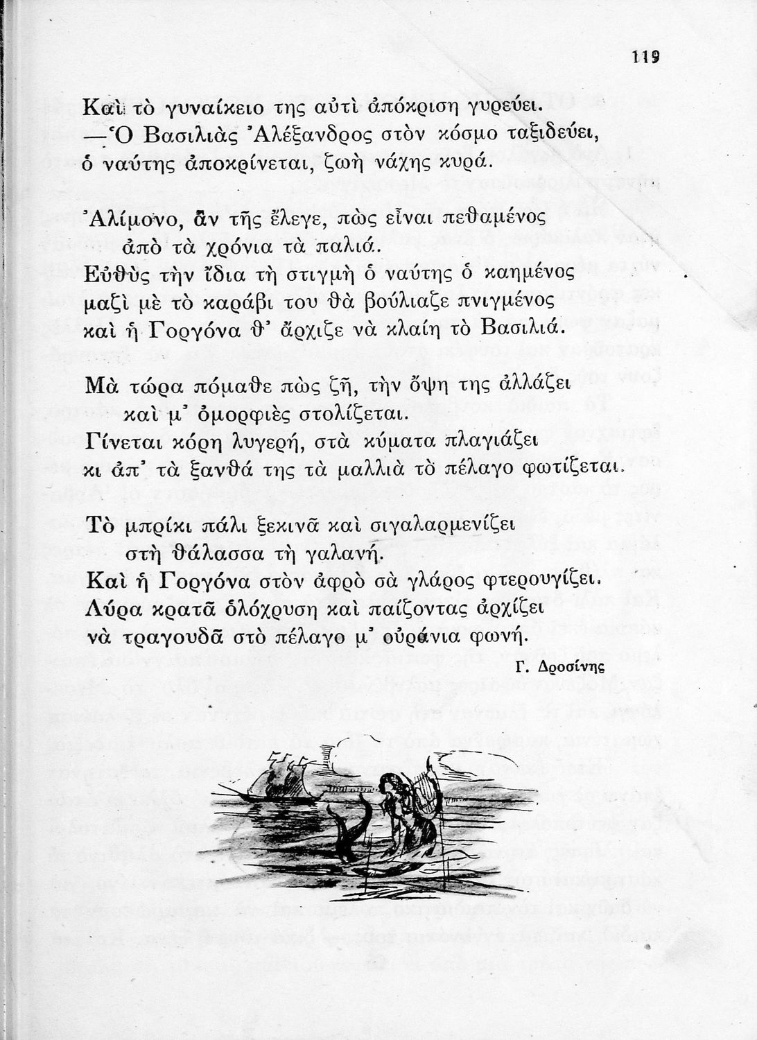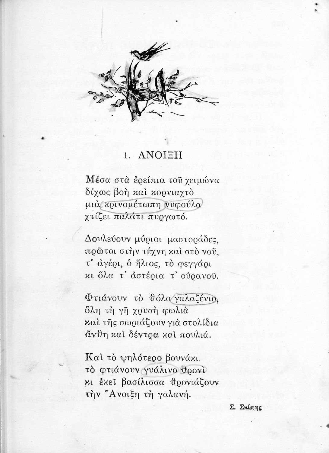 Αναγνωστικό για την Δ΄ τάξη του Δημοτικού. Περιλαμβάνει ένα κείμενο στο οποίο παρεμβάλλονται ποιήματα δημοτικά και Ελλήνων ποιητών.
