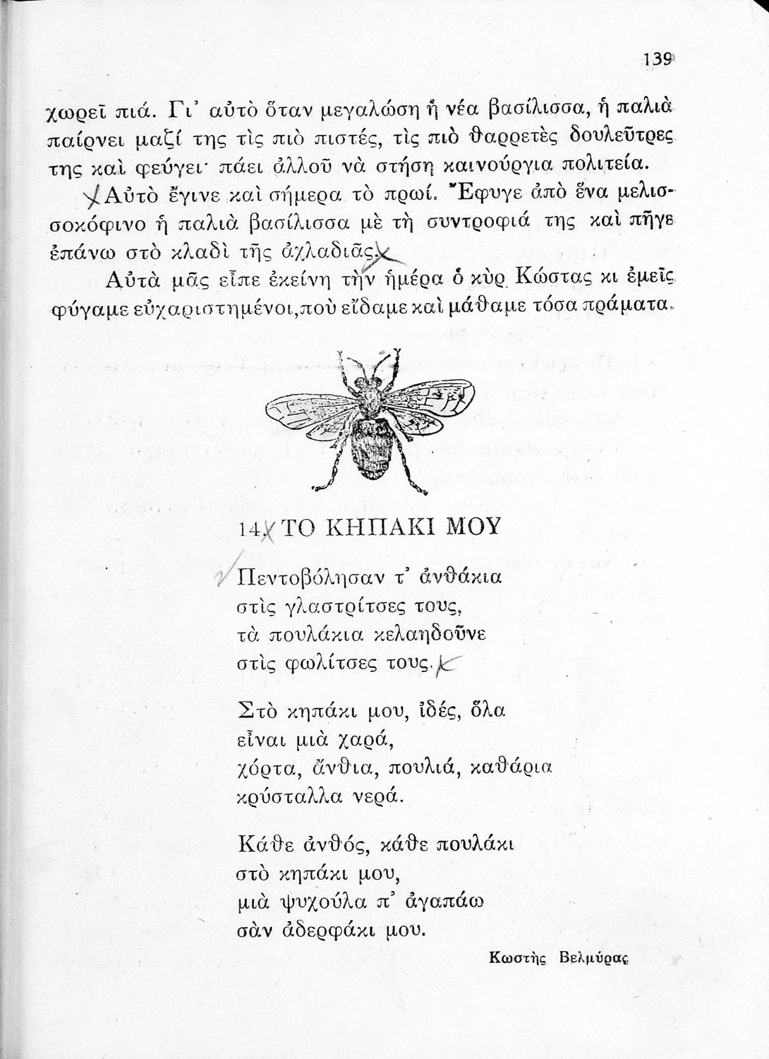 Αναγνωστικό για την Δ΄ τάξη του Δημοτικού. Περιλαμβάνει ένα κείμενο στο οποίο παρεμβάλλονται ποιήματα δημοτικά και Ελλήνων ποιητών.