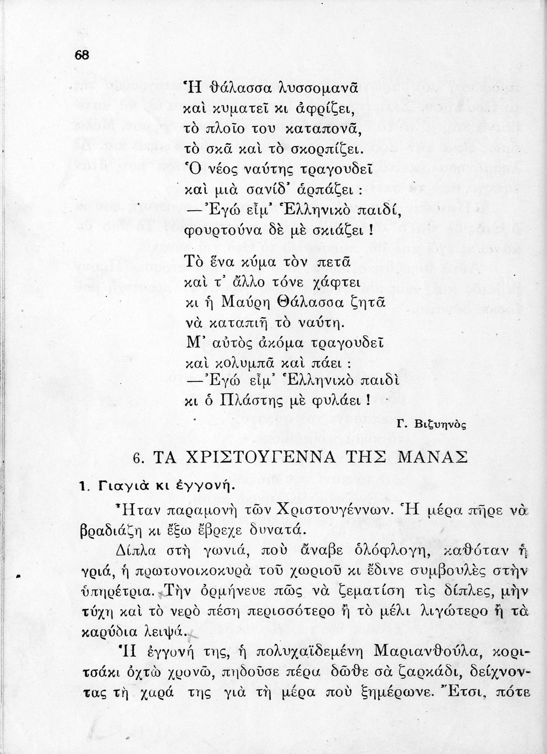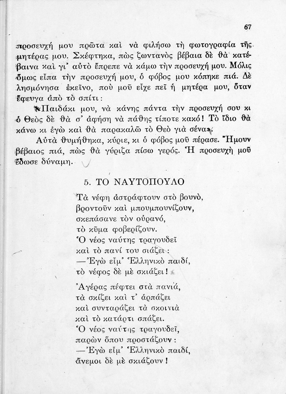 Αναγνωστικό για την Δ΄ τάξη του Δημοτικού. Περιλαμβάνει ένα κείμενο στο οποίο παρεμβάλλονται ποιήματα δημοτικά και Ελλήνων ποιητών.
