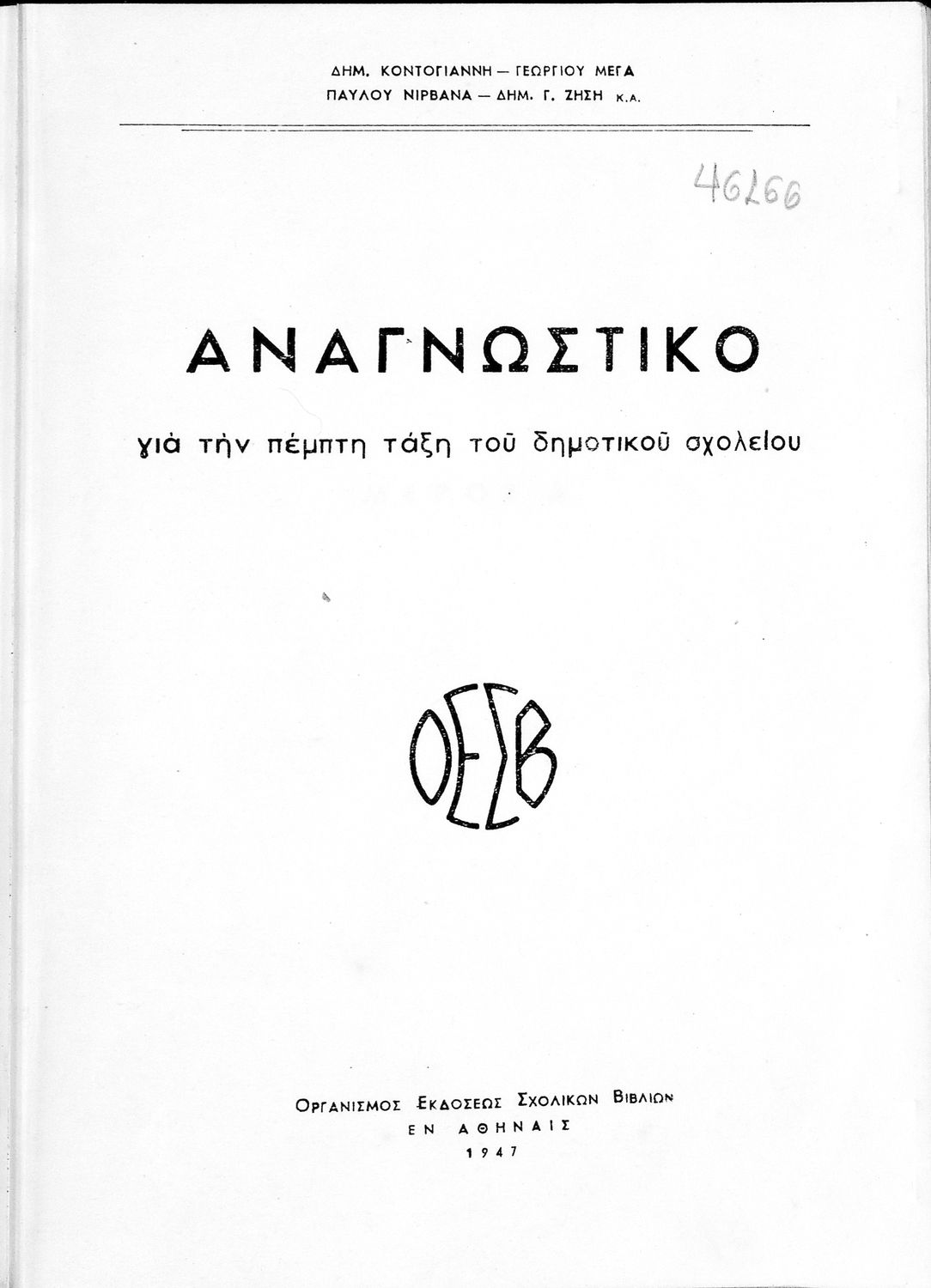 Εκδότης: Οργανισμός Εκδόσεως Σχολικών Βιβλίων Έτος έκδοσης: 1947 Τόπος έκδοσης: Αθήνα |