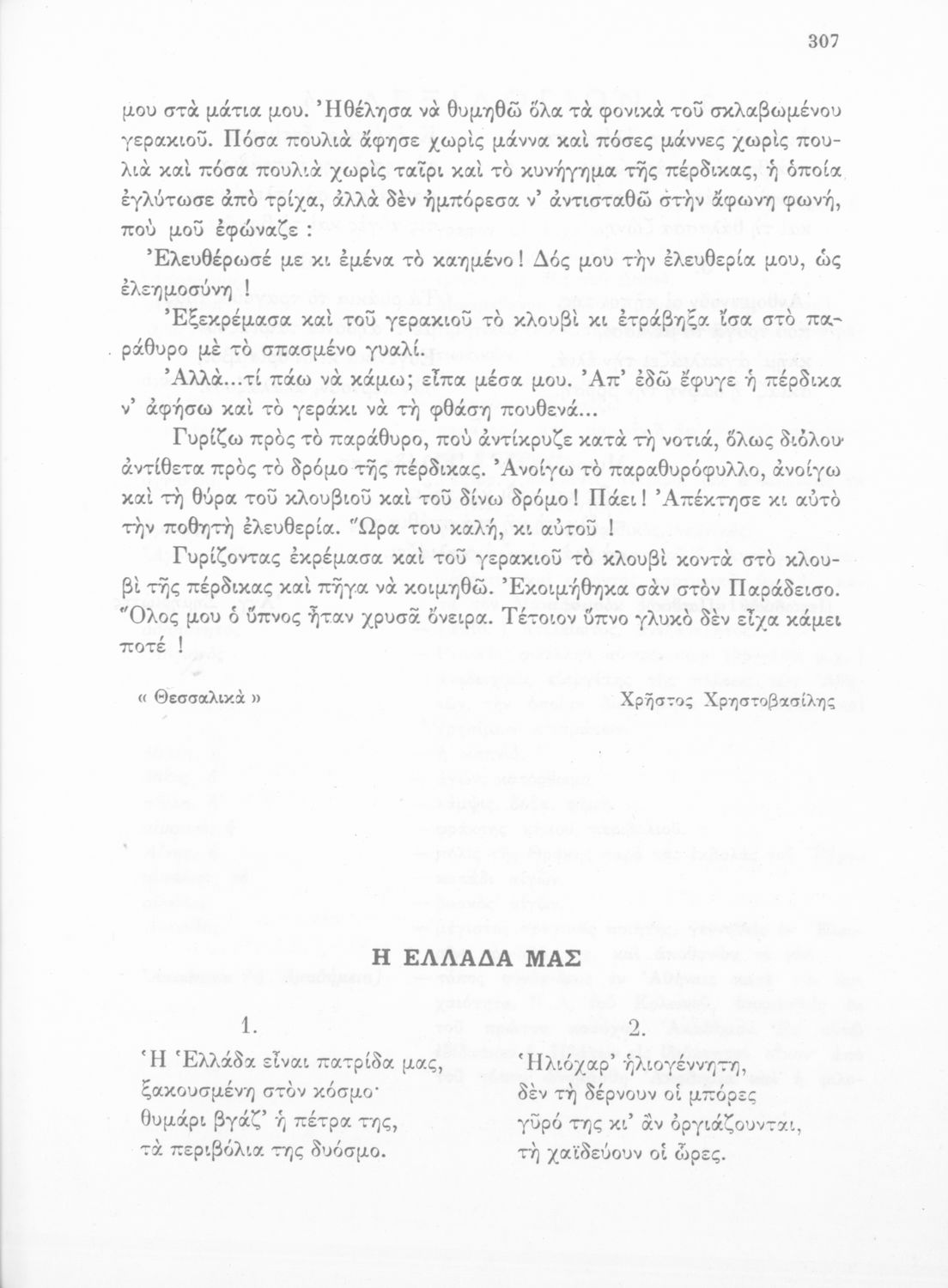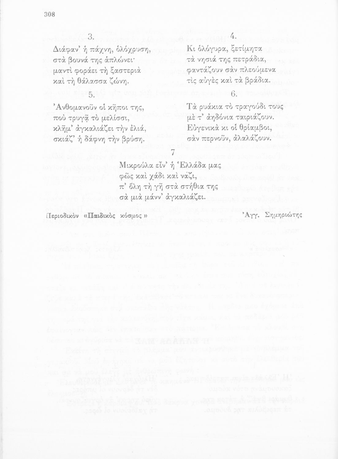 Σχολικό εγχειρίδιο Νέων Ελληνικών Γ΄ Γυμνασίου που περιέχει ποιήματα και πεζά Ελλήνων συγγραφέων εμπνευσμένα από τη θρησκευτική, οικογενειακή και κοινωνική ζωή, την σύγχρονή ελληνική ιστορία και την ελληνική φύση. Περιέχει παράρτημα με βιογραφίες των συγγραφέων και λεξιλόγιο.