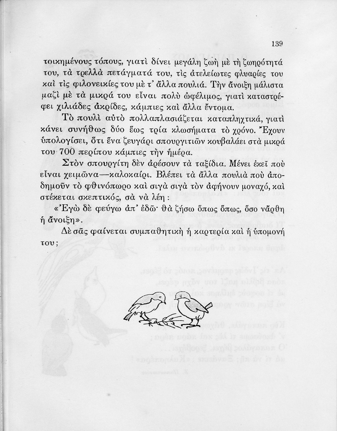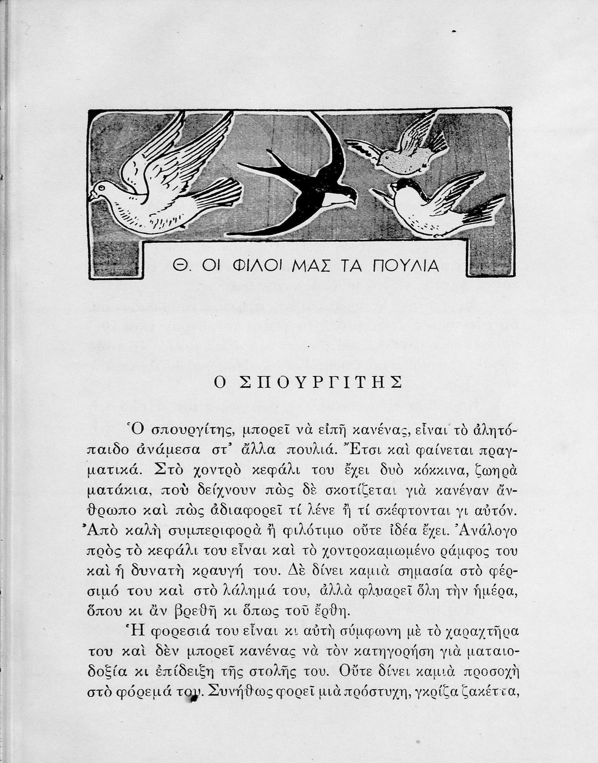 Αναγνωστικό Δ΄ Δημοτικού που περιέχει πεζά και ποιήματα με περιεχόμενο διδακτικό και ηθικοπλαστικό εμπνευσμένα από την ελληνική ιστορία και μυθολογία, και την αγροτική και κοινωνική ζωή.