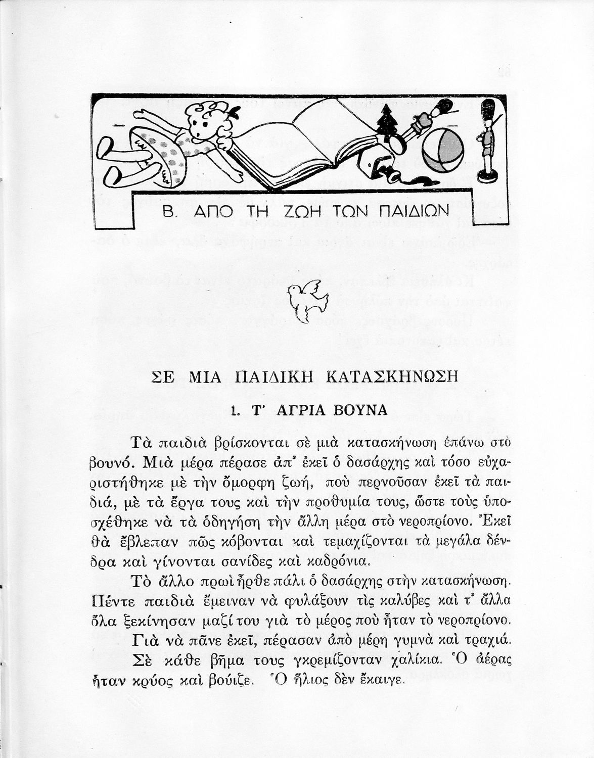 Αναγνωστικό Δ΄ Δημοτικού που περιέχει πεζά και ποιήματα με περιεχόμενο διδακτικό και ηθικοπλαστικό εμπνευσμένα από την ελληνική ιστορία και μυθολογία, και την αγροτική και κοινωνική ζωή.