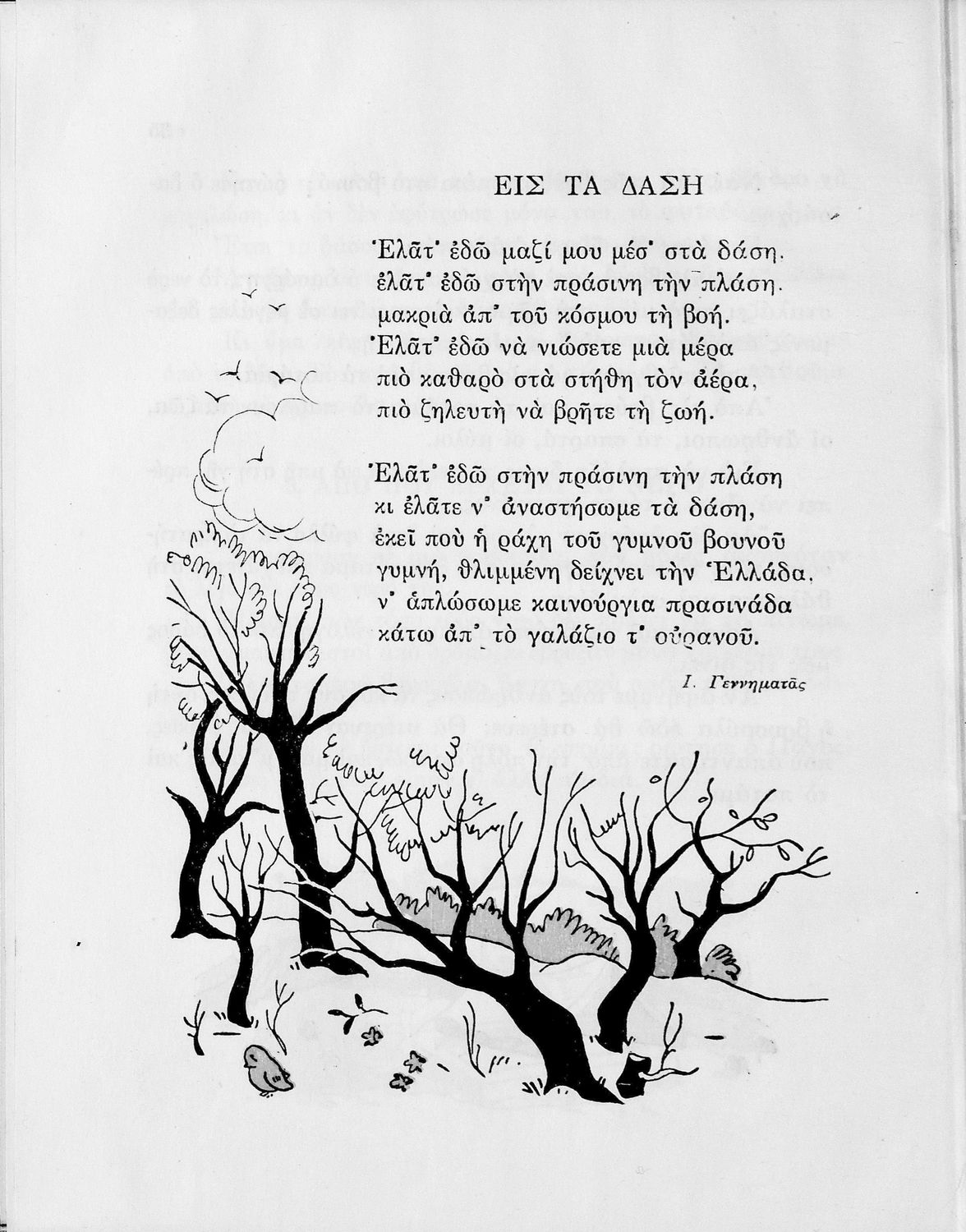 Αναγνωστικό για την Δ΄ τάξη του Δημοτικού. Περιλαμβάνει ένα κείμενο στο οποίο παρεμβάλλονται ποιήματα δημοτικά και Ελλήνων ποιητών.