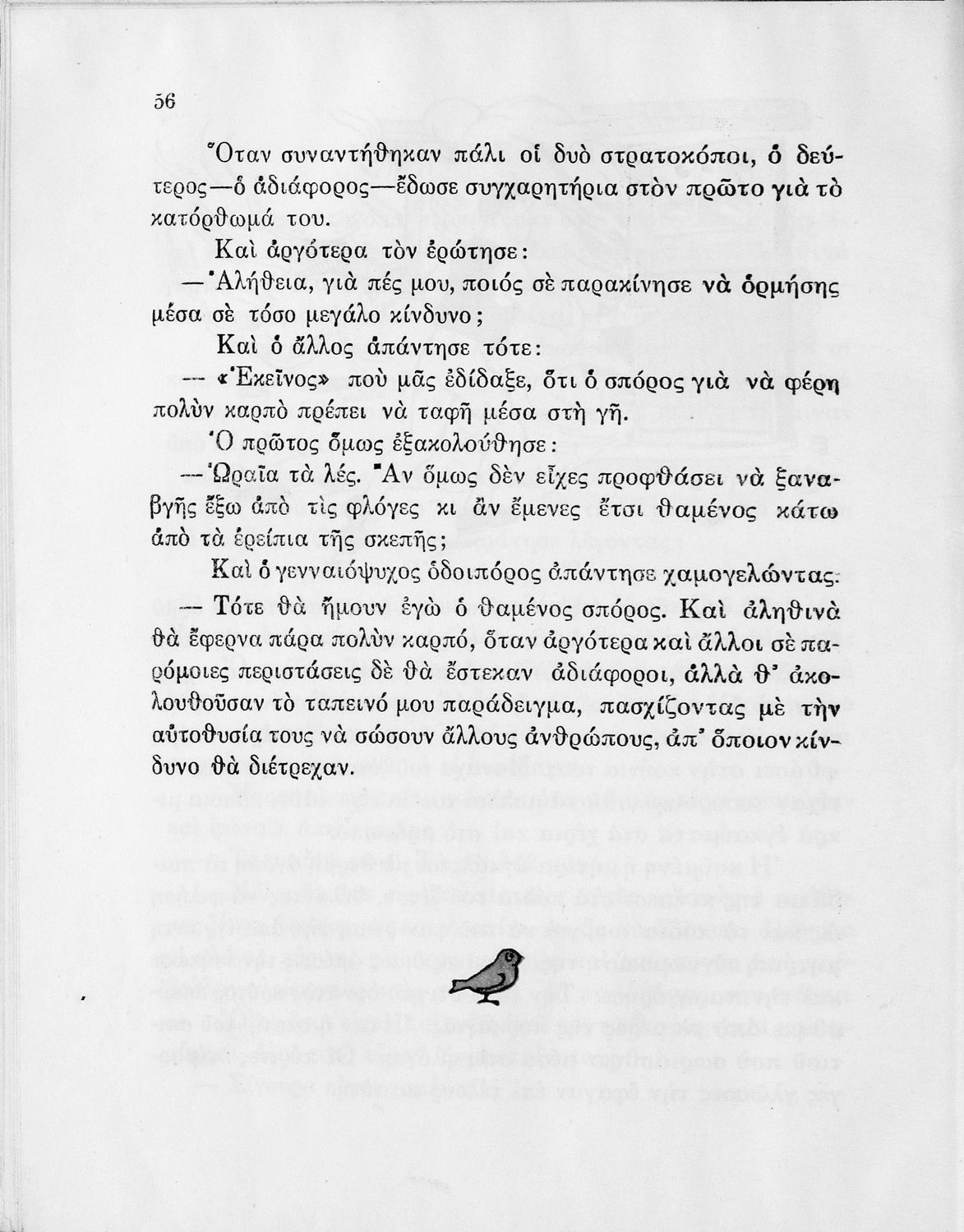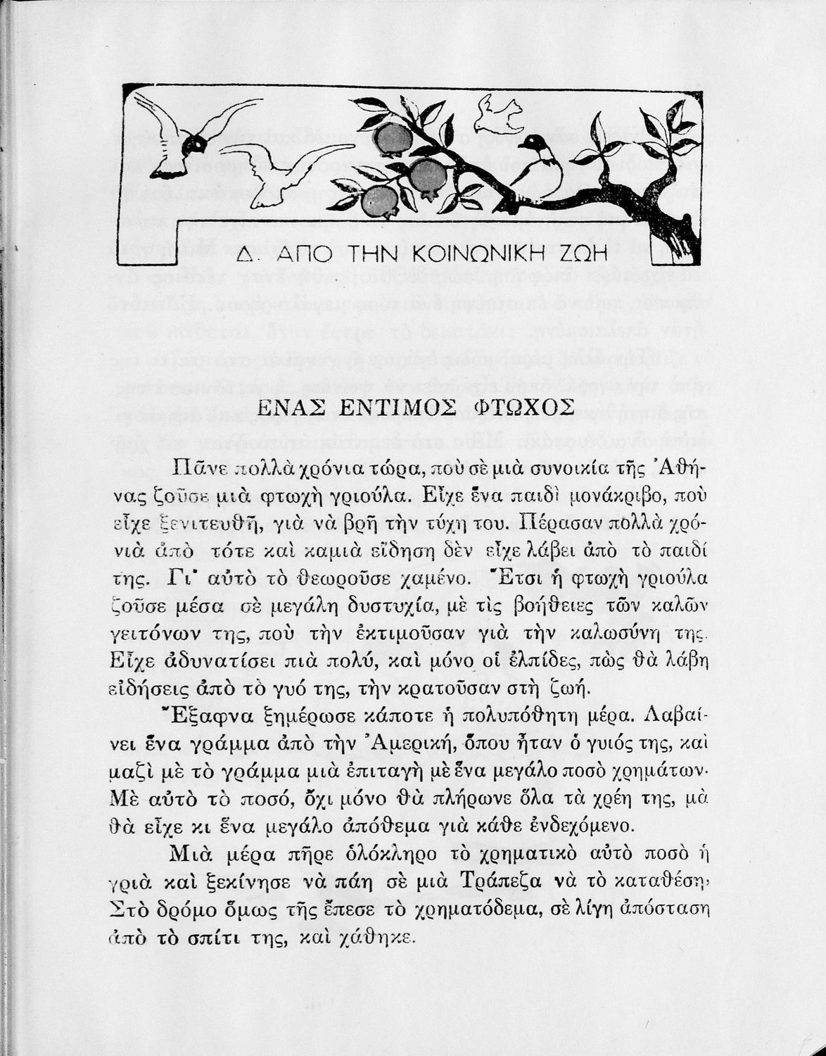 Αναγνωστικό Δ΄ Δημοτικού που περιέχει πεζά και ποιήματα με περιεχόμενο διδακτικό και ηθικοπλαστικό εμπνευσμένα από την ελληνική ιστορία και μυθολογία, και την αγροτική και κοινωνική ζωή.