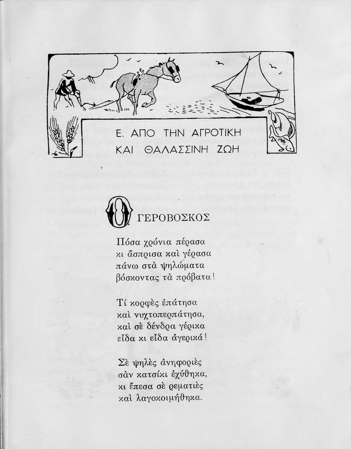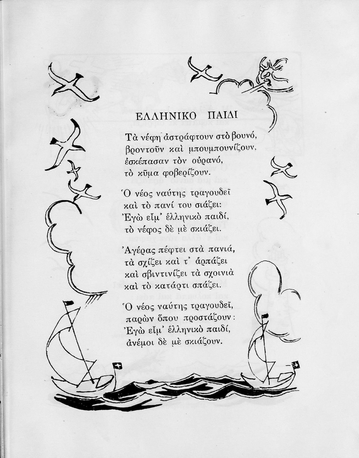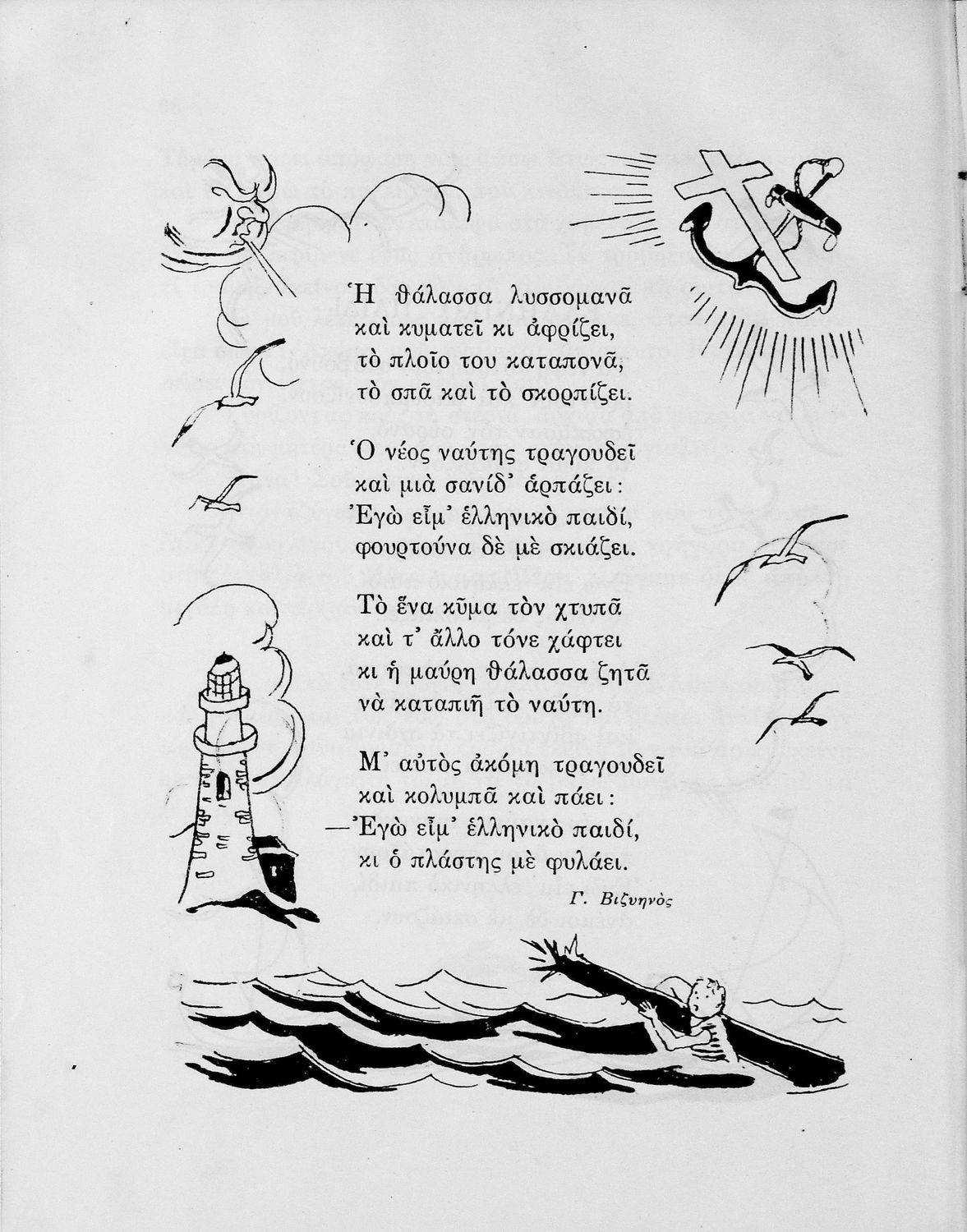 Αναγνωστικό για την Δ΄ τάξη του Δημοτικού. Περιλαμβάνει ένα κείμενο στο οποίο παρεμβάλλονται ποιήματα δημοτικά και Ελλήνων ποιητών.