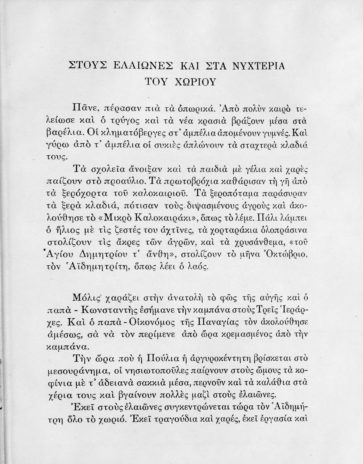 Αναγνωστικό Δ' Δημοτικού που περιλαμβάνει πεζά και ποιήματα Ελλήνων λογοτεχνών εμπνευσμένα από την ζωή στην ύπαιθρο, τις θρησκευτικές και εθνικές γιορτές και την οικογενειακή ζωή.