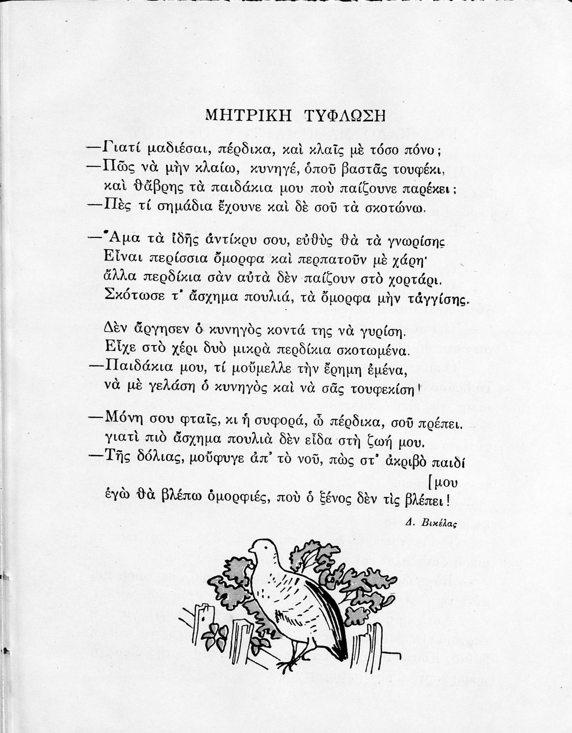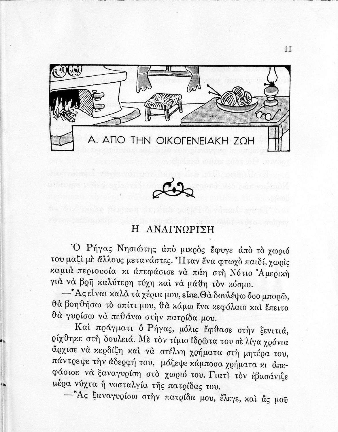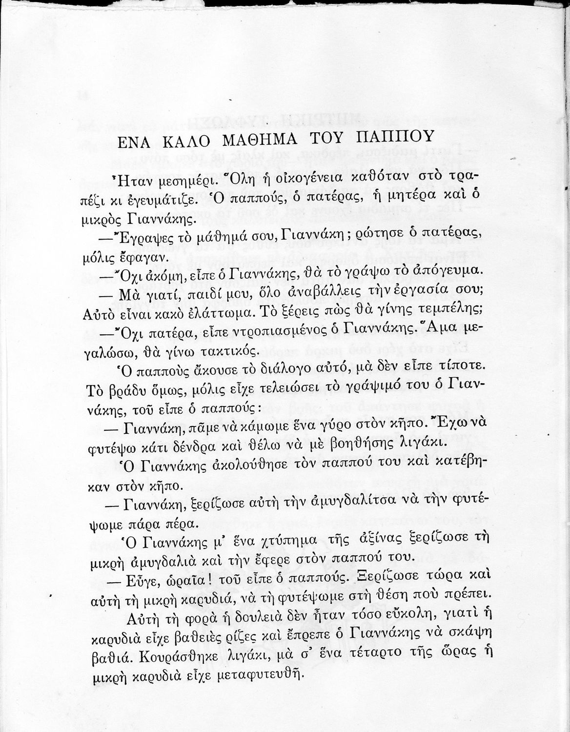 Αναγνωστικό Δ' Δημοτικού που περιλαμβάνει πεζά και ποιήματα Ελλήνων λογοτεχνών εμπνευσμένα από την ζωή στην ύπαιθρο, τις θρησκευτικές και εθνικές γιορτές και την οικογενειακή ζωή.