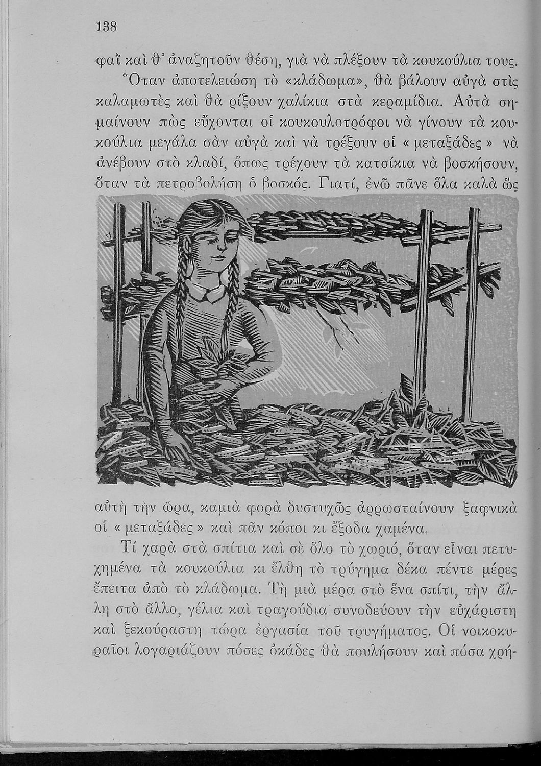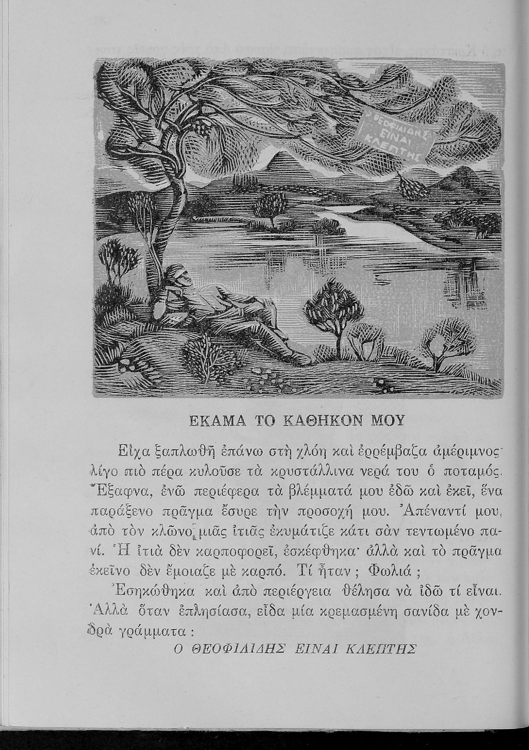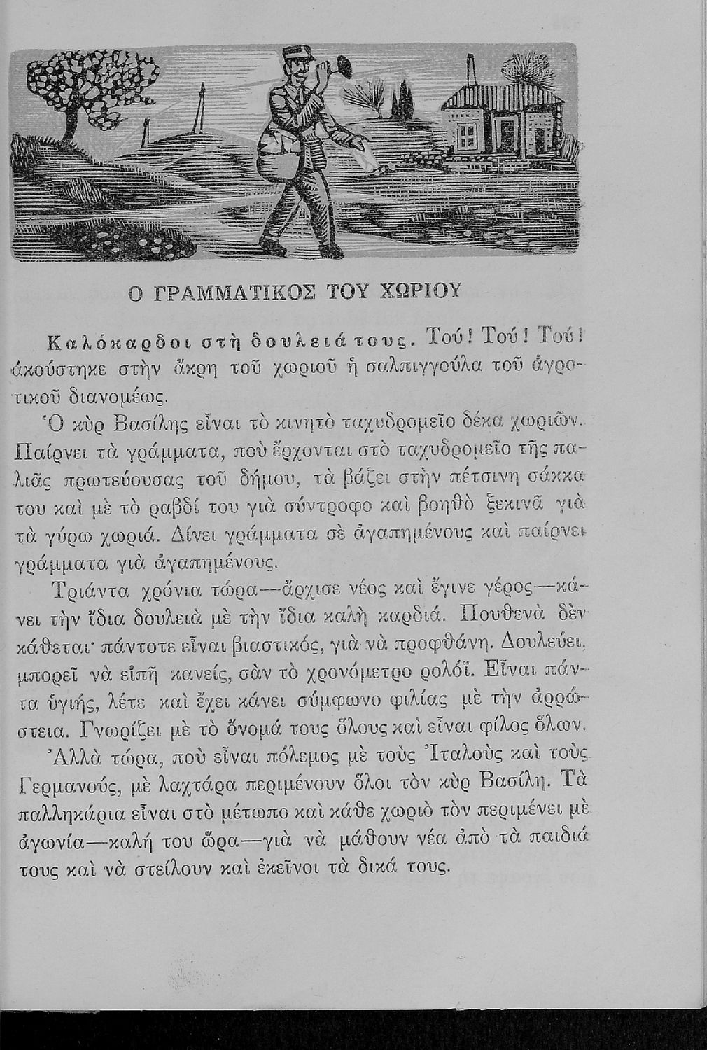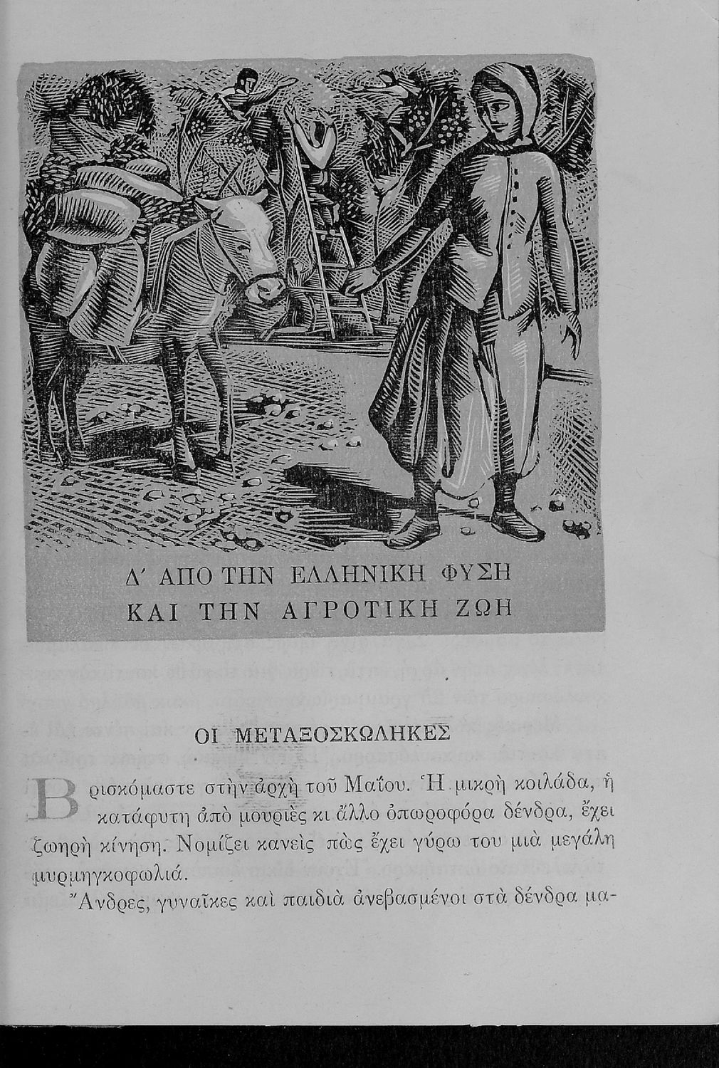 Αναγνωστικό Ε΄ Δημοτικού που περιλαμβάνει πεζογραφήματα εμπνευσμένα από την ελληνική φύση, την αγροτική ζωή και από το τρίπτυχο "Πατρίς- θρησκεία- οικογένεια".