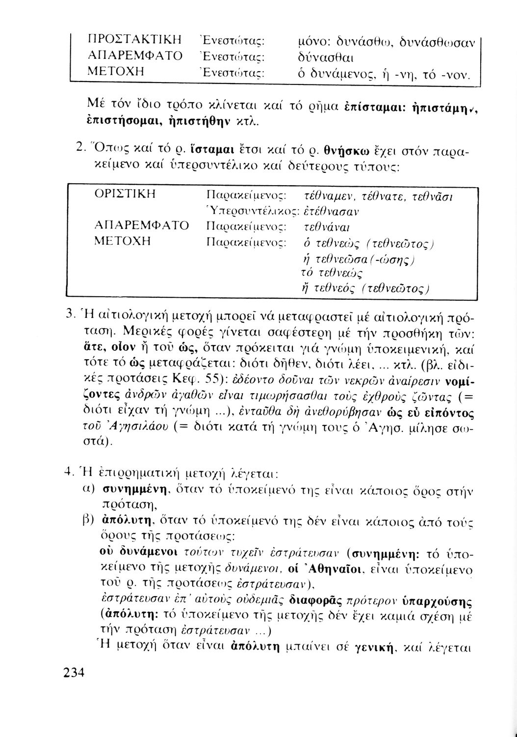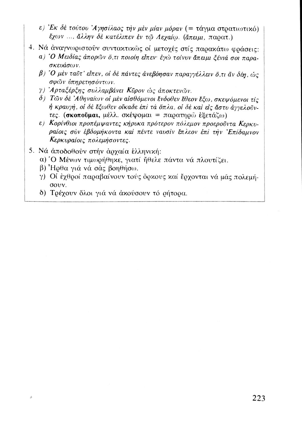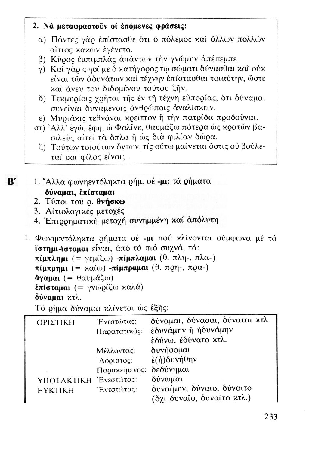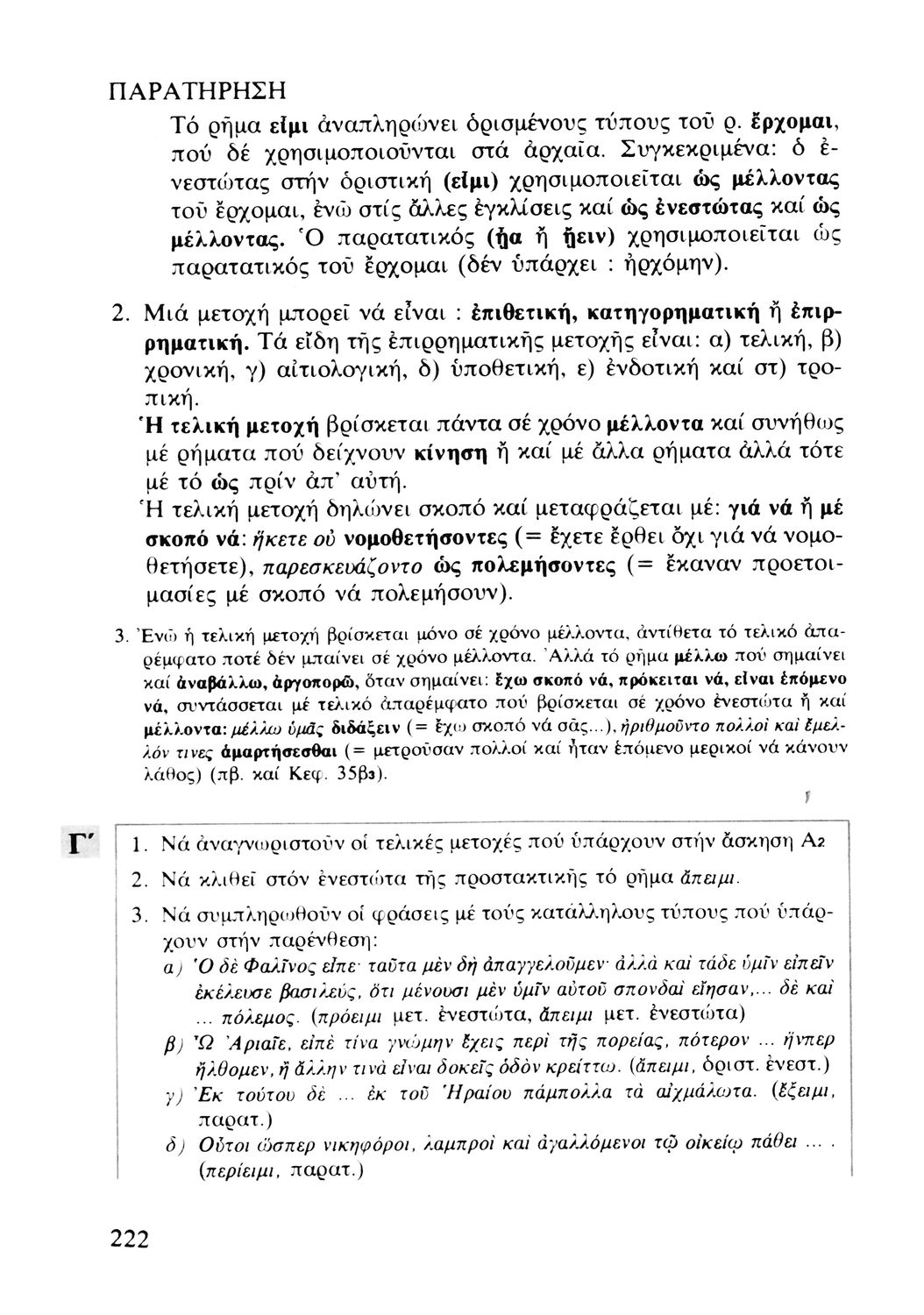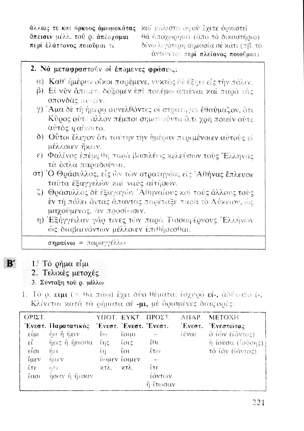 Σχολικό εγχειρίδιο Αρχαίων Ελληνικών για τις Α΄, Β΄ και Γ΄ Λυκείου που εξετάζει τα μέρη του λόγου και την σύνταξή τους.