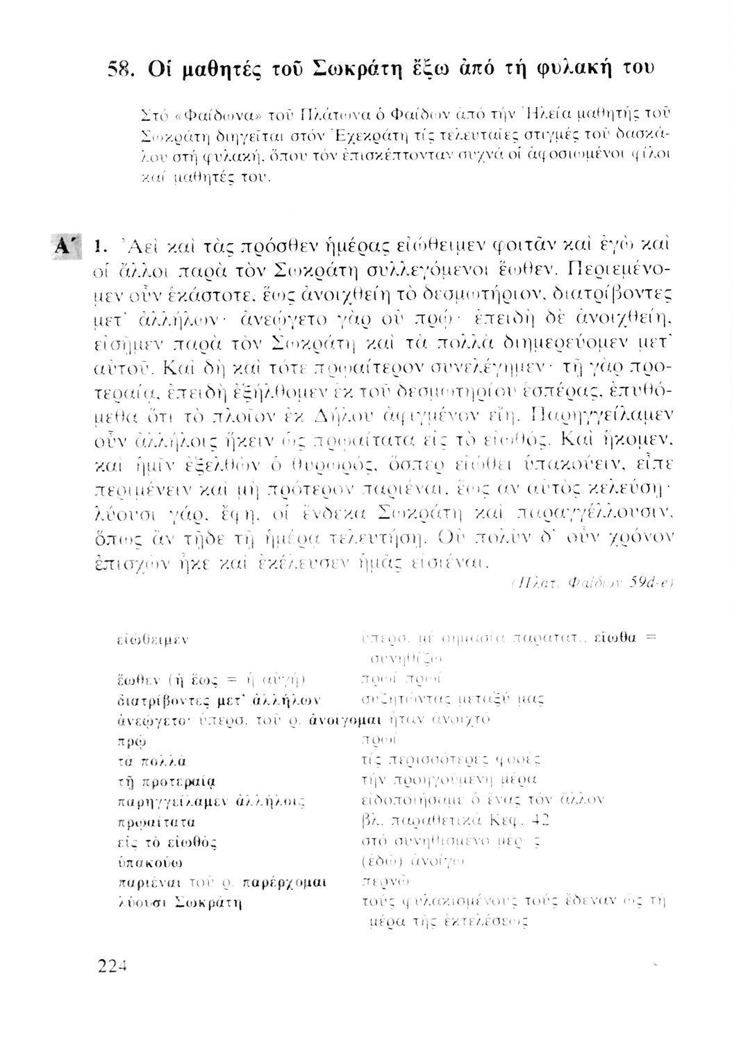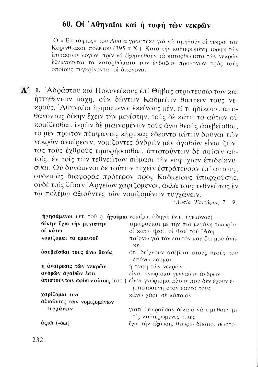 Σχολικό εγχειρίδιο Αρχαίων Ελληνικών Α' Λυκείου που περιλαμβάνει αποσπάσματα από κείμενα αρχαίων Ελλήνων συγγραφέων και γραμματικές, συντακτικές και ερμηνευτικές σημειώσεις. Περιέχει και ασκήσεις γραμματικής.