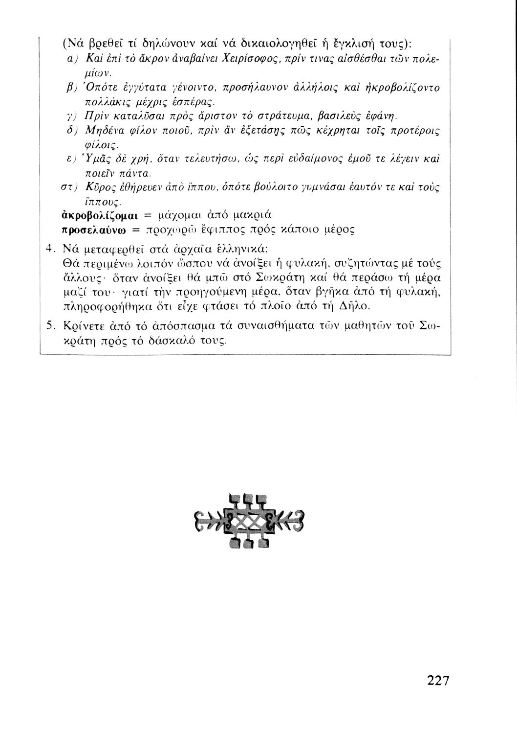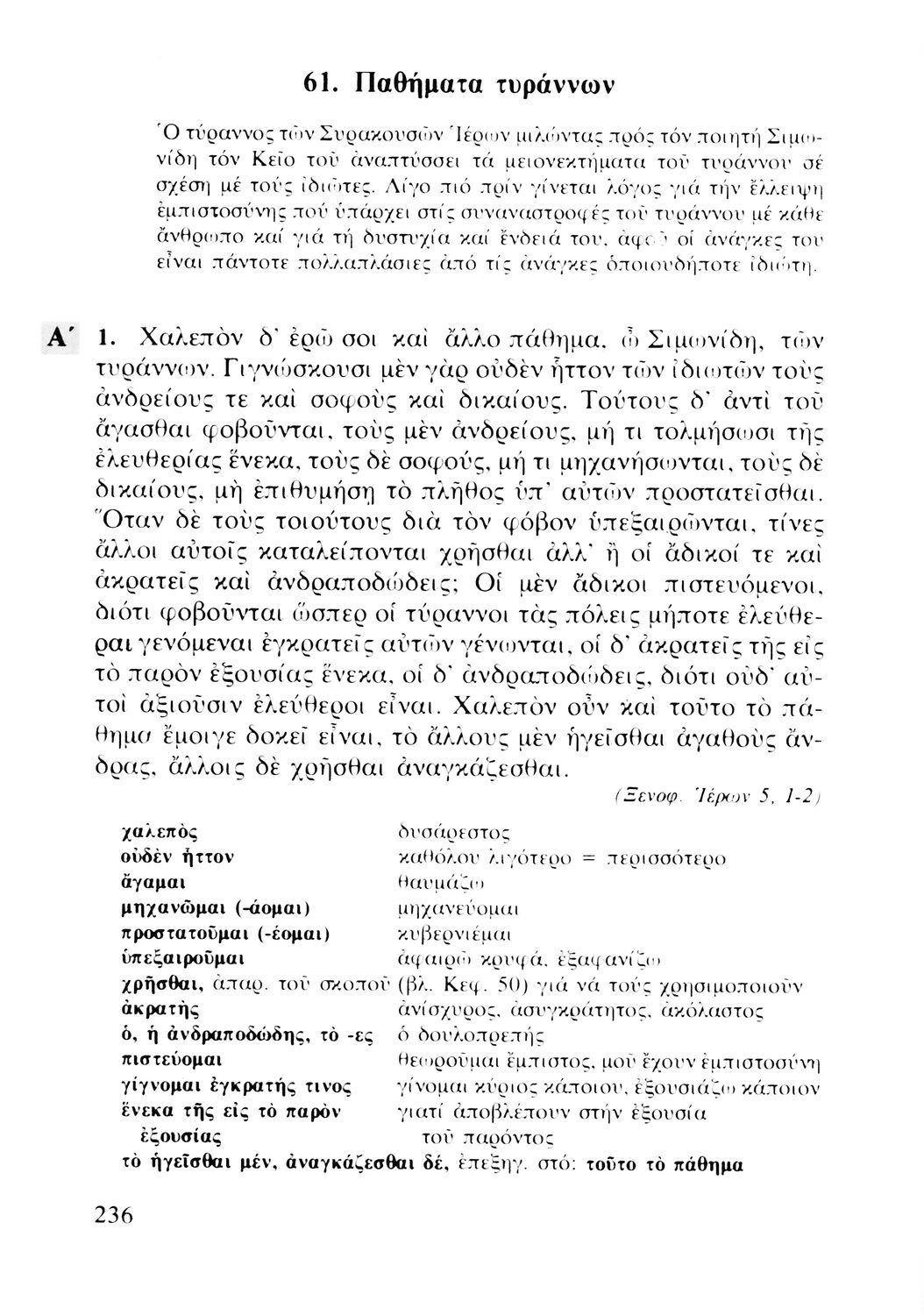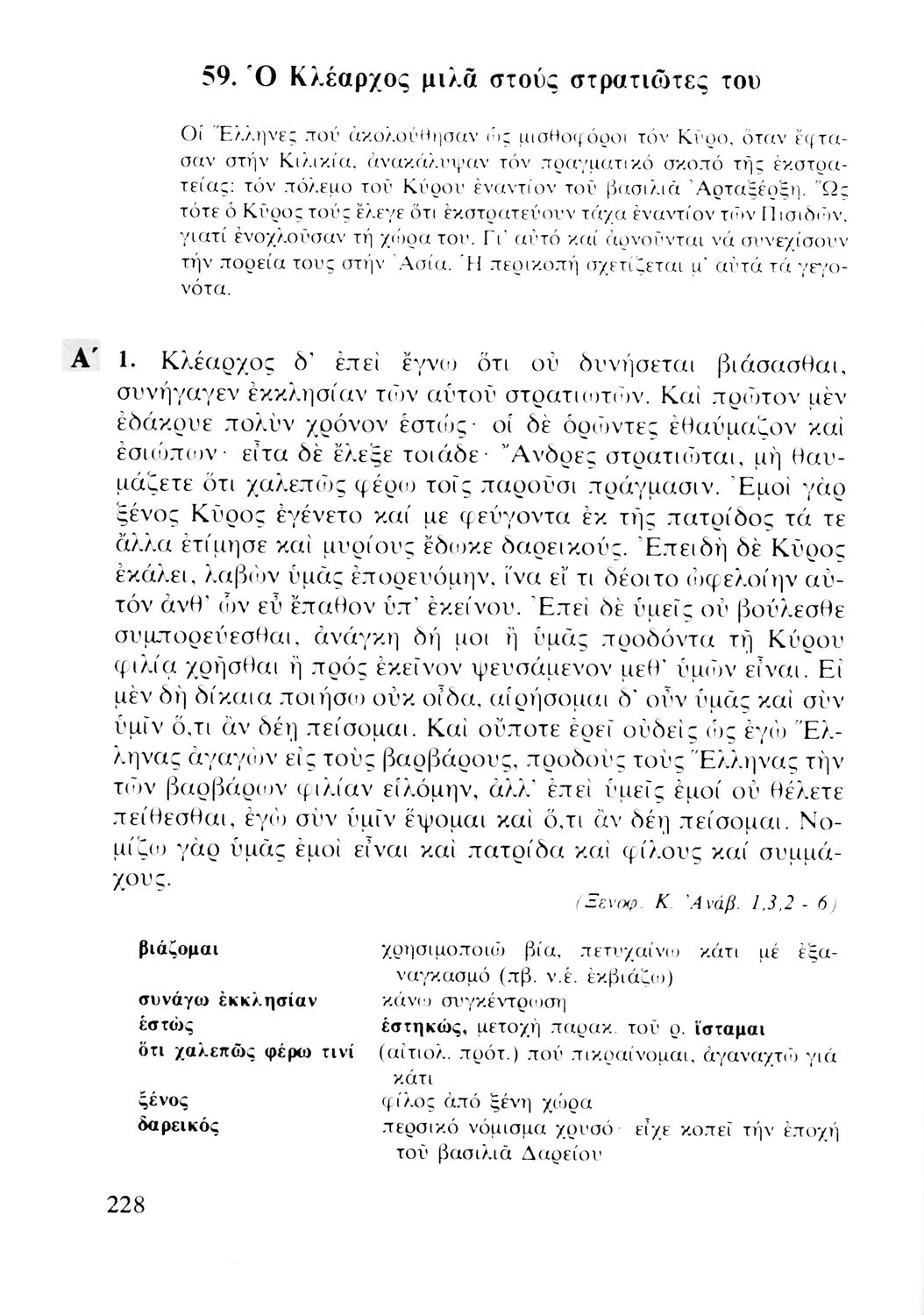 Σχολικό εγχειρίδιο Αρχαίων ελληνικών Α΄ Λυκείου που περιλαμβάνει αποσπάσματα από τα Ελληνικά του Ξενοφώντα, εισαγωγή στη ζωή και το έργο του, ερμηνευτικές σημειώσεις, τοπογραφικούς πίνακες και σχεδιαγράμματα ...