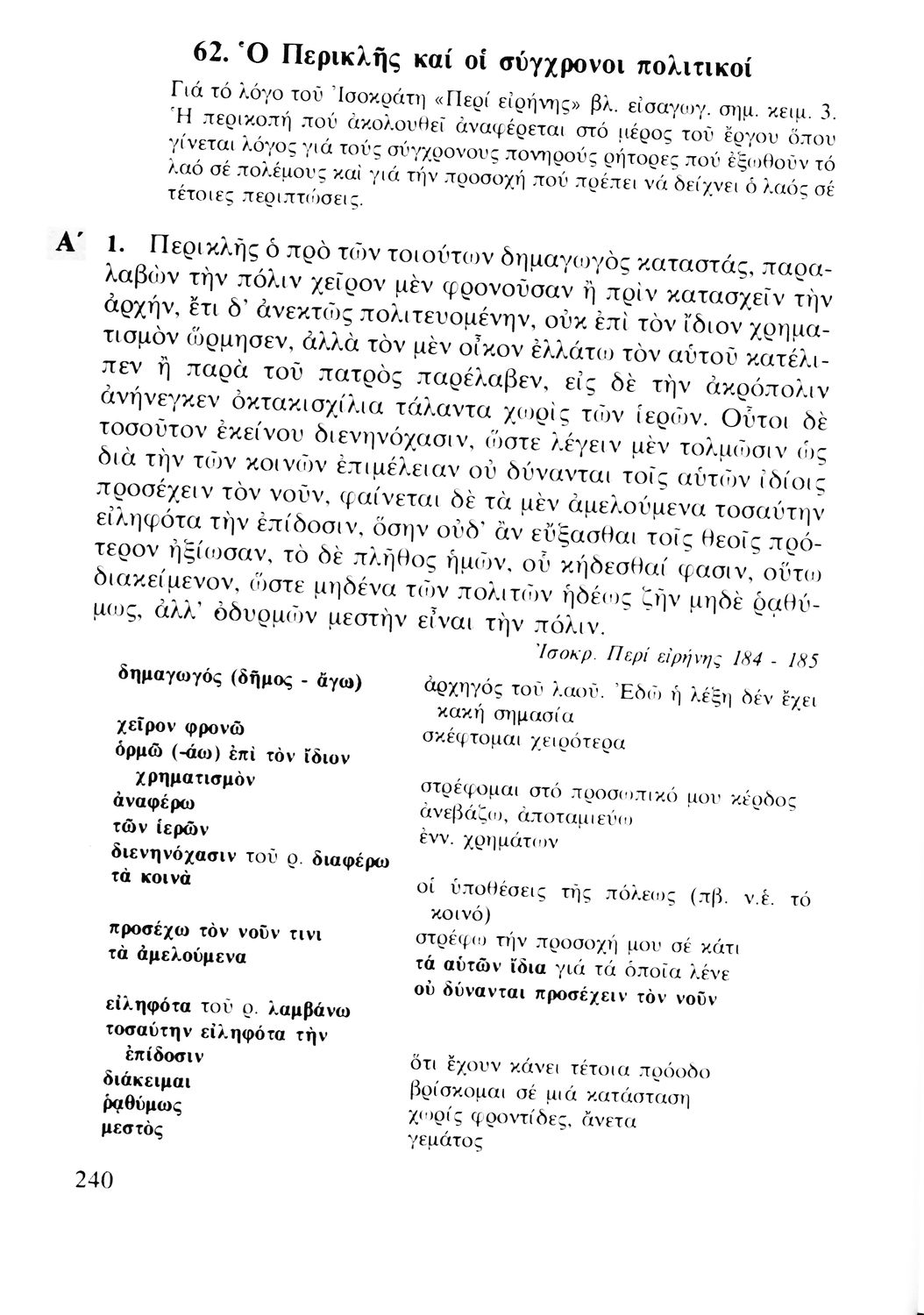 Σχολικό εγχειρίδιο Αρχαίων Ελληνικών Α΄ Λυκείου που περιλαμβάνει εισαγωγή στη ζωή και το έργο του Ισοκράτη, τον Πανηγυρικό, μετάφραση και ερμηνευτικές σημειώσεις.