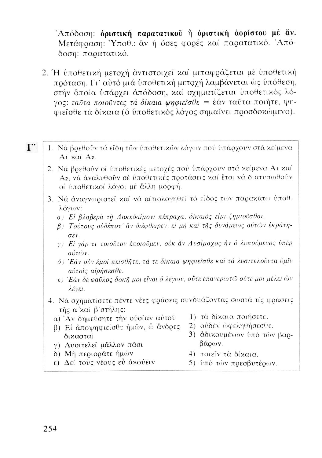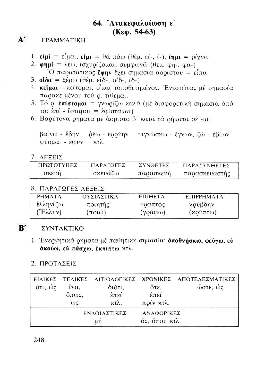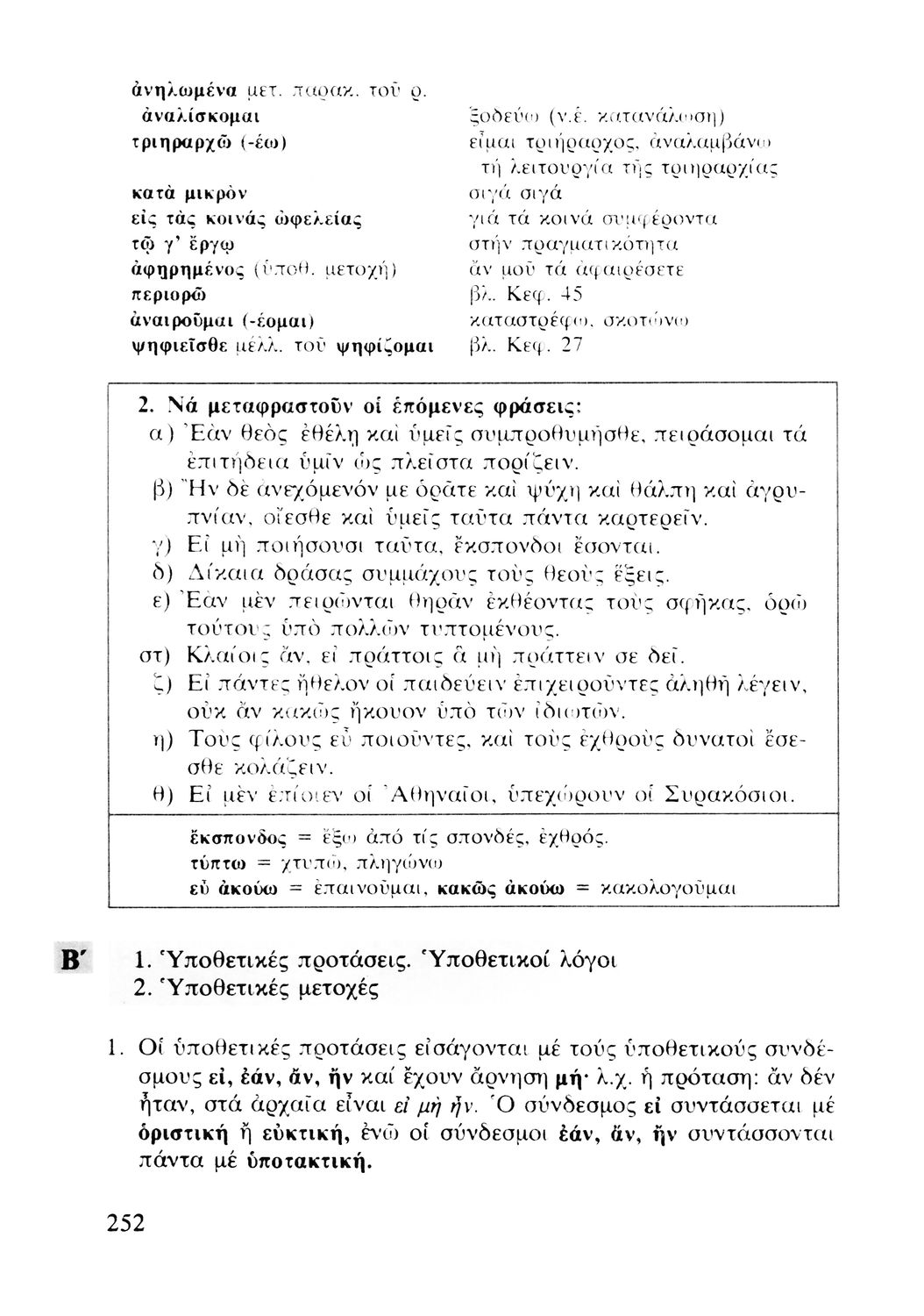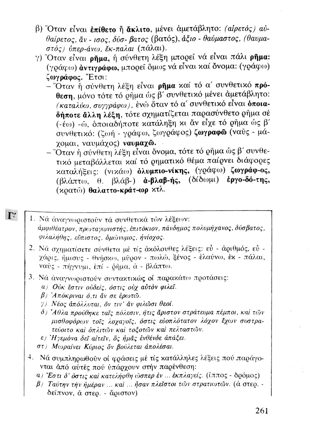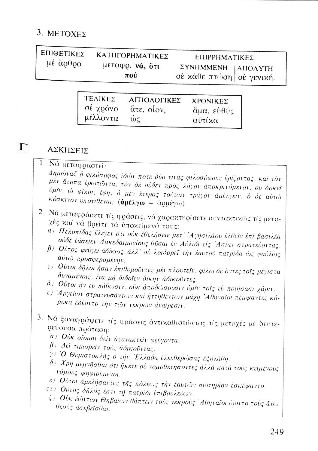 Σχολικό εγχειρίδιο Αρχαίων Ελληνικών για τις Α΄, Β΄ και Γ΄ Λυκείου που εξετάζει τα μέρη του λόγου και την σύνταξή τους.