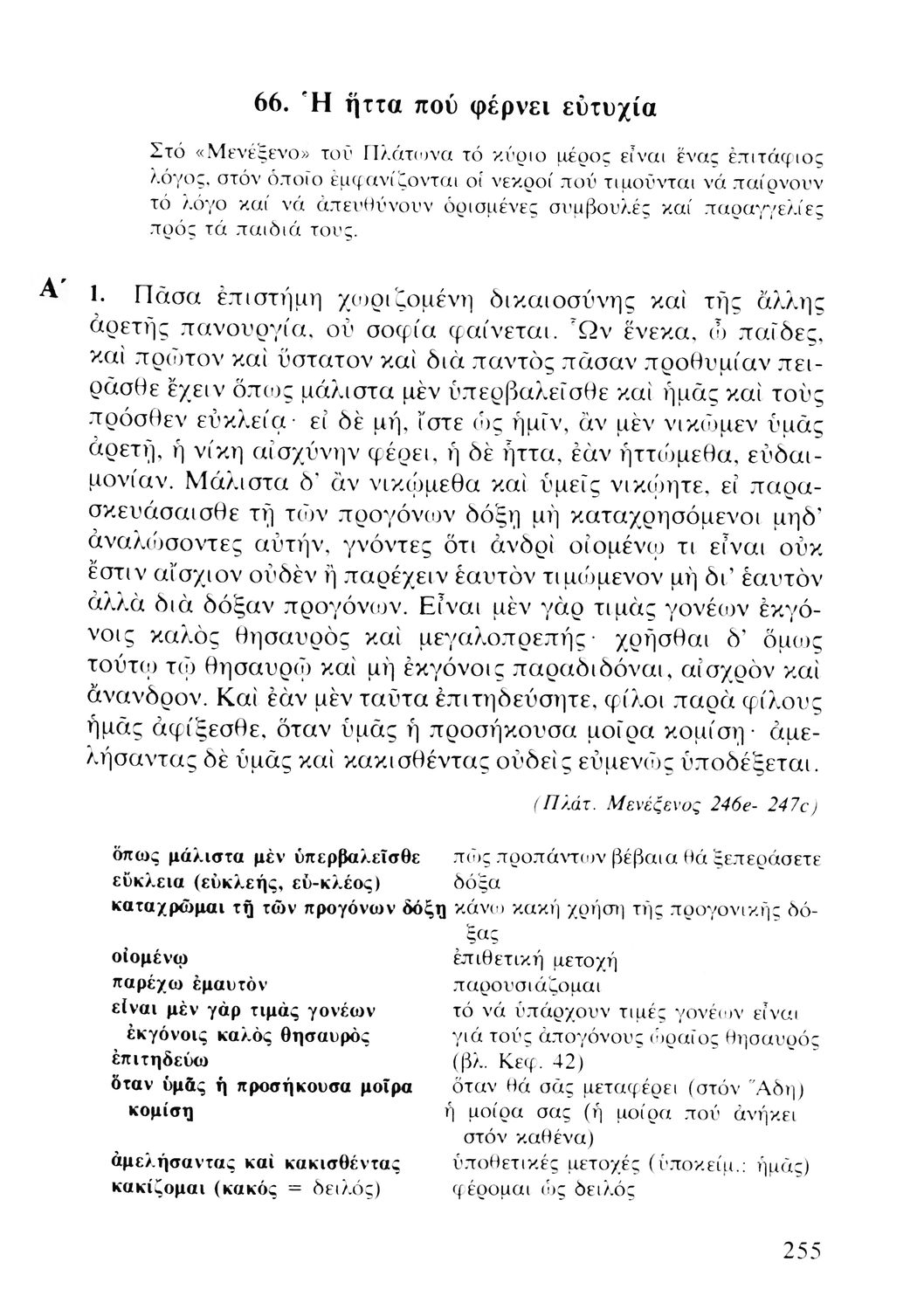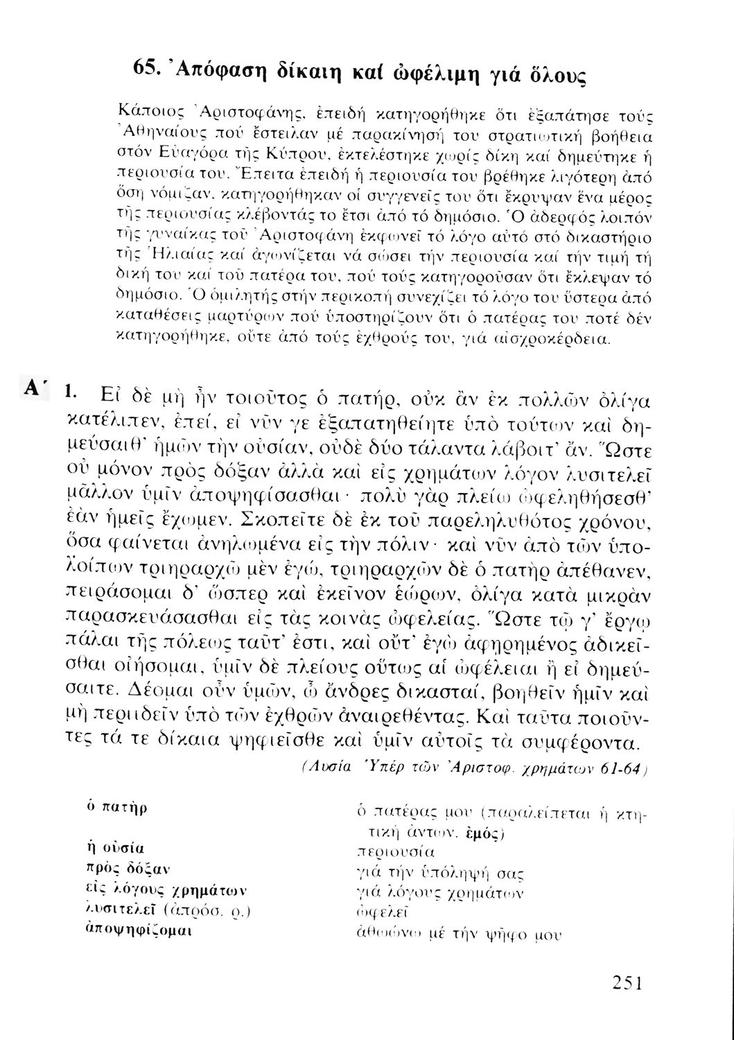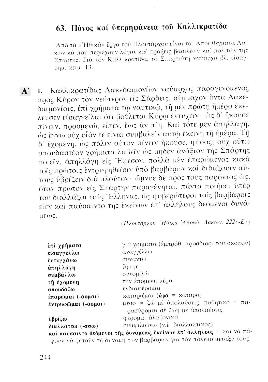 Σχολικό εγχειρίδιο Αρχαίων Ελληνικών Α' Λυκείου που περιλαμβάνει αποσπάσματα από κείμενα αρχαίων Ελλήνων συγγραφέων και γραμματικές, συντακτικές και ερμηνευτικές σημειώσεις. Περιέχει και ασκήσεις γραμματικής.