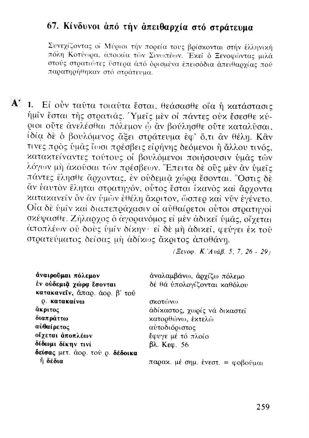 Σχολικό εγχειρίδιο Αρχαίων ελληνικών Α΄ Λυκείου που περιλαμβάνει αποσπάσματα από τα Ελληνικά του Ξενοφώντα, εισαγωγή στη ζωή και το έργο του, ερμηνευτικές σημειώσεις, τοπογραφικούς πίνακες και σχεδιαγράμματα ...