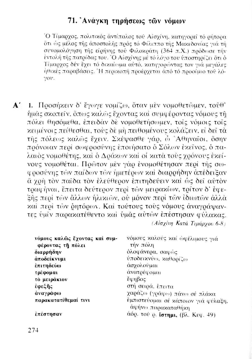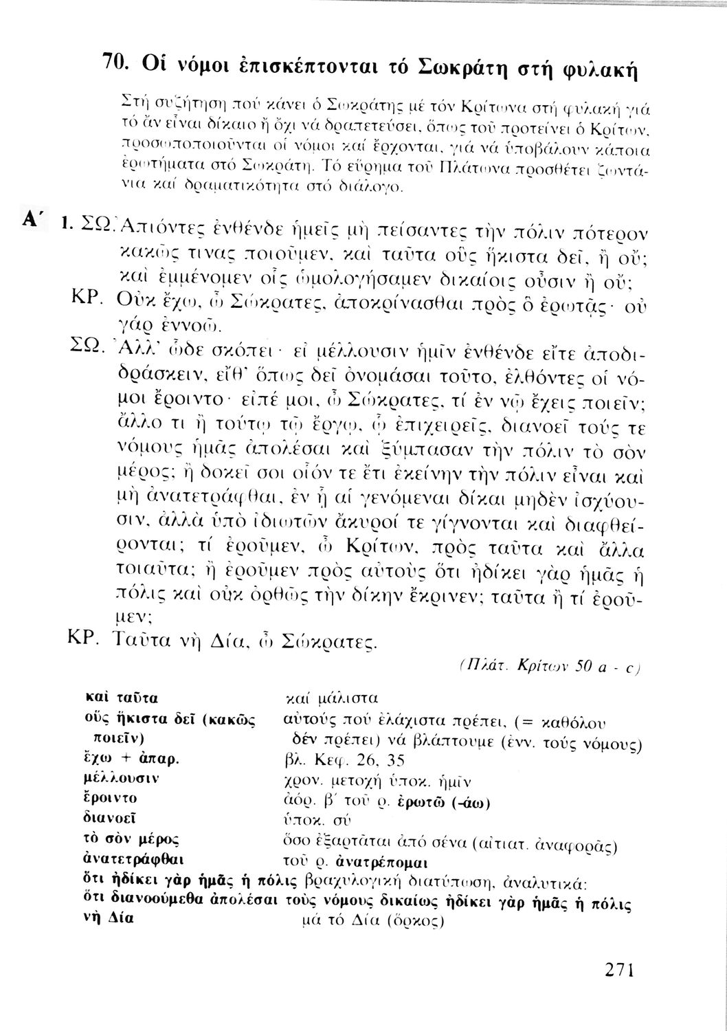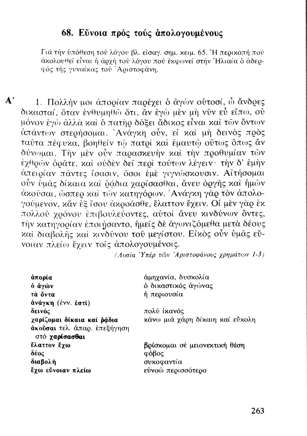 Σχολικό εγχειρίδιο Αρχαίων Ελληνικών Α' Λυκείου που περιλαμβάνει αποσπάσματα από κείμενα αρχαίων Ελλήνων συγγραφέων και γραμματικές, συντακτικές και ερμηνευτικές σημειώσεις. Περιέχει και ασκήσεις γραμματικής.