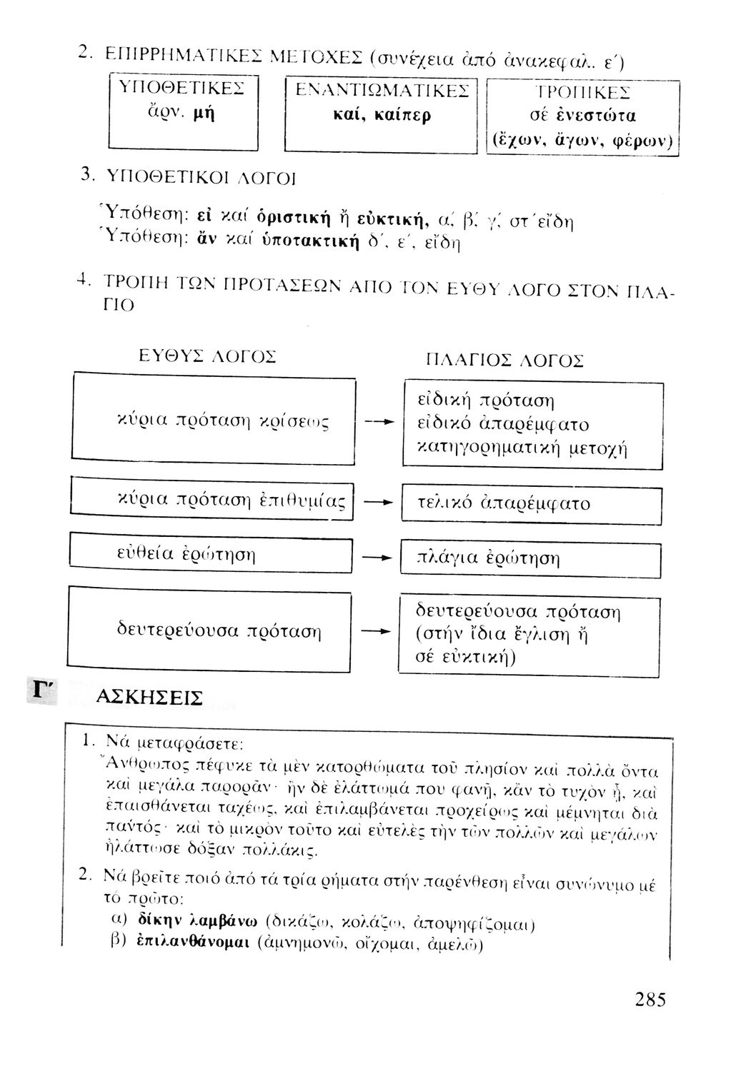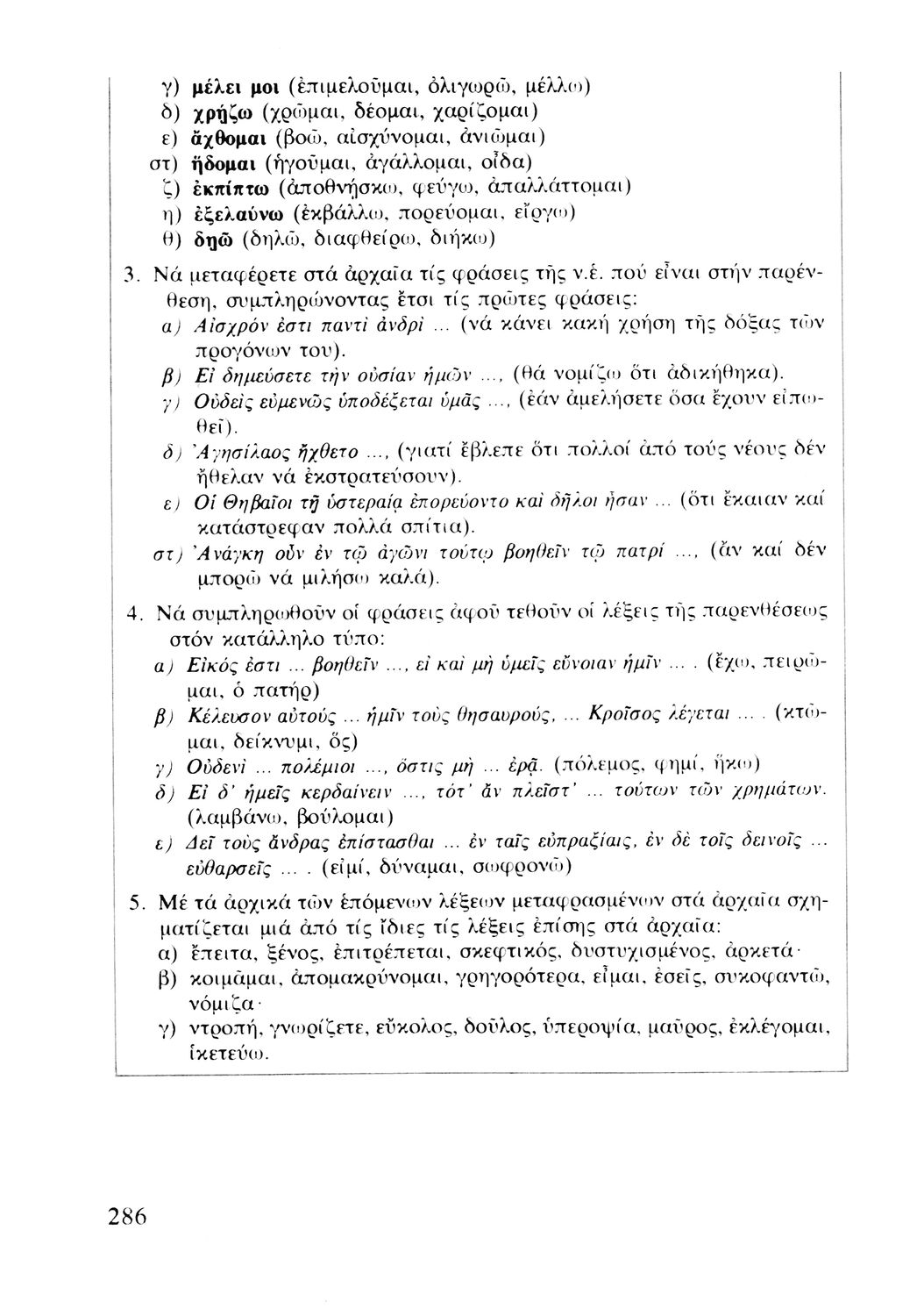 Σχολικό εγχειρίδιο Αρχαίων Ελληνικών για τις Α΄, Β΄ και Γ΄ Λυκείου που εξετάζει τα μέρη του λόγου και την σύνταξή τους.