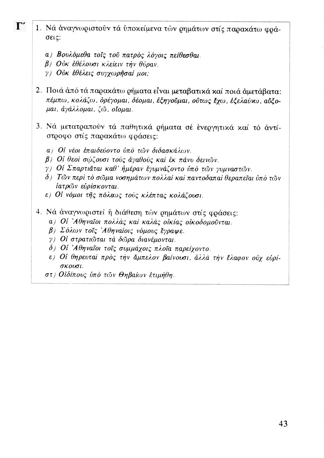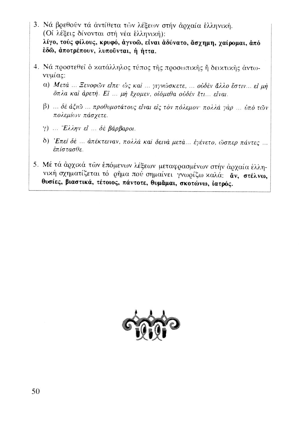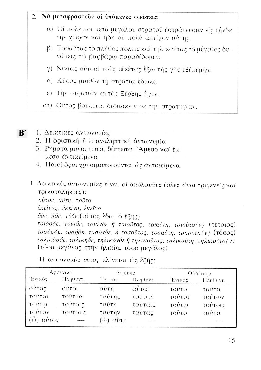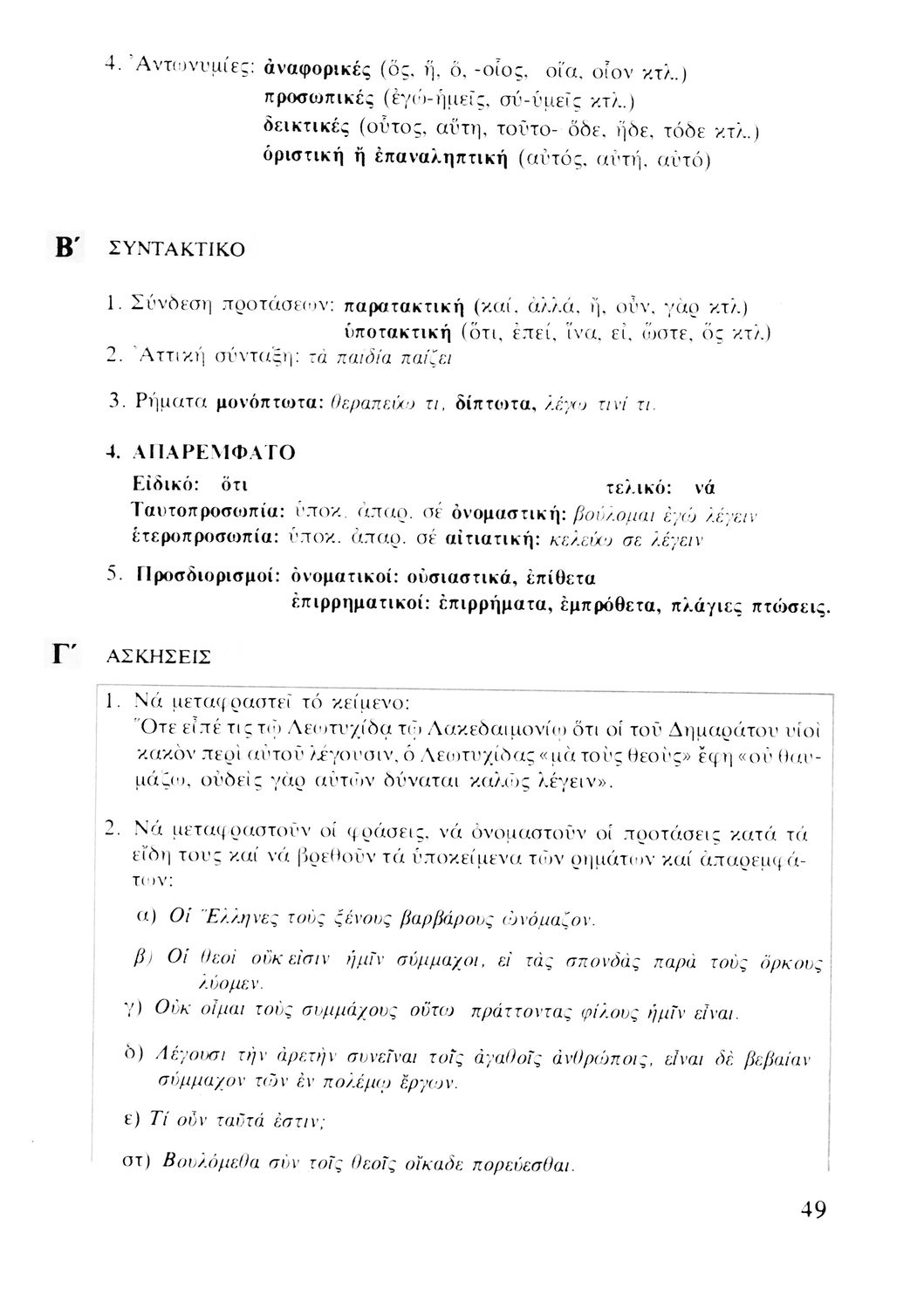 Σχολικό εγχειρίδιο Αρχαίων Ελληνικών για τις Α΄, Β΄ και Γ΄ Λυκείου που εξετάζει τα μέρη του λόγου και την σύνταξή τους.