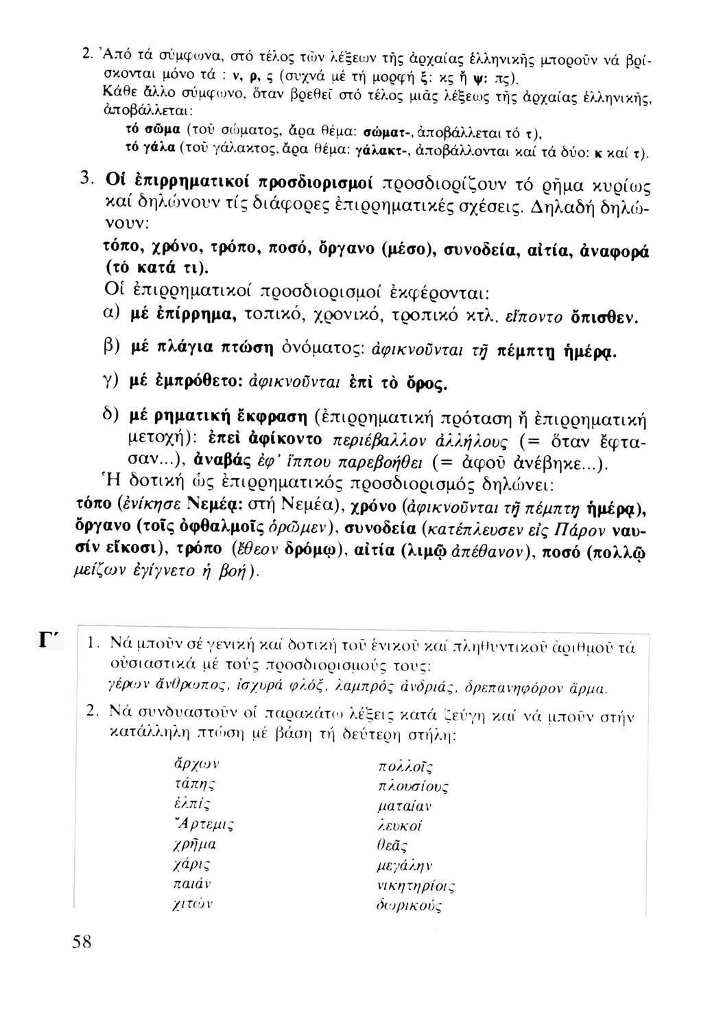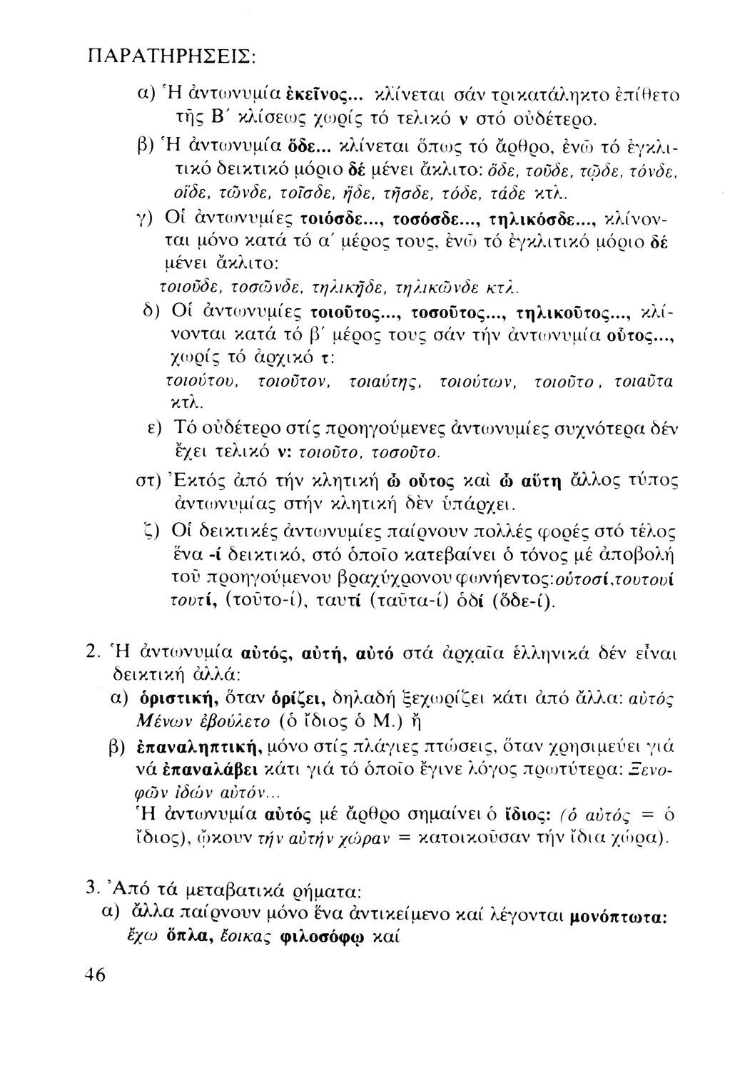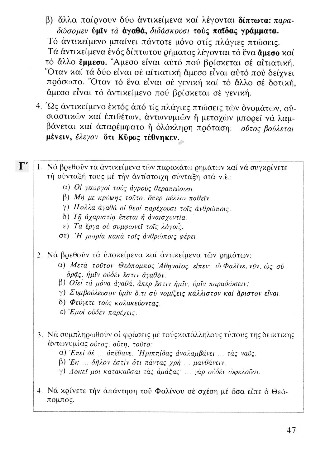 Σχολικό εγχειρίδιο Αρχαίων Ελληνικών για τις Α΄, Β΄ και Γ΄ Λυκείου που εξετάζει τα μέρη του λόγου και την σύνταξή τους.