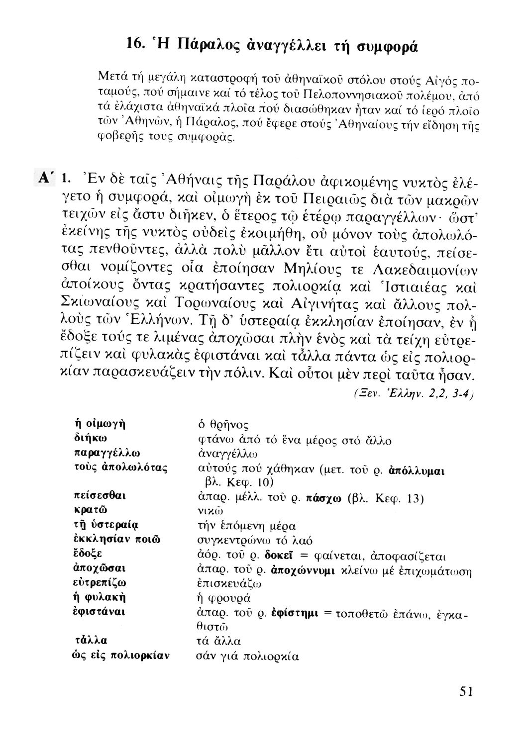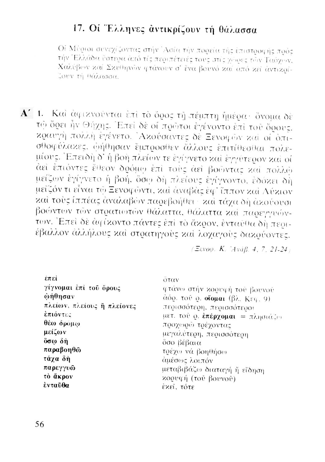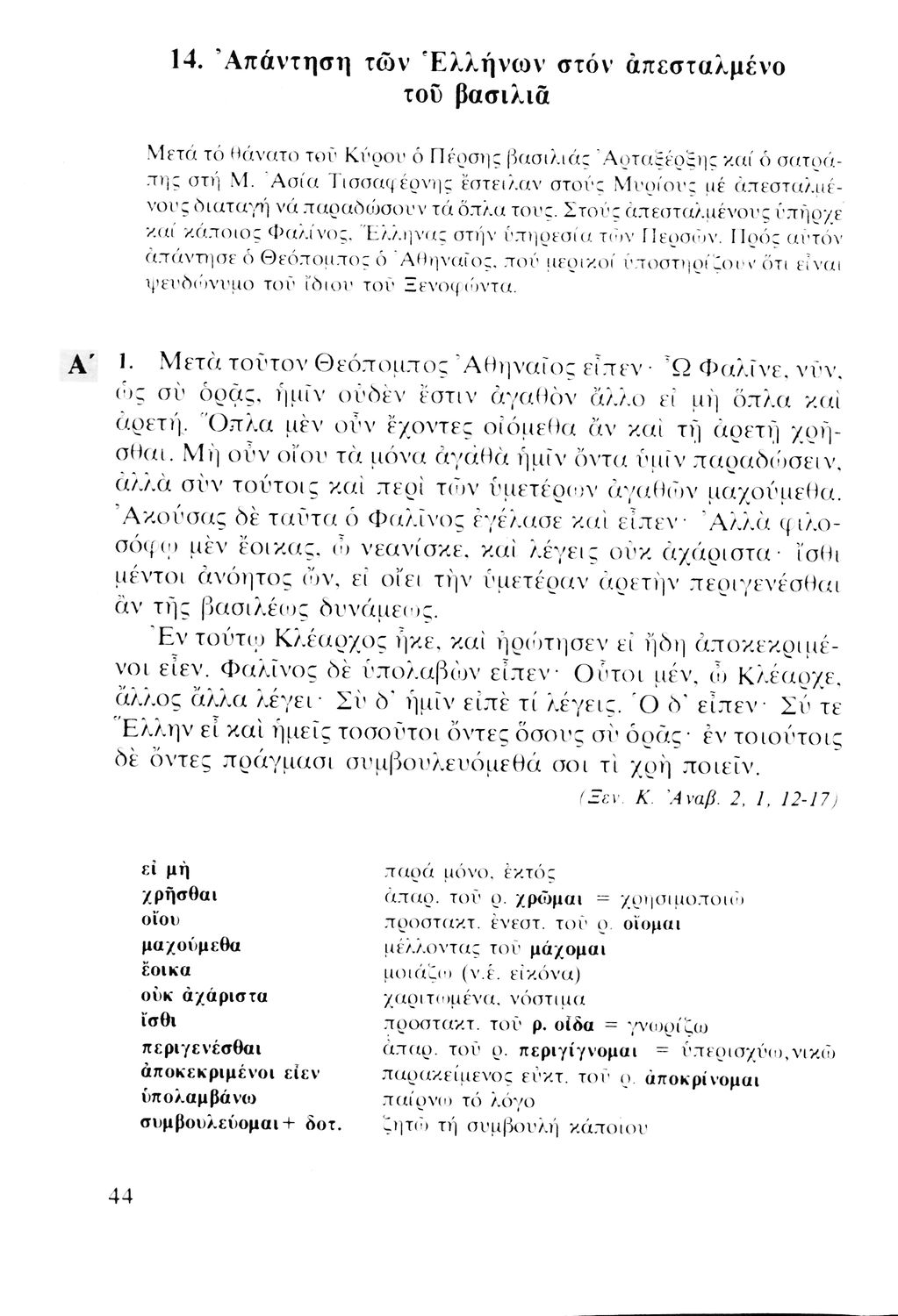 Σχολικό εγχειρίδιο Αρχαίων ελληνικών Α΄ Λυκείου που περιλαμβάνει αποσπάσματα από τα Ελληνικά του Ξενοφώντα, εισαγωγή στη ζωή και το έργο του, ερμηνευτικές σημειώσεις, τοπογραφικούς πίνακες και σχεδιαγράμματα ...