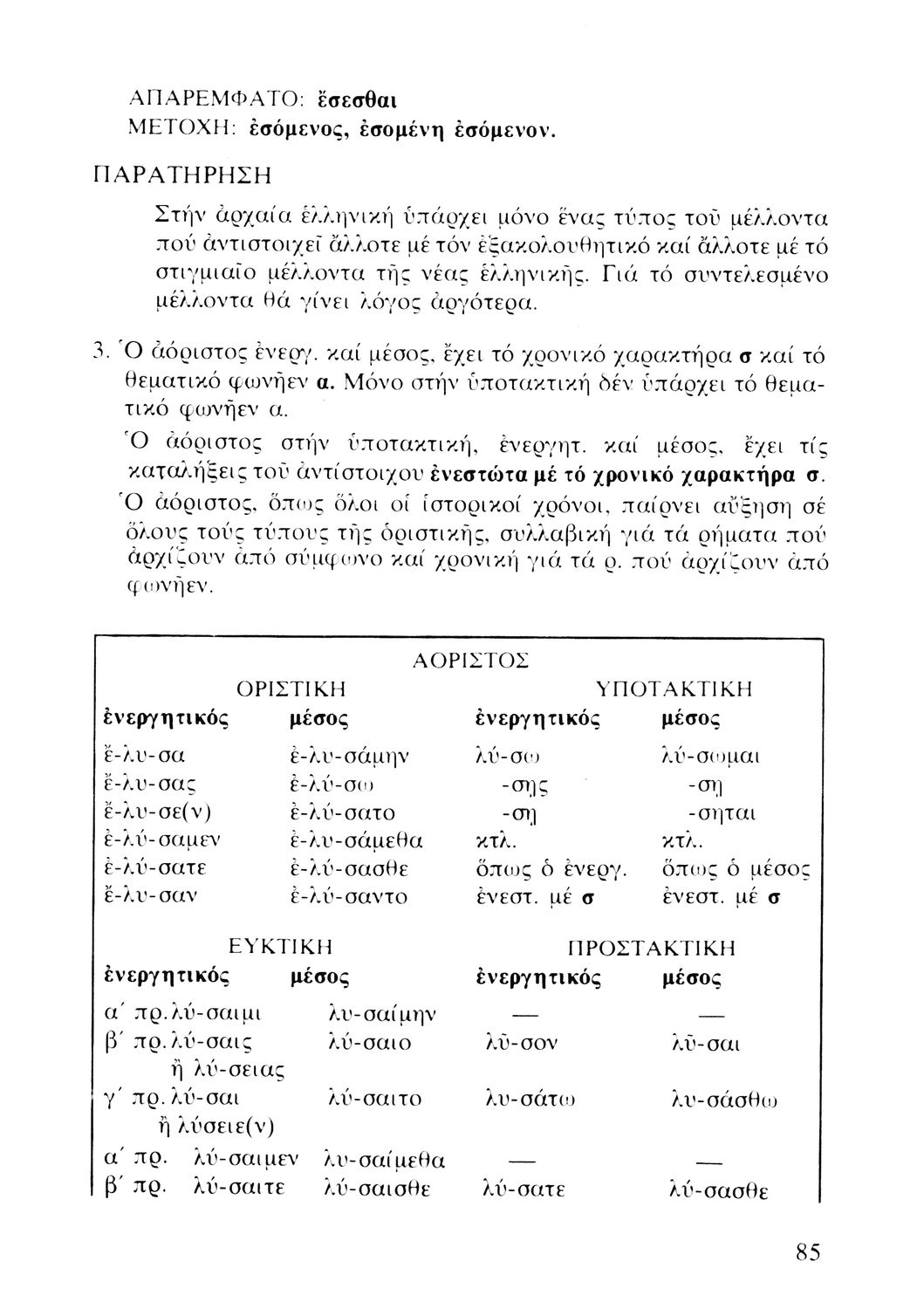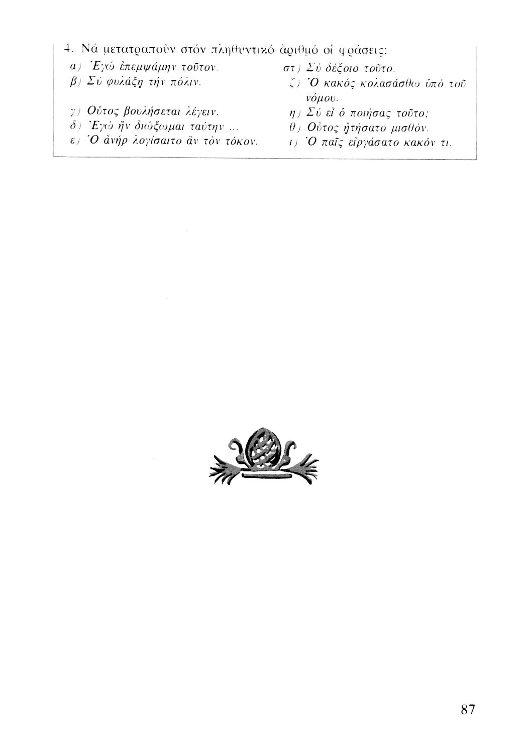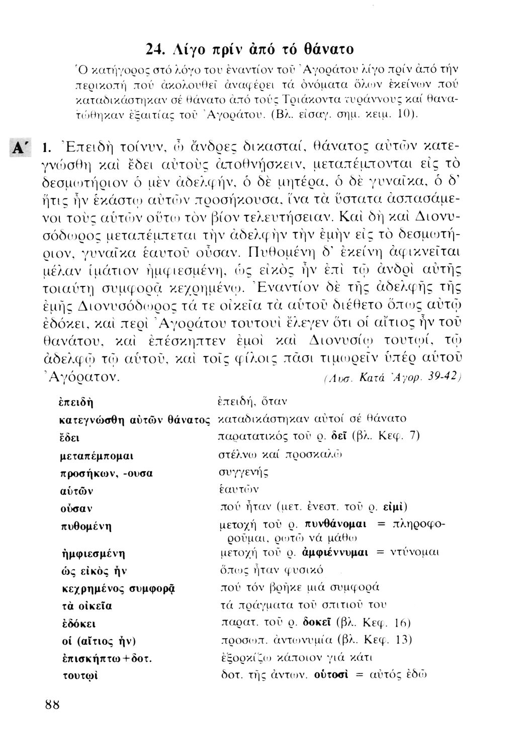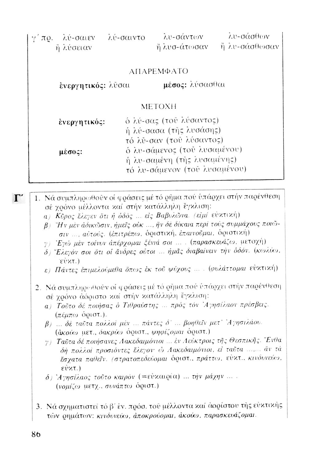 Σχολικό εγχειρίδιο Αρχαίων Ελληνικών για τις Α΄, Β΄ και Γ΄ Λυκείου που εξετάζει τα μέρη του λόγου και την σύνταξή τους.