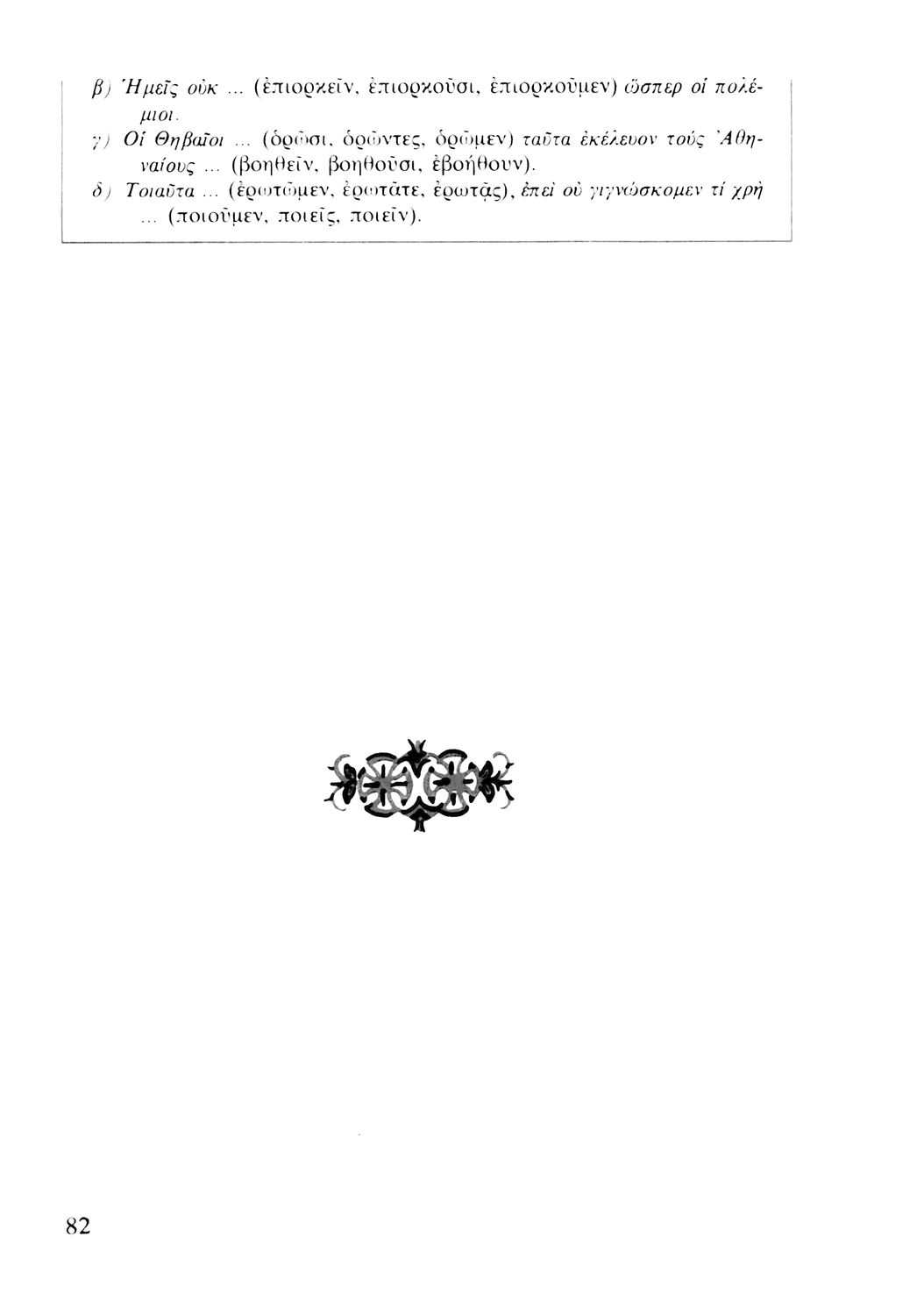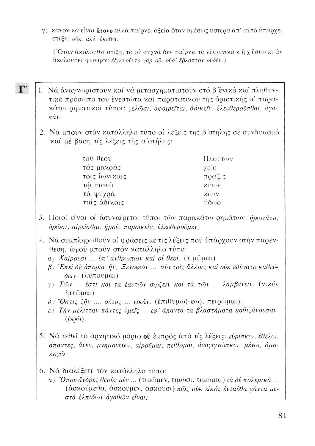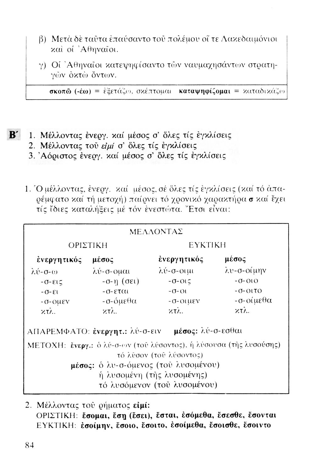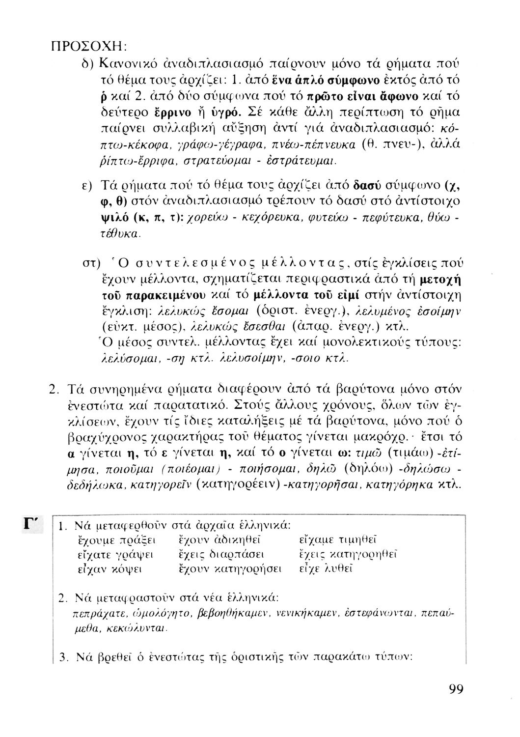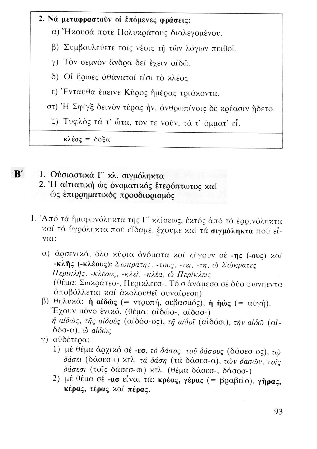 Σχολικό εγχειρίδιο Αρχαίων Ελληνικών για τις Α΄, Β΄ και Γ΄ Λυκείου που εξετάζει τα μέρη του λόγου και την σύνταξή τους.