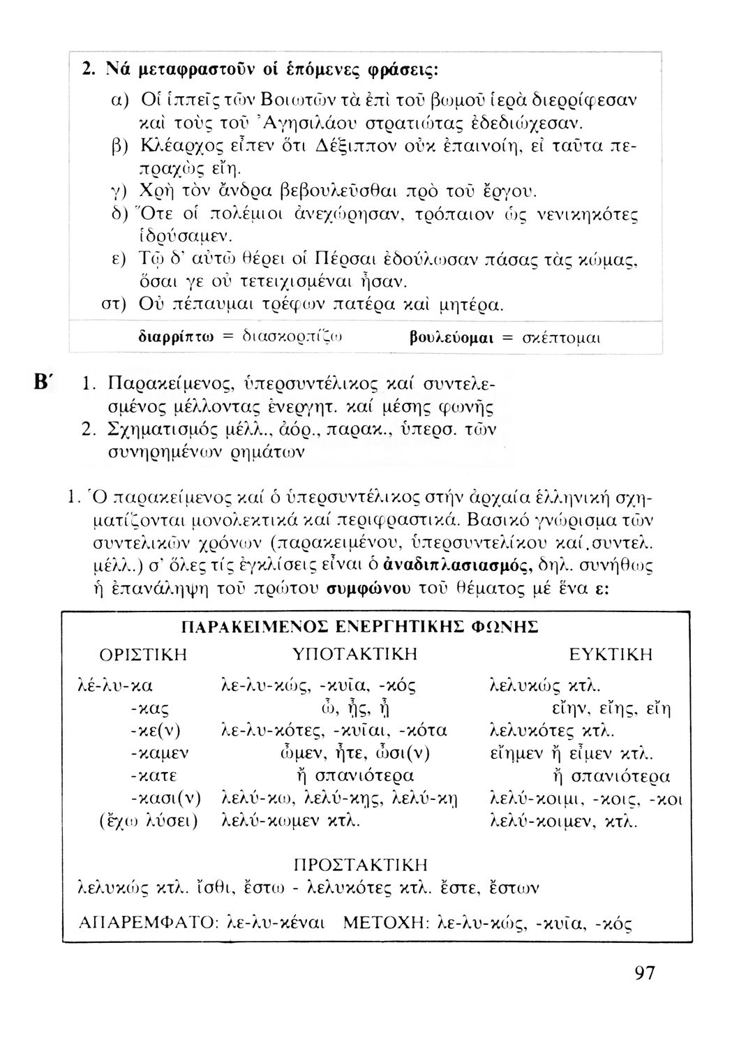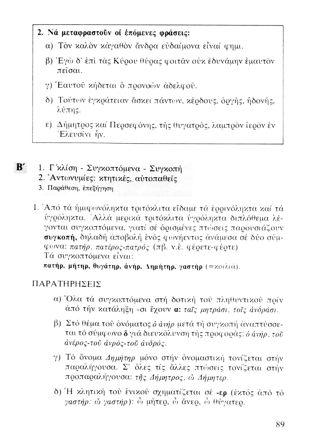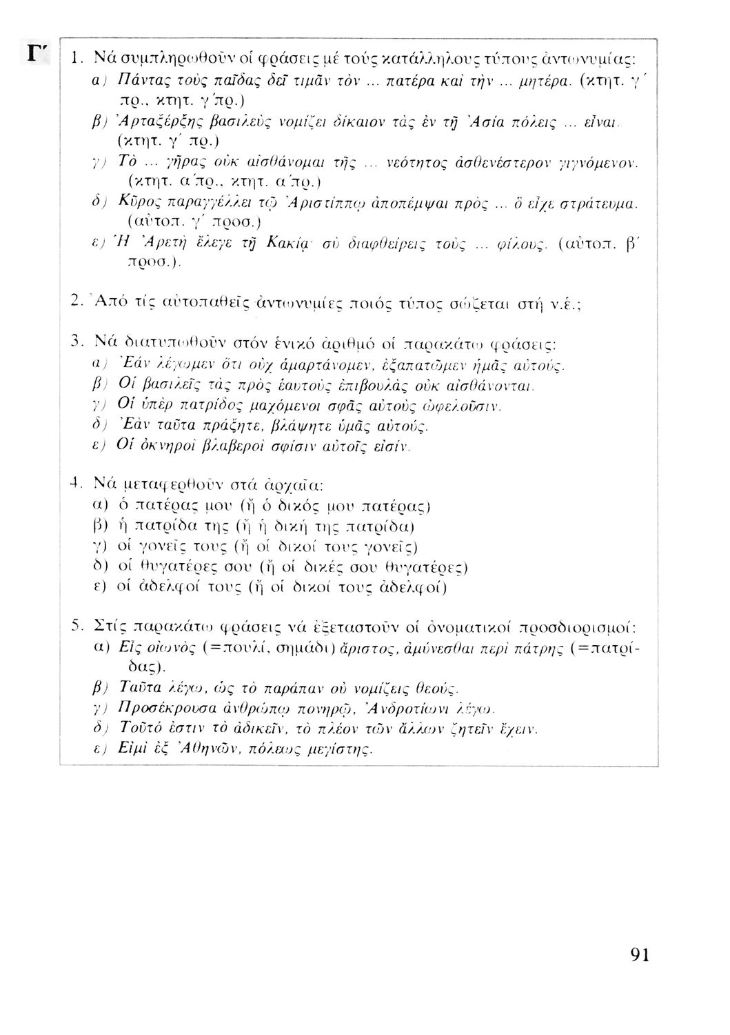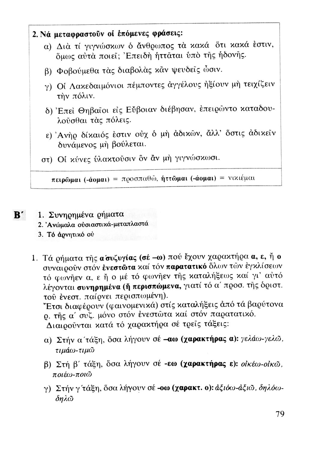 Σχολικό εγχειρίδιο Αρχαίων Ελληνικών για τις Α΄, Β΄ και Γ΄ Λυκείου που εξετάζει τα μέρη του λόγου και την σύνταξή τους.