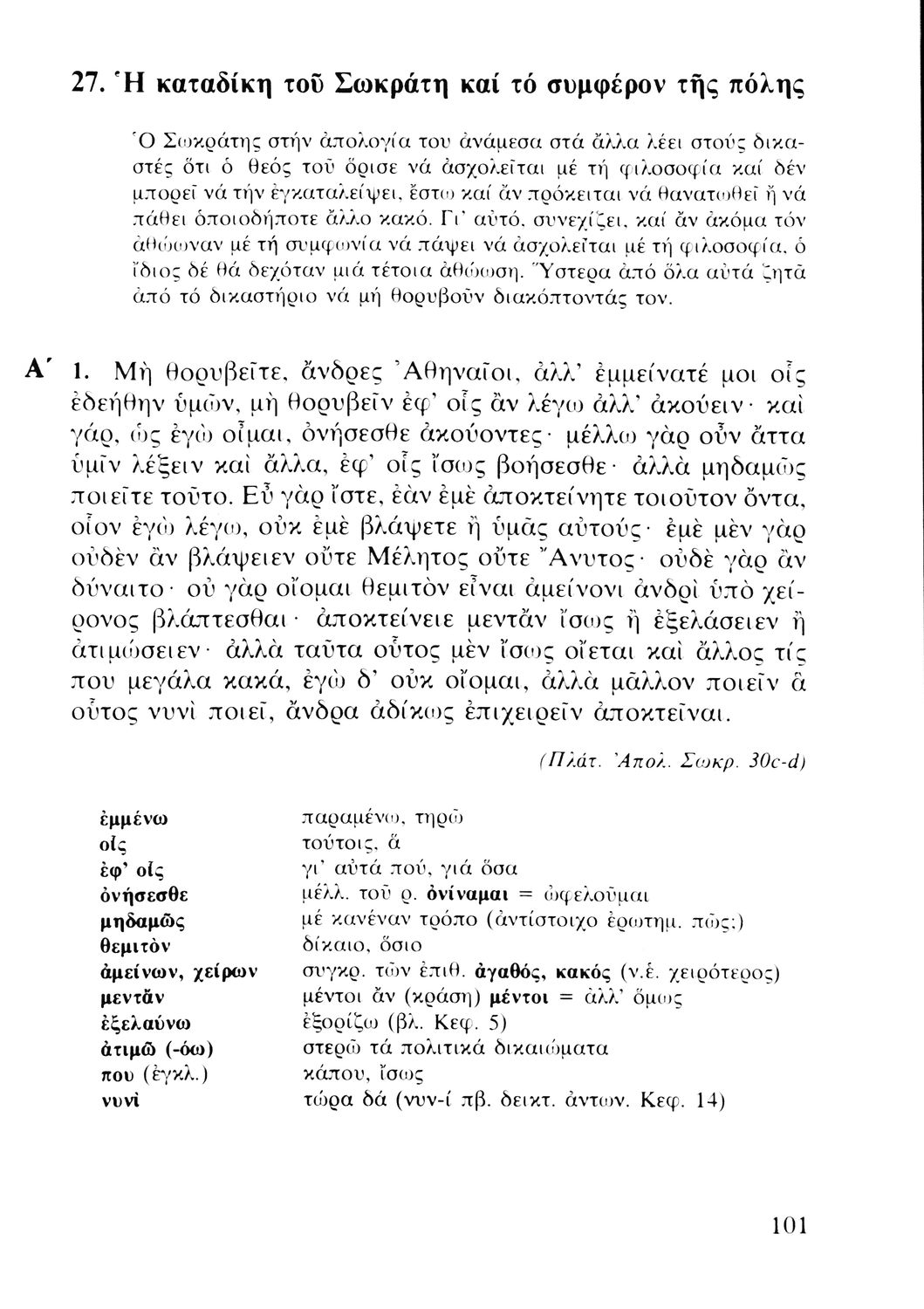 Σχολικό εγχειρίδιο Αρχαίων Ελληνικών Α' Λυκείου που περιλαμβάνει αποσπάσματα από κείμενα αρχαίων Ελλήνων συγγραφέων και γραμματικές, συντακτικές και ερμηνευτικές σημειώσεις. Περιέχει και ασκήσεις γραμματικής.