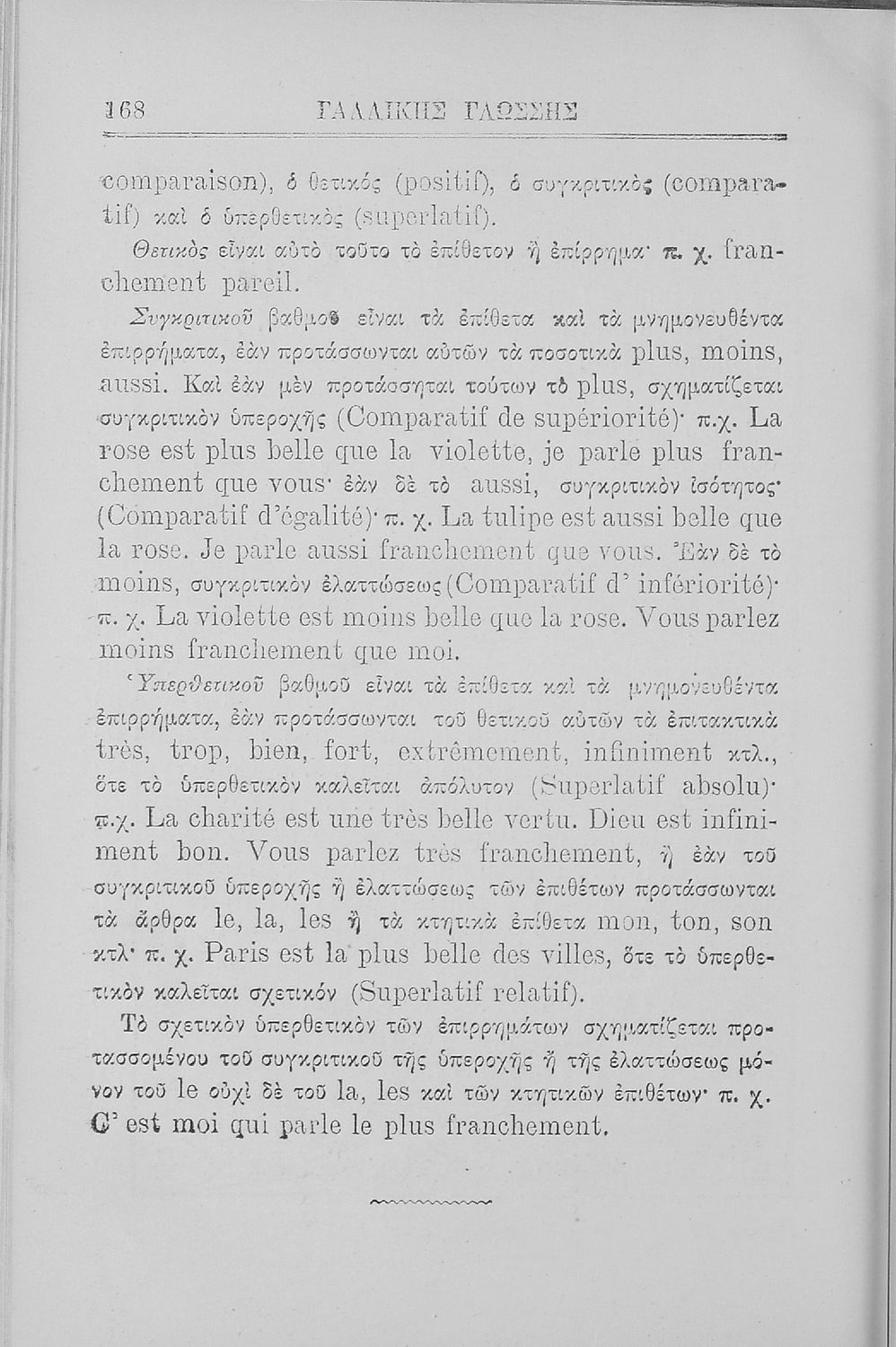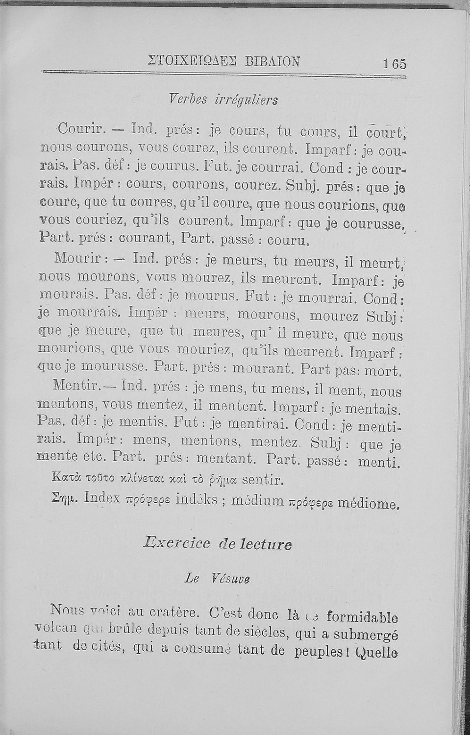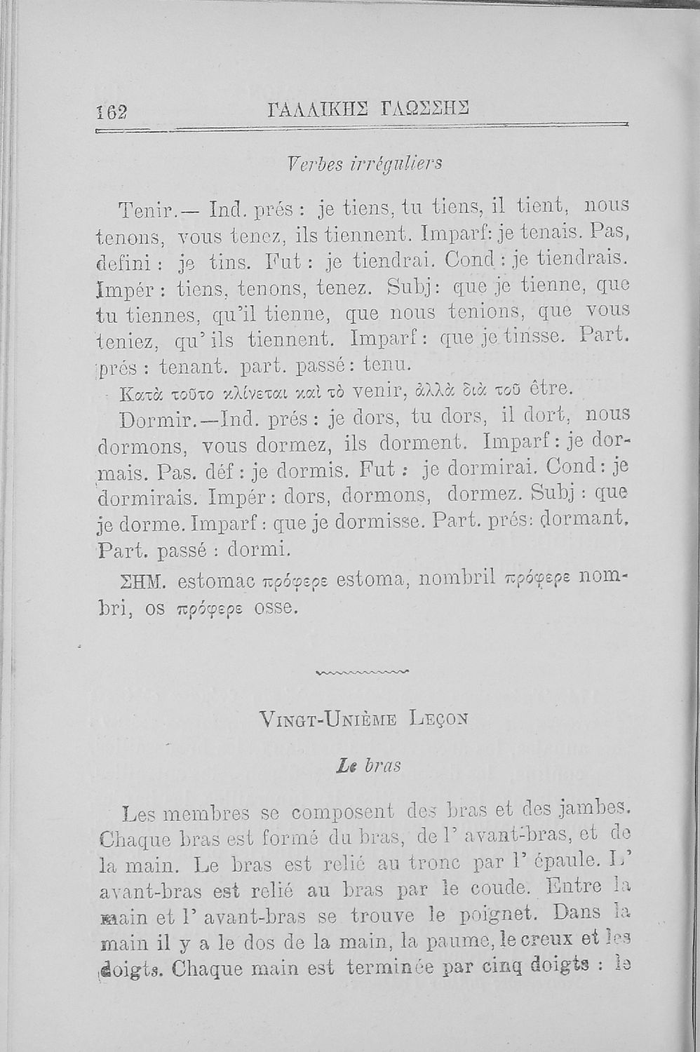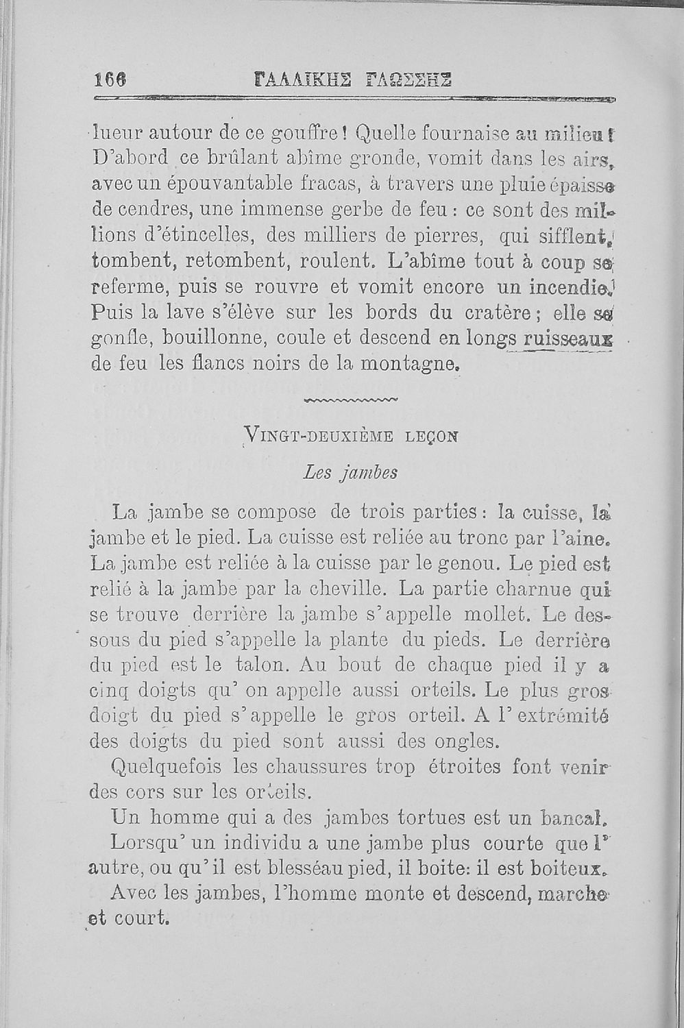 Σχολικό εγχειρίδιο Γαλλικών για τις Β΄ και Γ' Ελληνικού Σχολείου, Αστικού Σχολείου και Παρθεναγωγείου που περιλαμβάνει κείμενα, κανόνες γραμματικής και συντακτικού, και λεξιλογικά και πραγματολογικά σχόλια.
