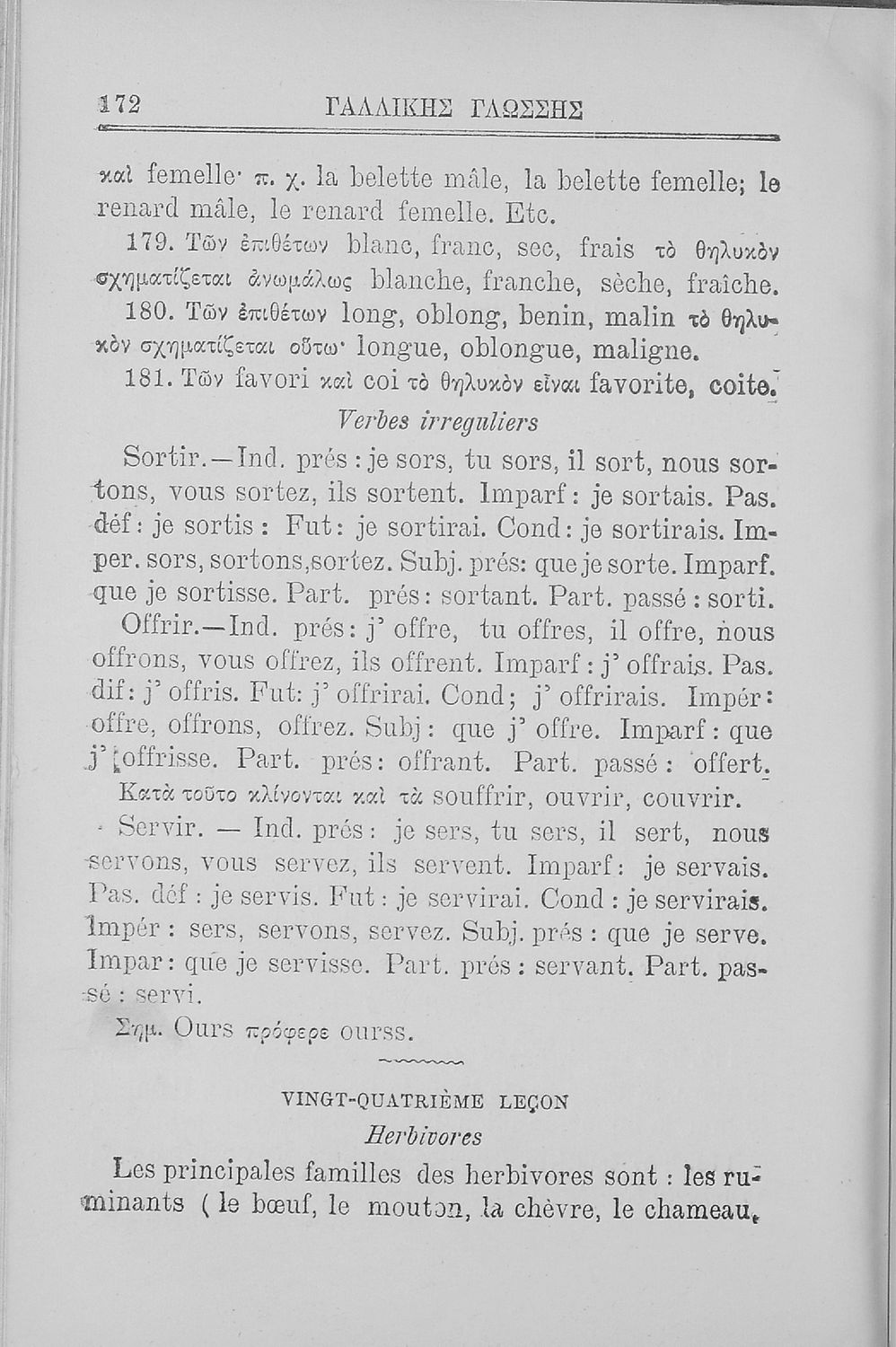 Σχολικό εγχειρίδιο Γαλλικών για τις Β΄ και Γ' Ελληνικού Σχολείου, Αστικού Σχολείου και Παρθεναγωγείου που περιλαμβάνει κείμενα, κανόνες γραμματικής και συντακτικού, λεξιλογικά και πραγματολογικά σχόλια.