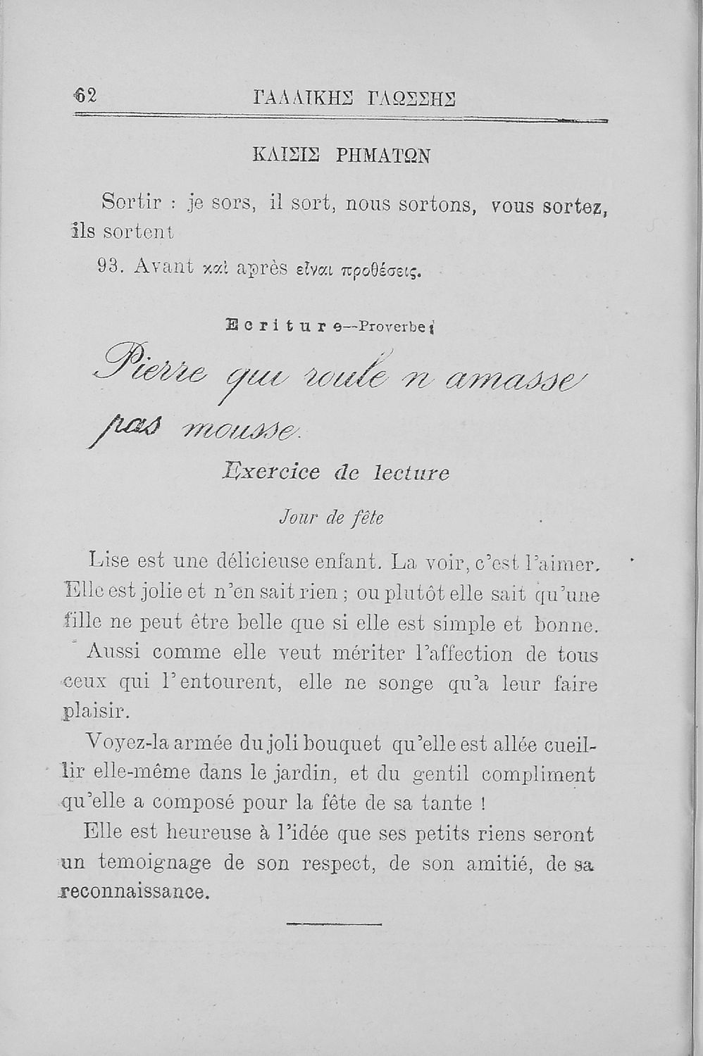 Σχολικό εγχειρίδιο Γαλλικών που περιλαμβάνει 54 κείμενα για τη διδασκαλία των γραμματικών και συντακτικών φαινομένων και της ορθογραφίας, λεξιλόγιο και παράρτημα με τους κανόνες συλλαβισμού.