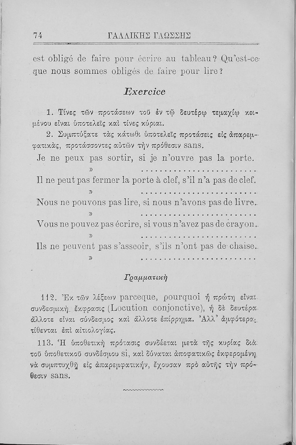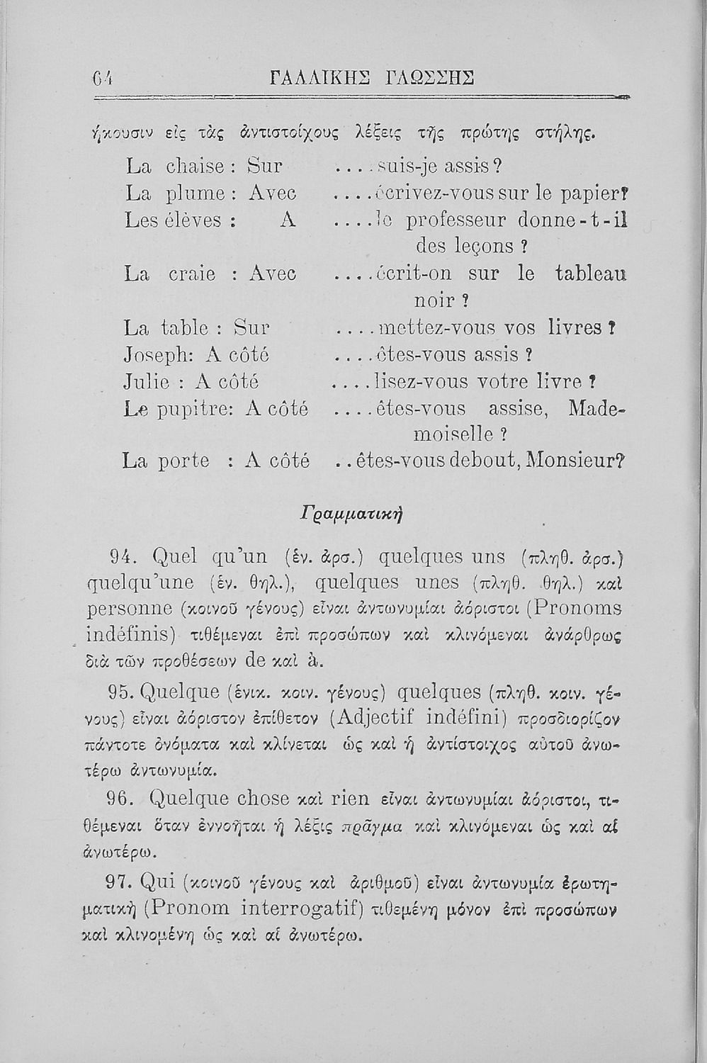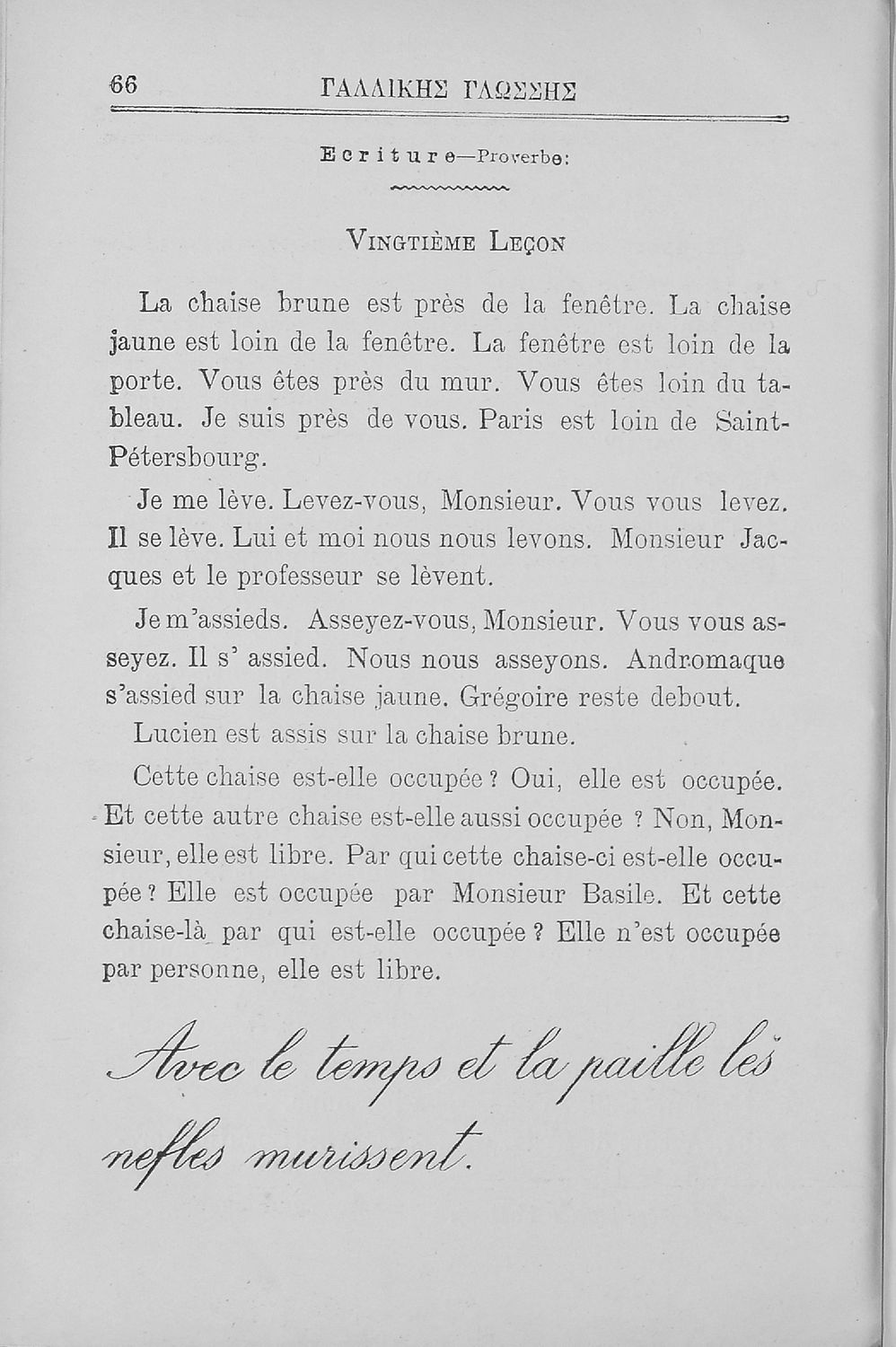 Σχολικό εγχειρίδιο Γαλλικών για τις Β΄ και Γ' Ελληνικού Σχολείου, Αστικού Σχολείου και Παρθεναγωγείου που περιλαμβάνει κείμενα, κανόνες γραμματικής και συντακτικού, λεξιλογικά και πραγματολογικά σχόλια.