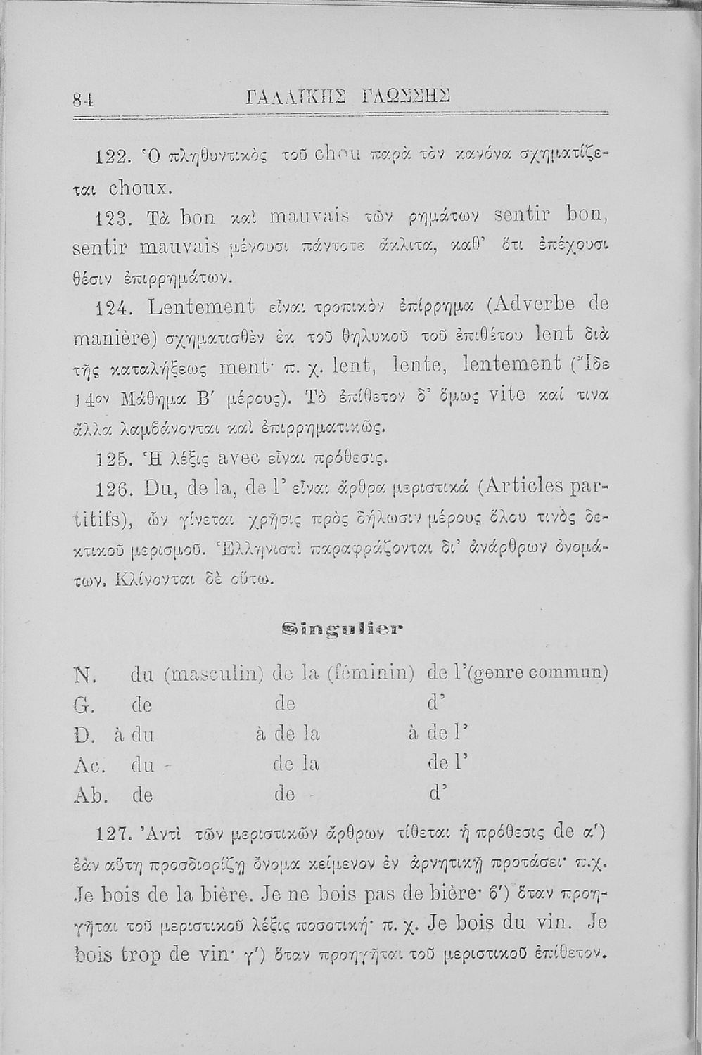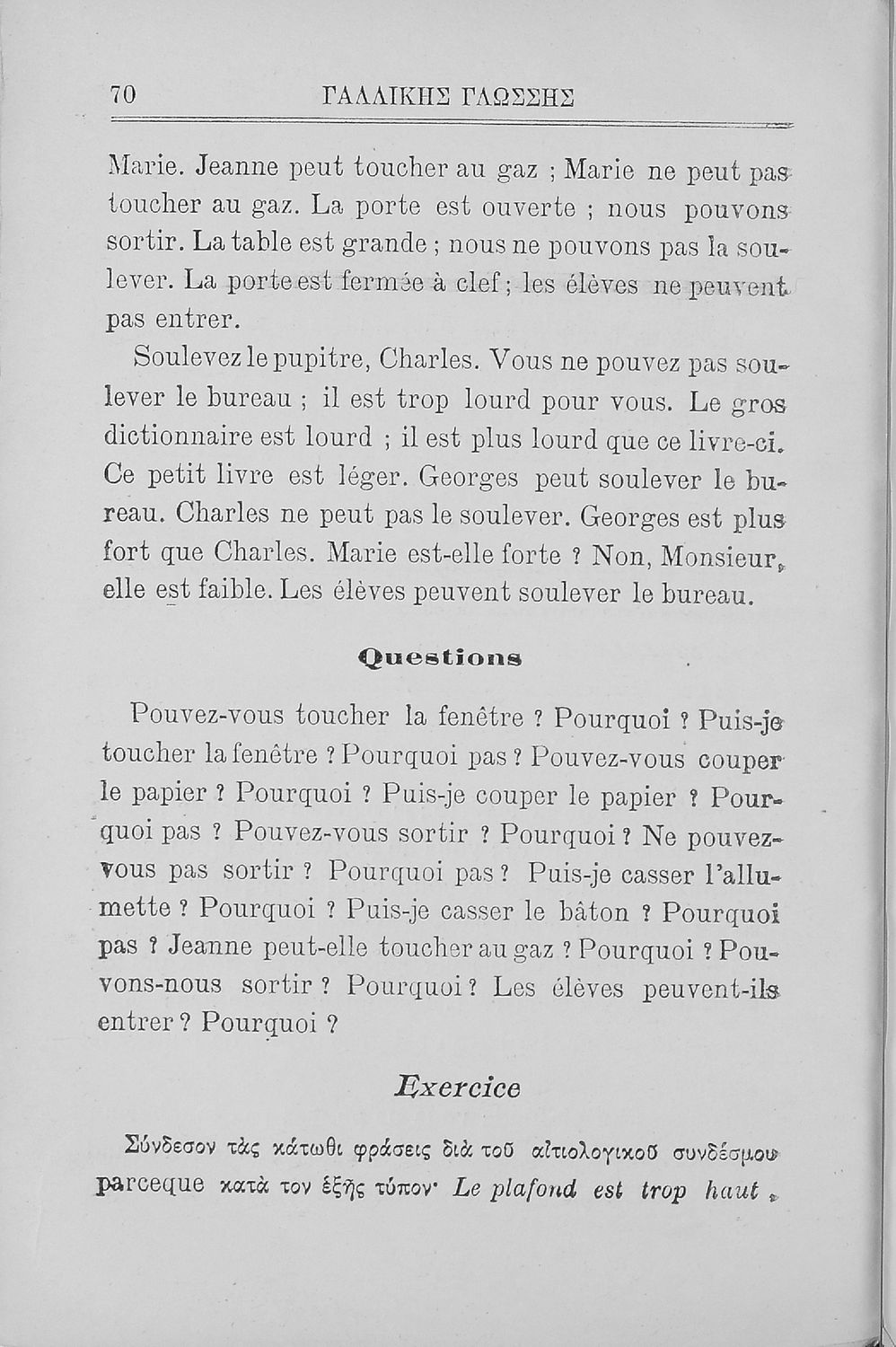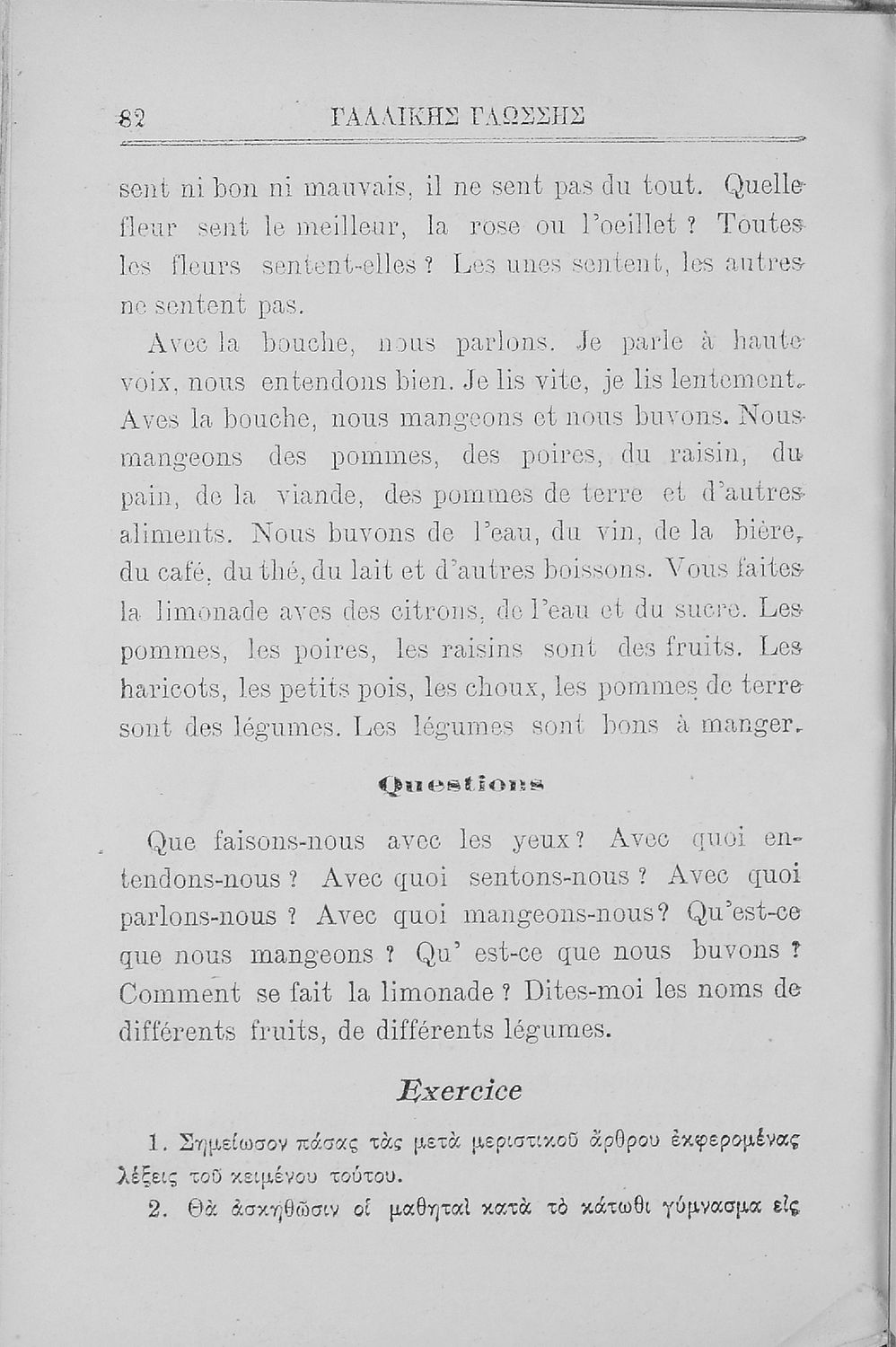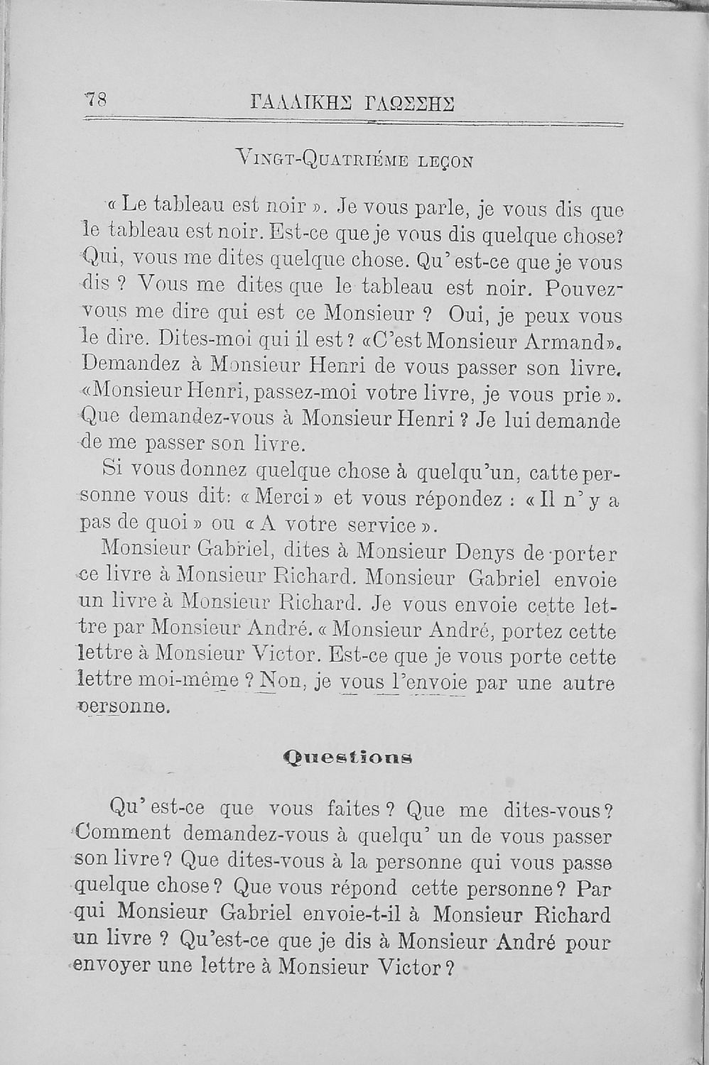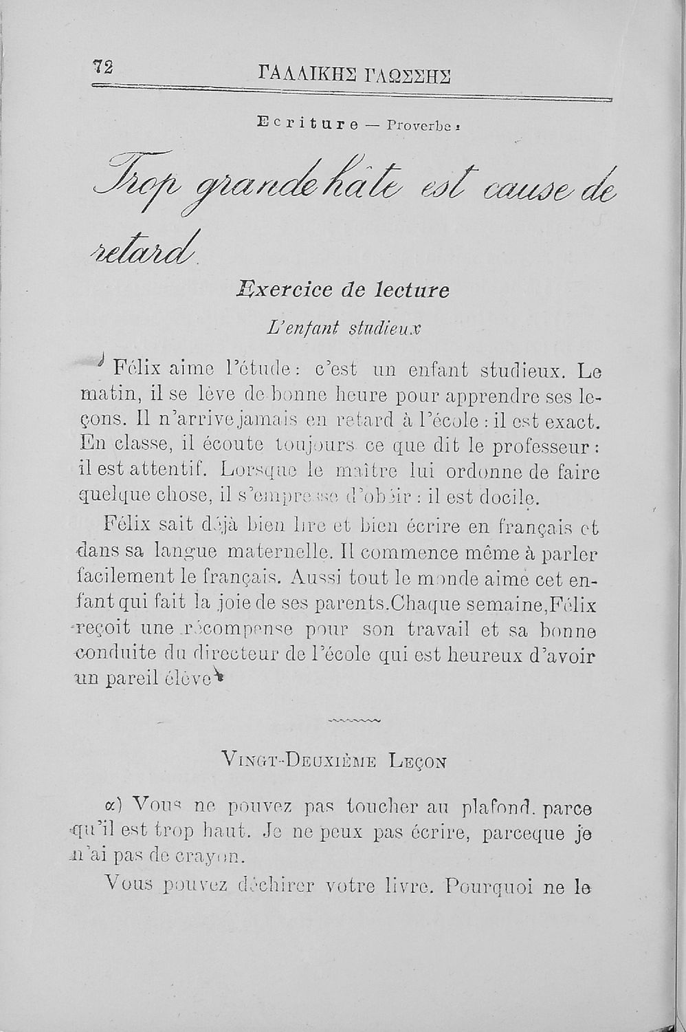 Σχολικό εγχειρίδιο Γαλλικών για τις Β΄ και Γ' Ελληνικού Σχολείου, Αστικού Σχολείου και Παρθεναγωγείου που περιλαμβάνει κείμενα, κανόνες γραμματικής και συντακτικού, και λεξιλογικά και πραγματολογικά σχόλια.