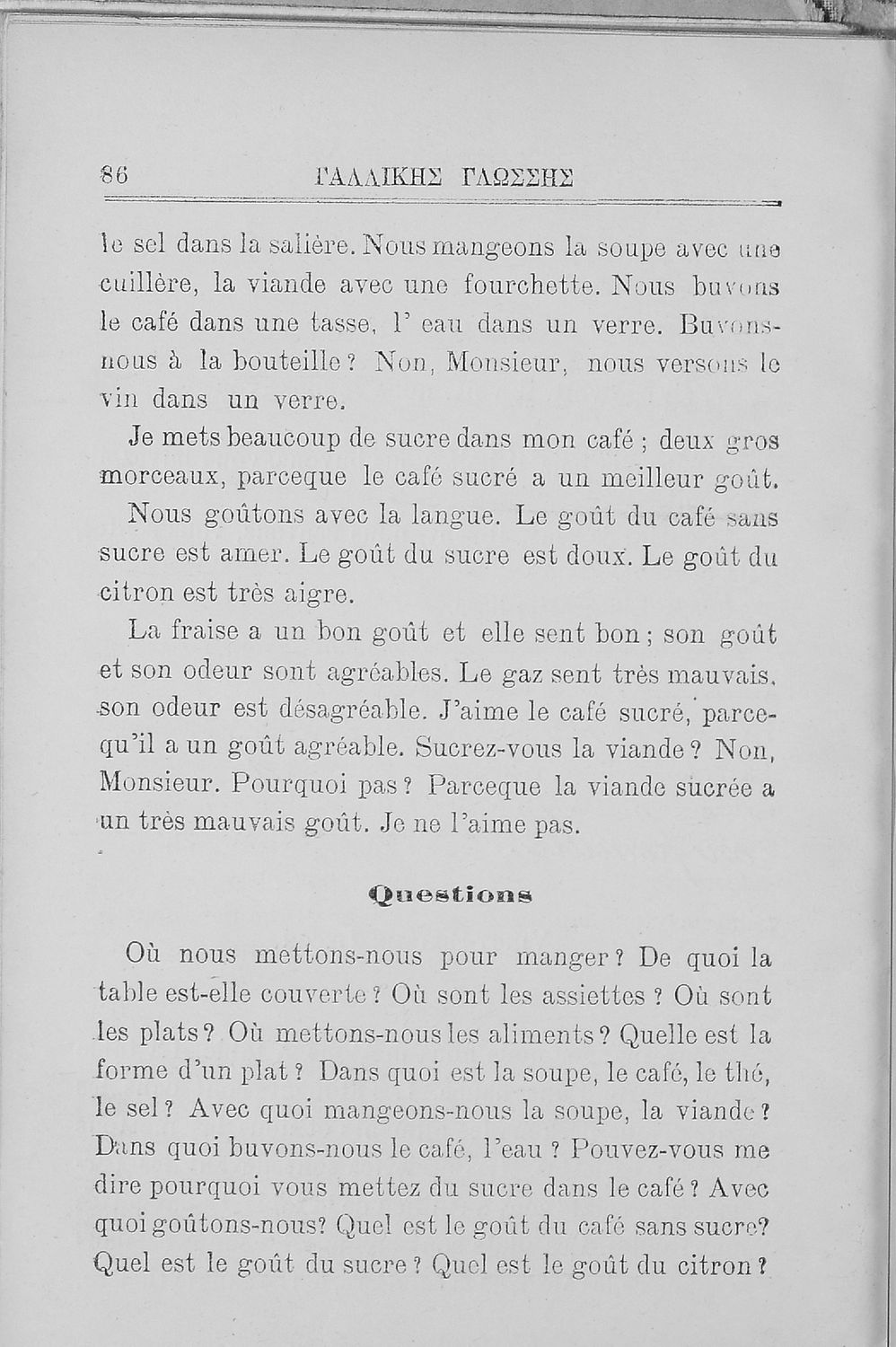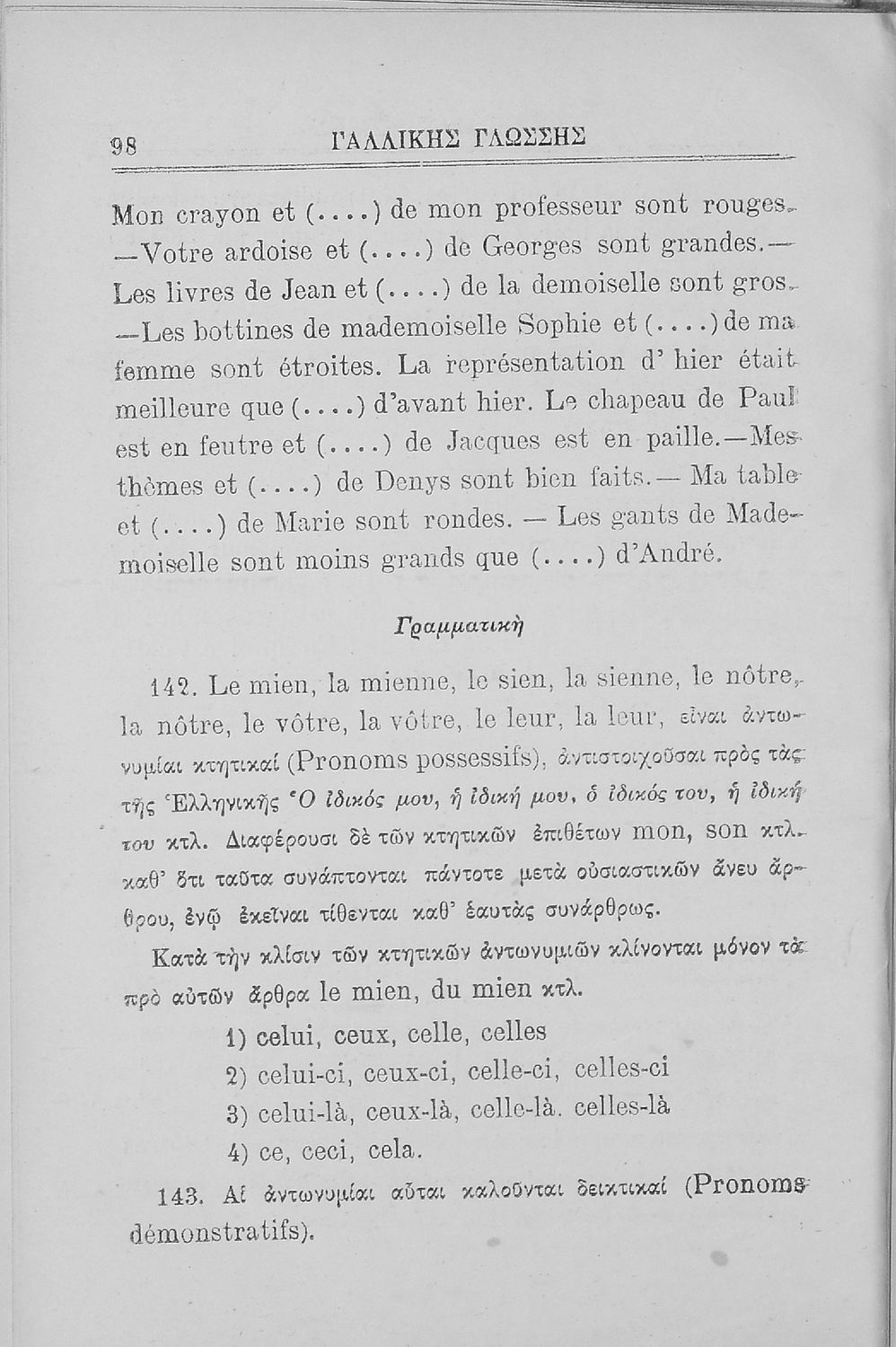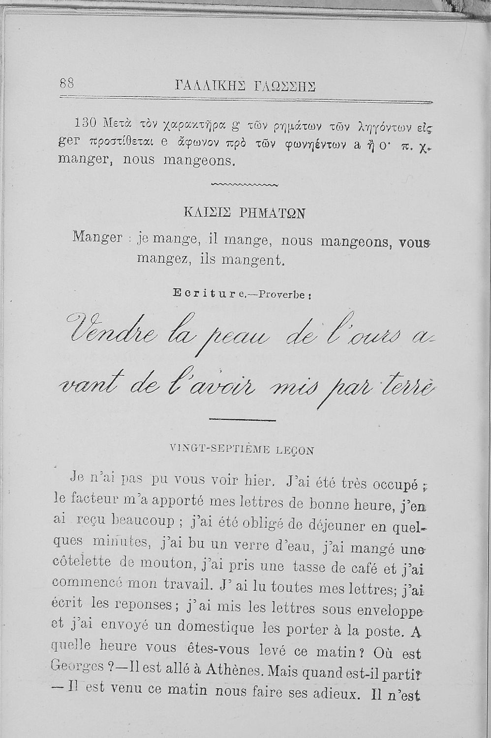 Σχολικό εγχειρίδιο Γαλλικών για τις Β΄ και Γ' Ελληνικού Σχολείου, Αστικού Σχολείου και Παρθεναγωγείου που περιλαμβάνει κείμενα, κανόνες γραμματικής και συντακτικού, και λεξιλογικά και πραγματολογικά σχόλια.