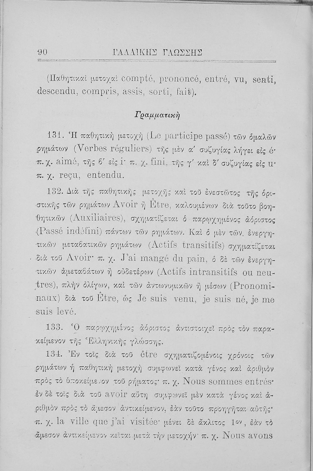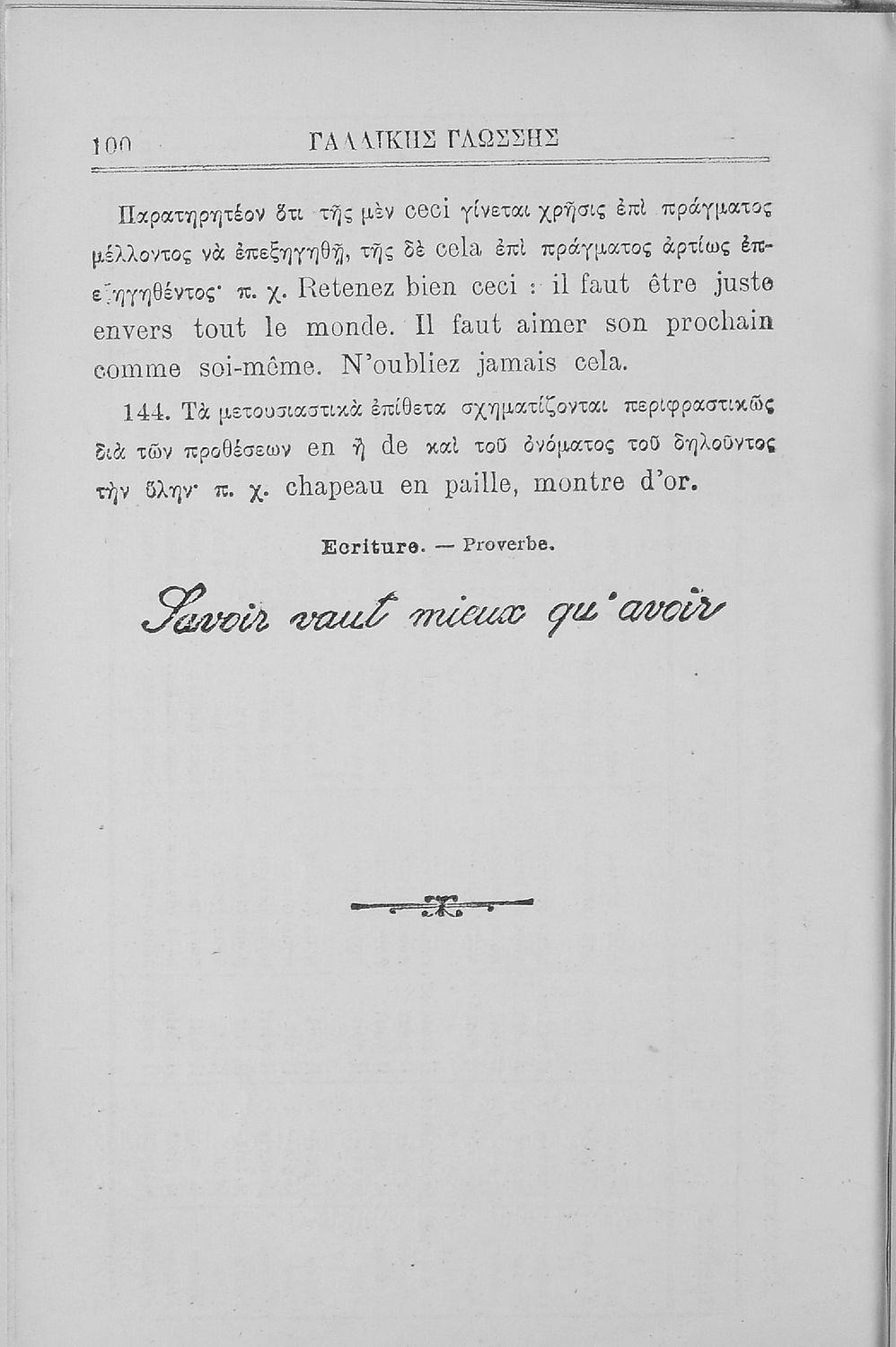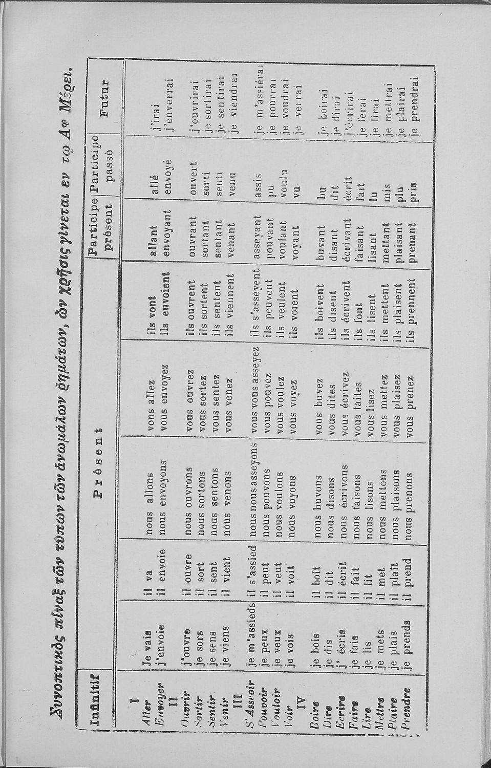 Σχολικό εγχειρίδιο Γαλλικών για τις Β΄ και Γ' Ελληνικού Σχολείου, Αστικού Σχολείου και Παρθεναγωγείου που περιλαμβάνει κείμενα, κανόνες γραμματικής και συντακτικού, και λεξιλογικά και πραγματολογικά σχόλια.