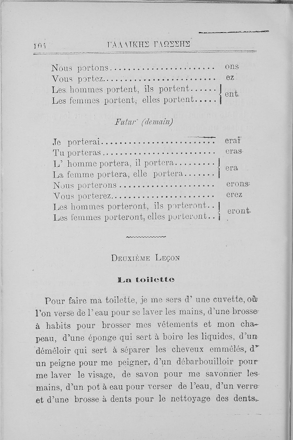 Σχολικό εγχειρίδιο Γαλλικών για τις Β’ και Γ’ Ελληνικού και Αστικού Σχολείου και Παρθεναγωγείου που περιλαμβάνει ασκήσεις προφοράς, συνομιλίας και γραμματικής, και λεξιλόγιο.