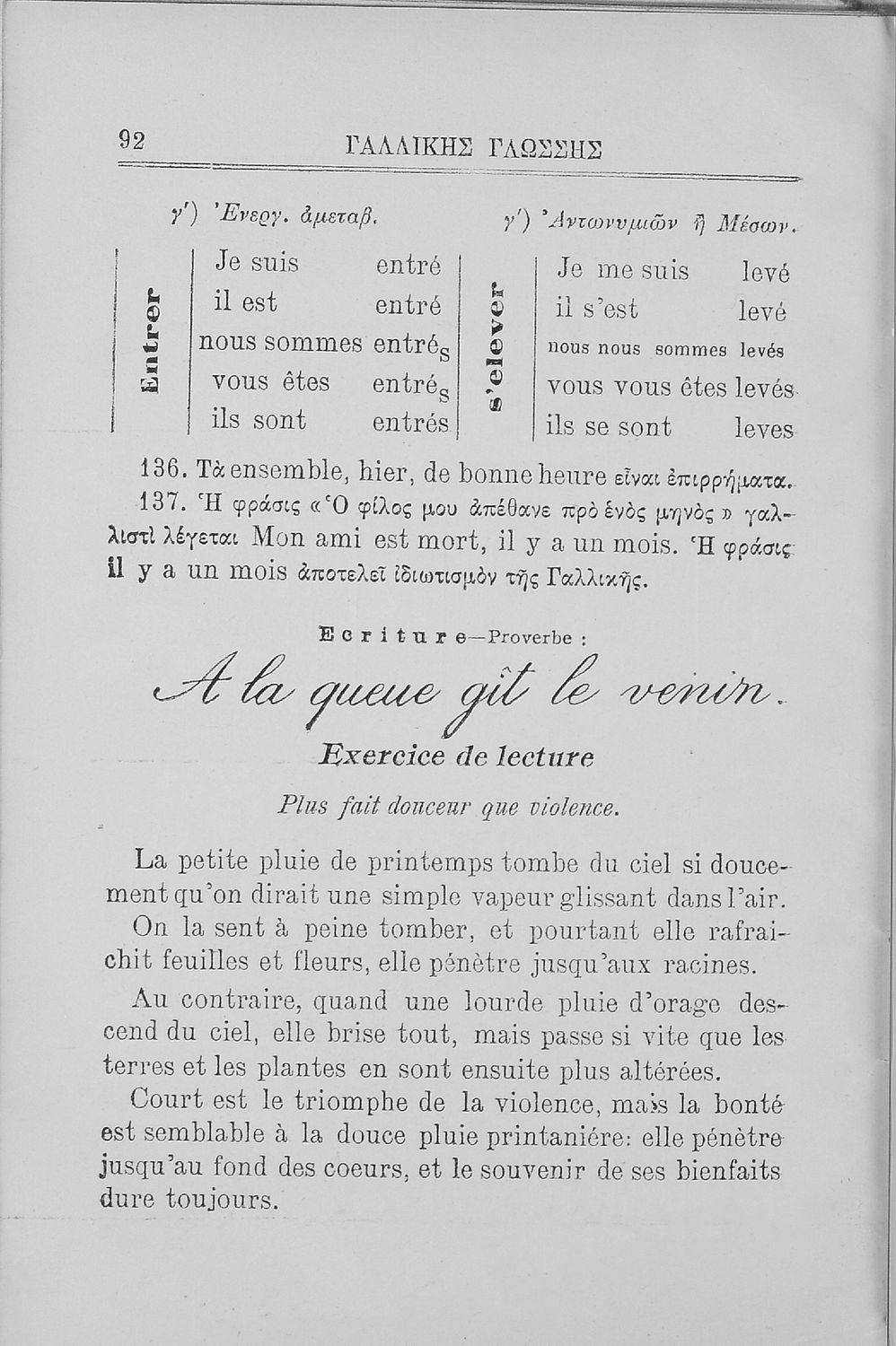 Σχολικό εγχειρίδιο Γαλλικών που περιλαμβάνει 54 κείμενα για τη διδασκαλία των γραμματικών και συντακτικών φαινομένων και της ορθογραφίας, λεξιλόγιο και παράρτημα με τους κανόνες συλλαβισμού.
