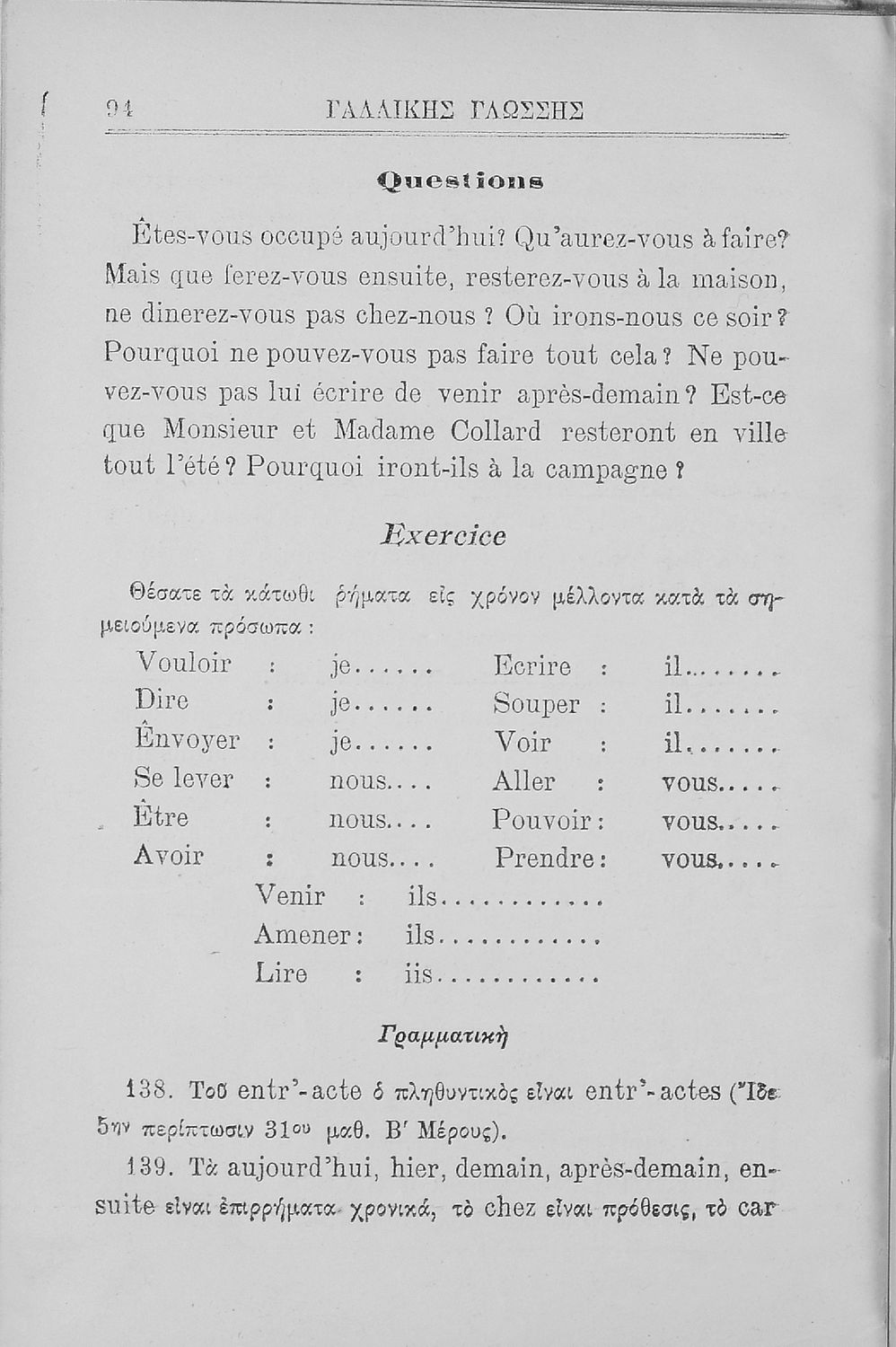 Σχολικό εγχειρίδιο Γαλλικών των Γυμνασίων, Αστικών Σχολείων θηλέων και Διδασκαλείων Δημοτικής Εκπαίδευσης. Κείμενα, ποιήματα, από εποχές και τον κοινωνικό και οικογενειακό βίο, τα οποία συνοδεύονται ασκήσεις ...
