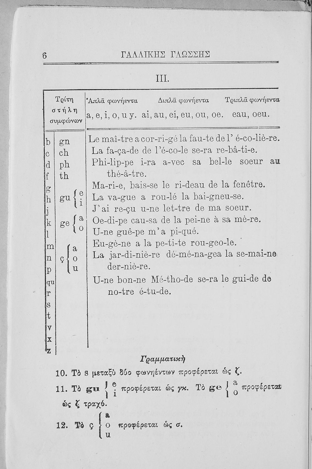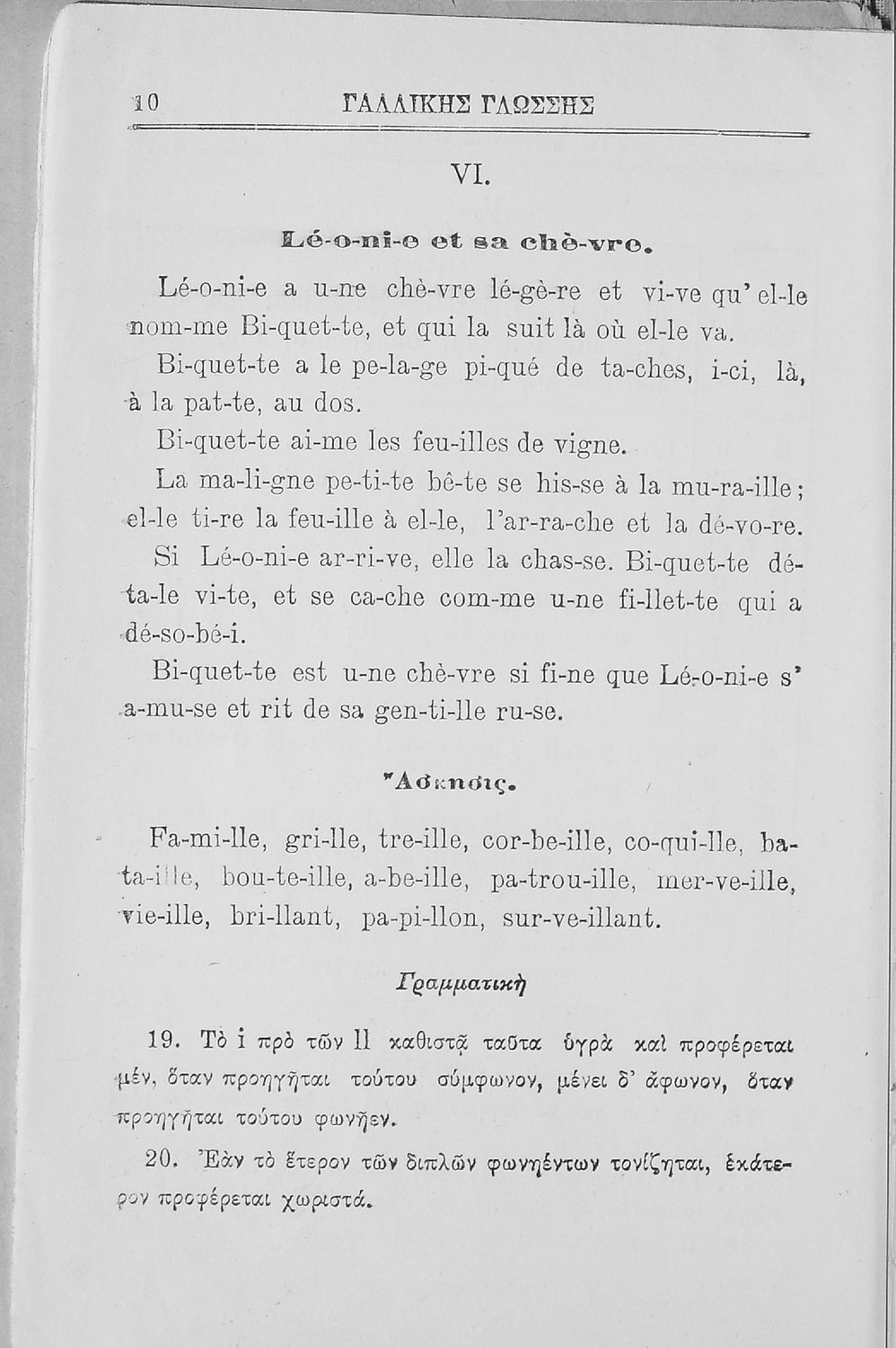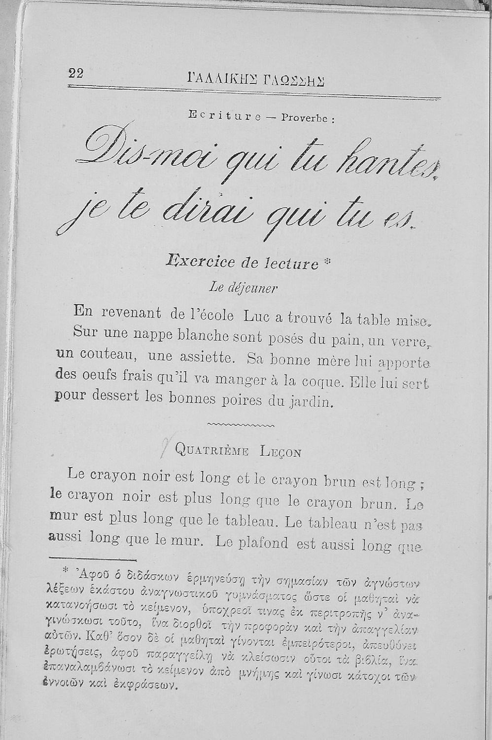 Σχολικό εγχειρίδιο Γαλλικών για τις Β΄ και Γ' Ελληνικού Σχολείου, Αστικού Σχολείου και Παρθεναγωγείου που περιλαμβάνει κείμενα, κανόνες γραμματικής και συντακτικού, και λεξιλογικά και πραγματολογικά σχόλια.