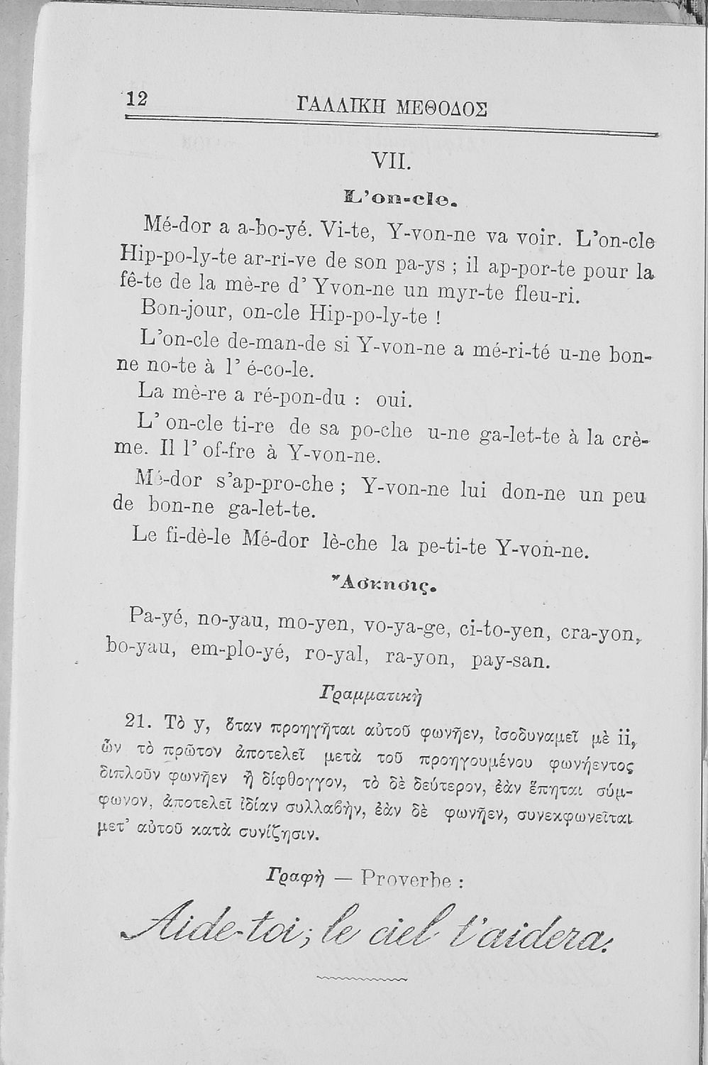 Σχολικό εγχειρίδιο Γαλλικών που περιλαμβάνει 54 κείμενα για τη διδασκαλία των γραμματικών και συντακτικών φαινομένων και της ορθογραφίας, λεξιλόγιο και παράρτημα με τους κανόνες συλλαβισμού.