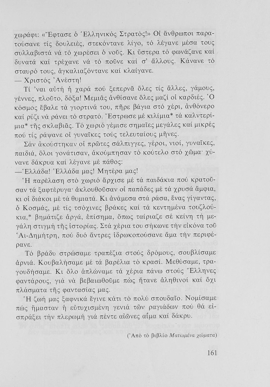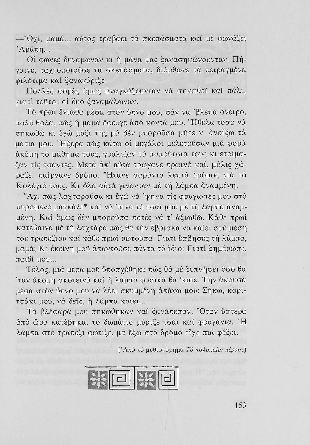 Αναγνωστικό για τις Ε' και ΣΤ΄ Δημοτικού που περιλαμβάνει πεζά και ποιήματα της Νέας Ελληνικής Λογοτεχνίας εμπνευσμένα από την καθημερινότητα των παιδιών και των οικογενειών τους, την ελληνική ιστορία, τις οικογενειακές στιγμές και εορτές, το παιχνίδι και την εθνική παράδοση, και τα δημοτικά και ακριτικά τραγούδια. Περιέχει και 5 κείμενα γραμμένα στην καθαρεύουσα με θέματα από τον κοινωνικό και εθνικό βίο, και ερμηνευτικό λεξιλόγιο.. Το βιβλίο είναι αφιερωμένο στη μνήμη της Πηνελόπης Δέλτα.