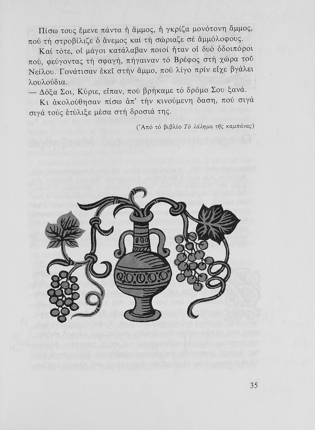 Αναγνωστικό για τις Ε' και ΣΤ΄ Δημοτικού που περιλαμβάνει πεζά και ποιήματα της Νέας Ελληνικής Λογοτεχνίας εμπνευσμένα από την καθημερινότητα των παιδιών και των οικογενειών τους, την ελληνική ιστορία, τις οικογενειακές στιγμές και εορτές, το παιχνίδι και την εθνική παράδοση, και τα δημοτικά και ακριτικά τραγούδια. Περιέχει και 5 κείμενα γραμμένα στην καθαρεύουσα με θέματα από τον κοινωνικό και εθνικό βίο, και ερμηνευτικό λεξιλόγιο.. Το βιβλίο είναι αφιερωμένο στη μνήμη της Πηνελόπης Δέλτα.