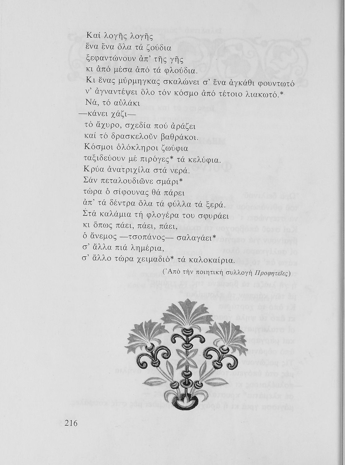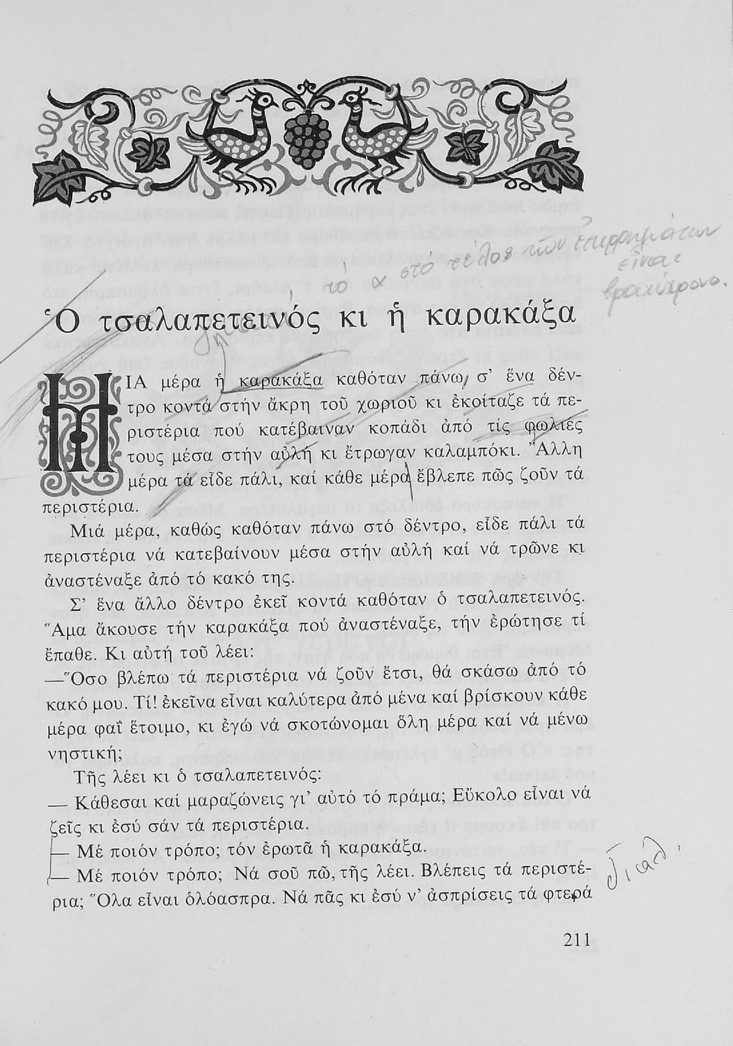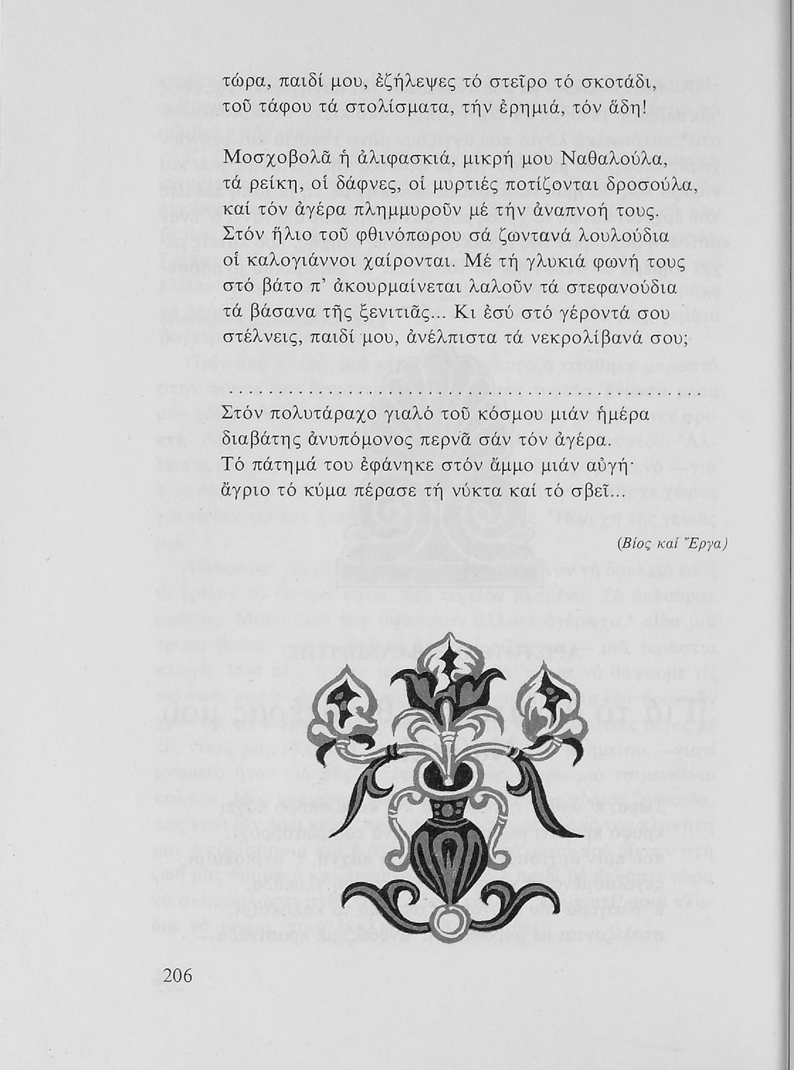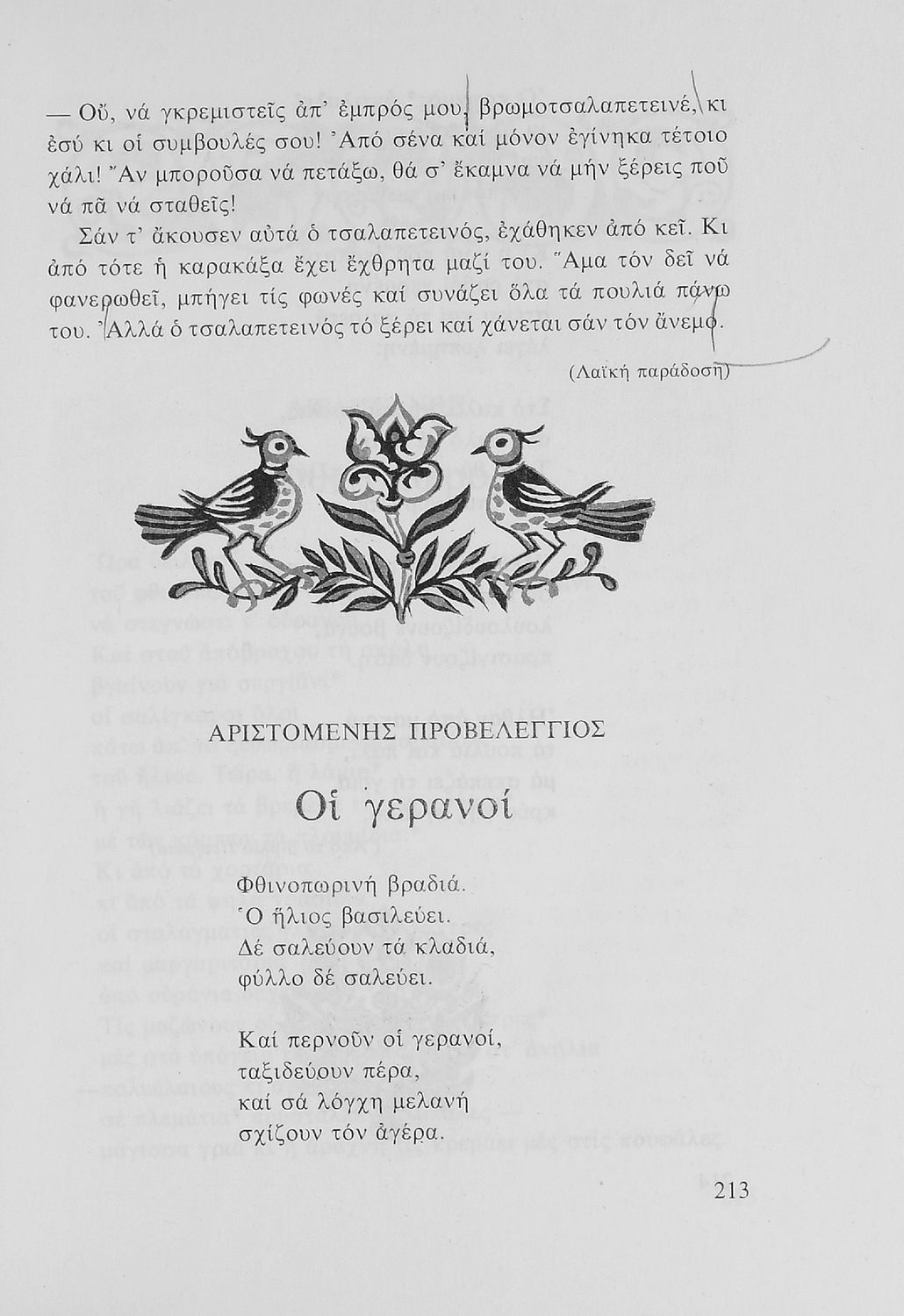 Αναγνωστικό για τις Ε' και ΣΤ΄ Δημοτικού που περιλαμβάνει πεζά και ποιήματα της Νέας Ελληνικής Λογοτεχνίας εμπνευσμένα από την καθημερινότητα των παιδιών και των οικογενειών τους, την ελληνική ιστορία, τις οικογενειακές στιγμές και εορτές, το παιχνίδι και την εθνική παράδοση, και τα δημοτικά και ακριτικά τραγούδια. Περιέχει και 5 κείμενα γραμμένα στην καθαρεύουσα με θέματα από τον κοινωνικό και εθνικό βίο, και ερμηνευτικό λεξιλόγιο.. Το βιβλίο είναι αφιερωμένο στη μνήμη της Πηνελόπης Δέλτα.