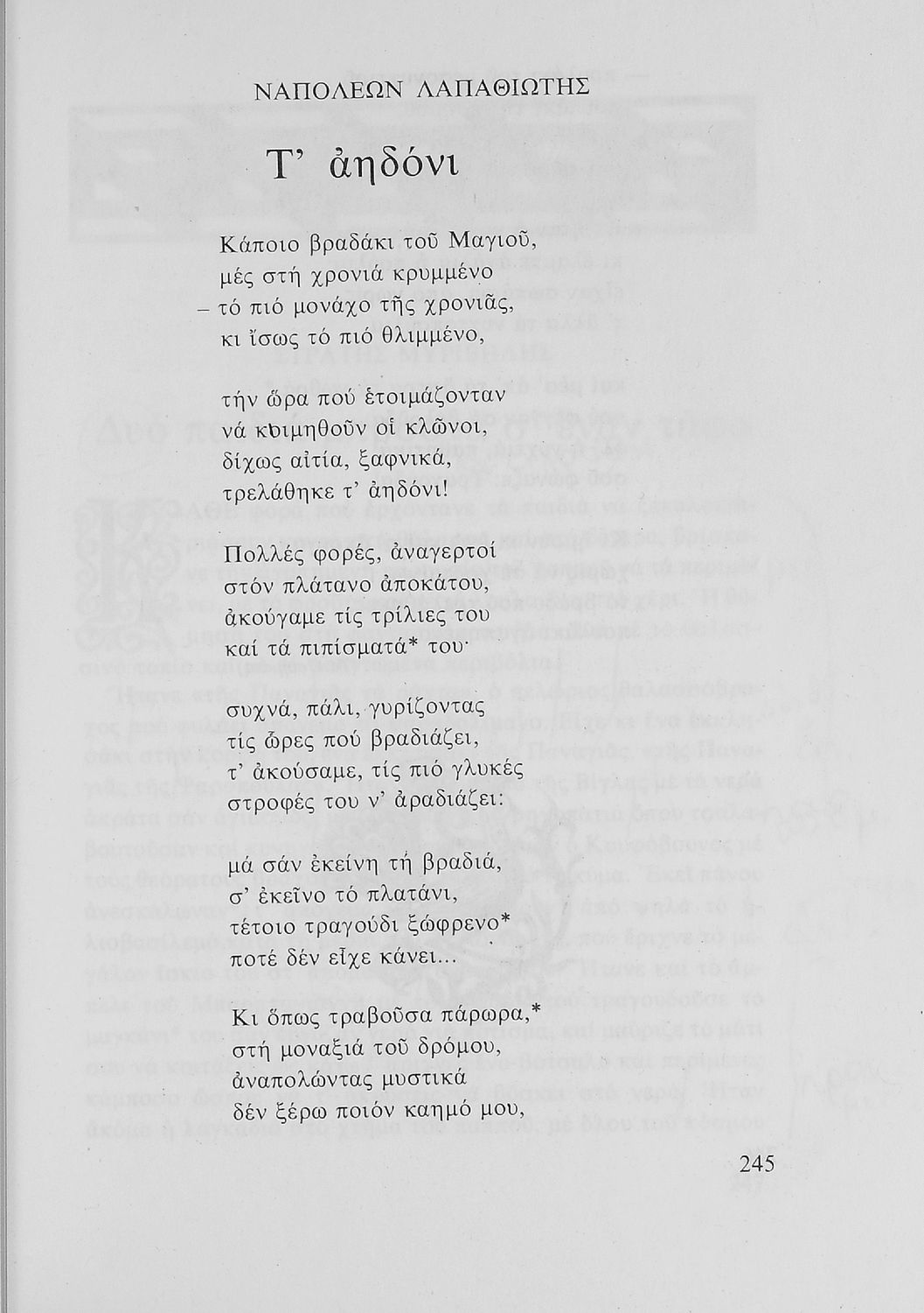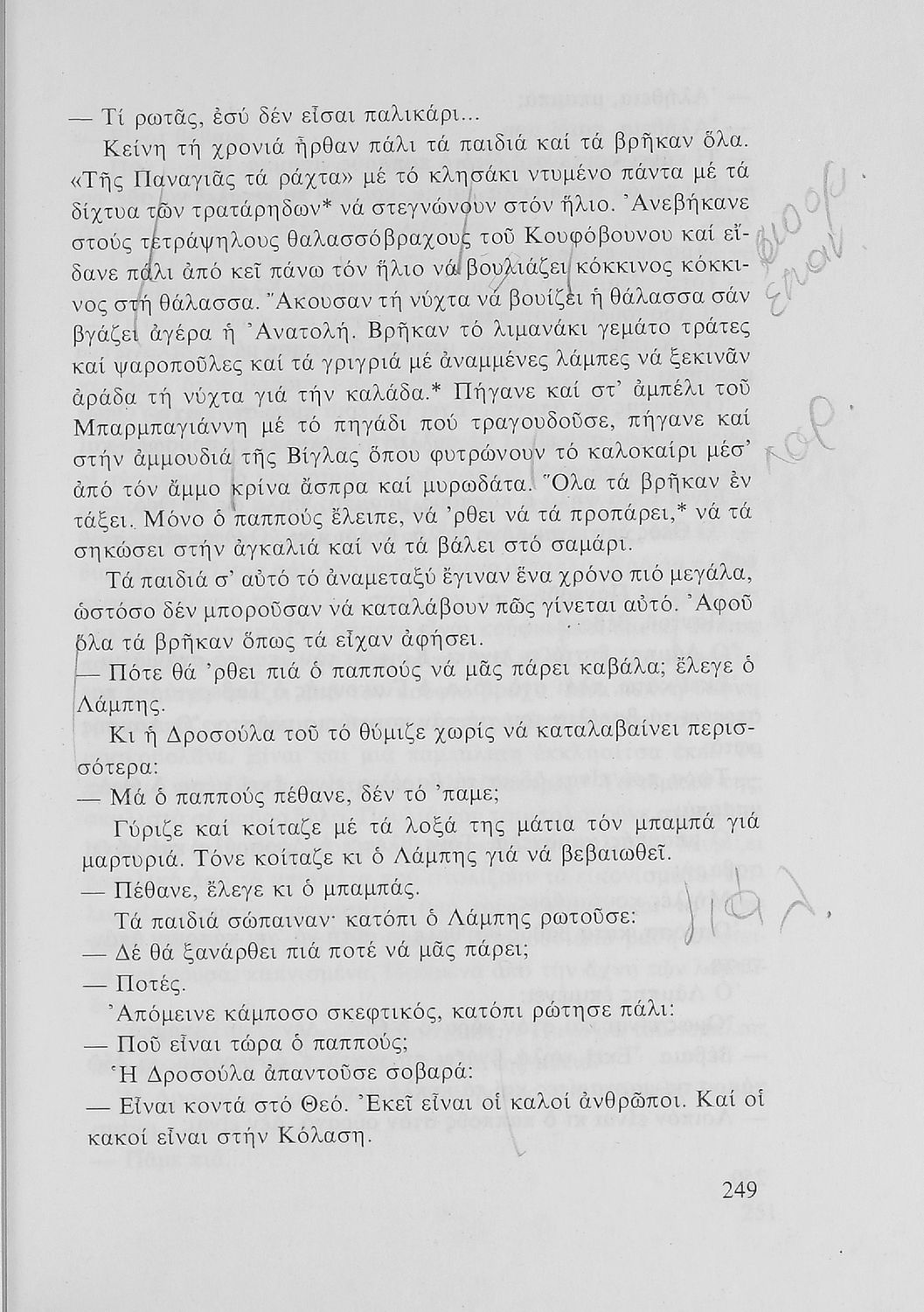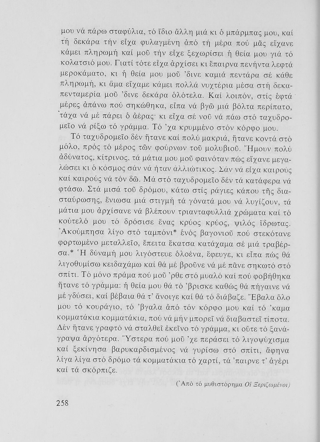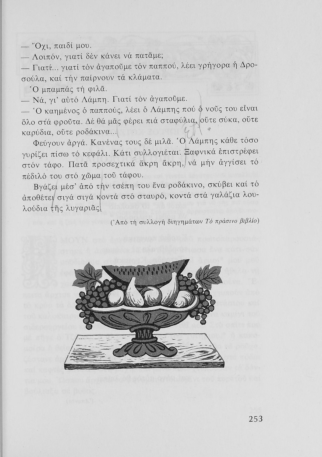 Αναγνωστικό για τις Ε' και ΣΤ΄ Δημοτικού που περιλαμβάνει πεζά και ποιήματα της Νέας Ελληνικής Λογοτεχνίας εμπνευσμένα από την καθημερινότητα των παιδιών και των οικογενειών τους, την ελληνική ιστορία, τις οικογενειακές στιγμές και εορτές, το παιχνίδι και την εθνική παράδοση, και τα δημοτικά και ακριτικά τραγούδια. Περιέχει και 5 κείμενα γραμμένα στην καθαρεύουσα με θέματα από τον κοινωνικό και εθνικό βίο, και ερμηνευτικό λεξιλόγιο.. Το βιβλίο είναι αφιερωμένο στη μνήμη της Πηνελόπης Δέλτα.