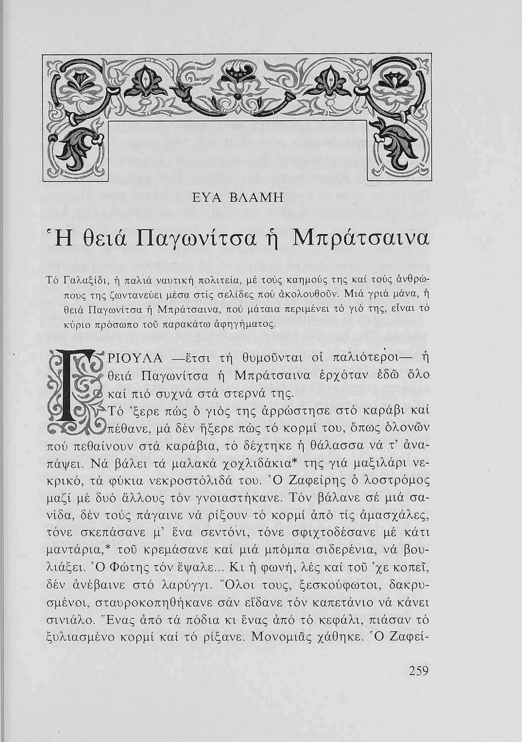Αναγνωστικό για τις Ε' και ΣΤ΄ Δημοτικού που περιλαμβάνει πεζά και ποιήματα της Νέας Ελληνικής Λογοτεχνίας εμπνευσμένα από την καθημερινότητα των παιδιών και των οικογενειών τους, την ελληνική ιστορία, τις οικογενειακές στιγμές και εορτές, το παιχνίδι και την εθνική παράδοση, και τα δημοτικά και ακριτικά τραγούδια. Περιέχει και 5 κείμενα γραμμένα στην καθαρεύουσα με θέματα από τον κοινωνικό και εθνικό βίο, και ερμηνευτικό λεξιλόγιο.. Το βιβλίο είναι αφιερωμένο στη μνήμη της Πηνελόπης Δέλτα.